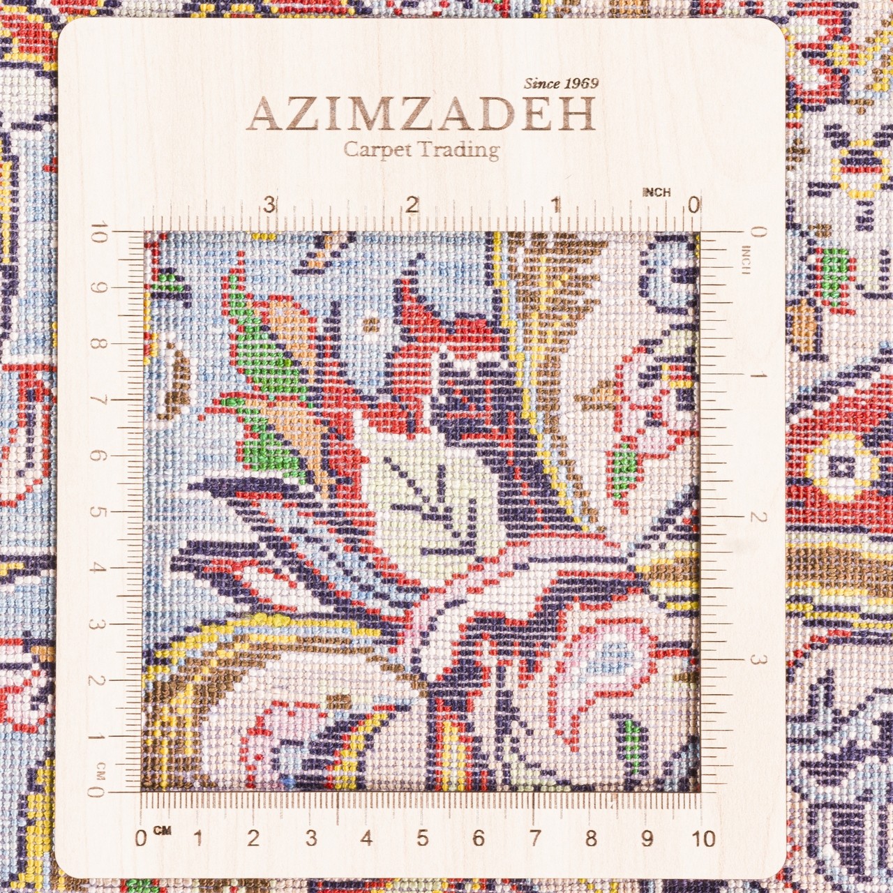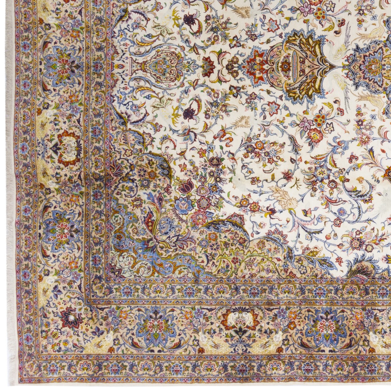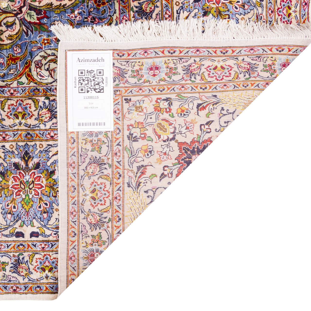 سجادة كاشان عتيقة بقياس 300 × 415 سم (9'10" × 13'7") ومساحة 12.45 م² (134.01 قدم²)، بتصميم مدالية مع أركان وزخارف زهرة الشاه عباسي، ومنسوجة حرير بالكامل. تمنح أجواءً هادئة تشبه حدائق منظّمة بزهور متقنة التفاصيل وتناسق رشيق. بكثافة عُقَد تقارب 5,100 عُقَد/دسم²، تتلألأ المدالية الوسطى كحوضٍ مذهب داخل بستانٍ من زهور حريرية، فيما تحتضنها اللُّجُون الأربع كظلّ الأشجار. يهيّئ اللون الكريمي للأرضية خلفيةً هادئة لظهور الزخارف، وتقوم الحاشية بلونٍ ترابي ذهبي بتأطير المشهد بوقارٍ متوازن.