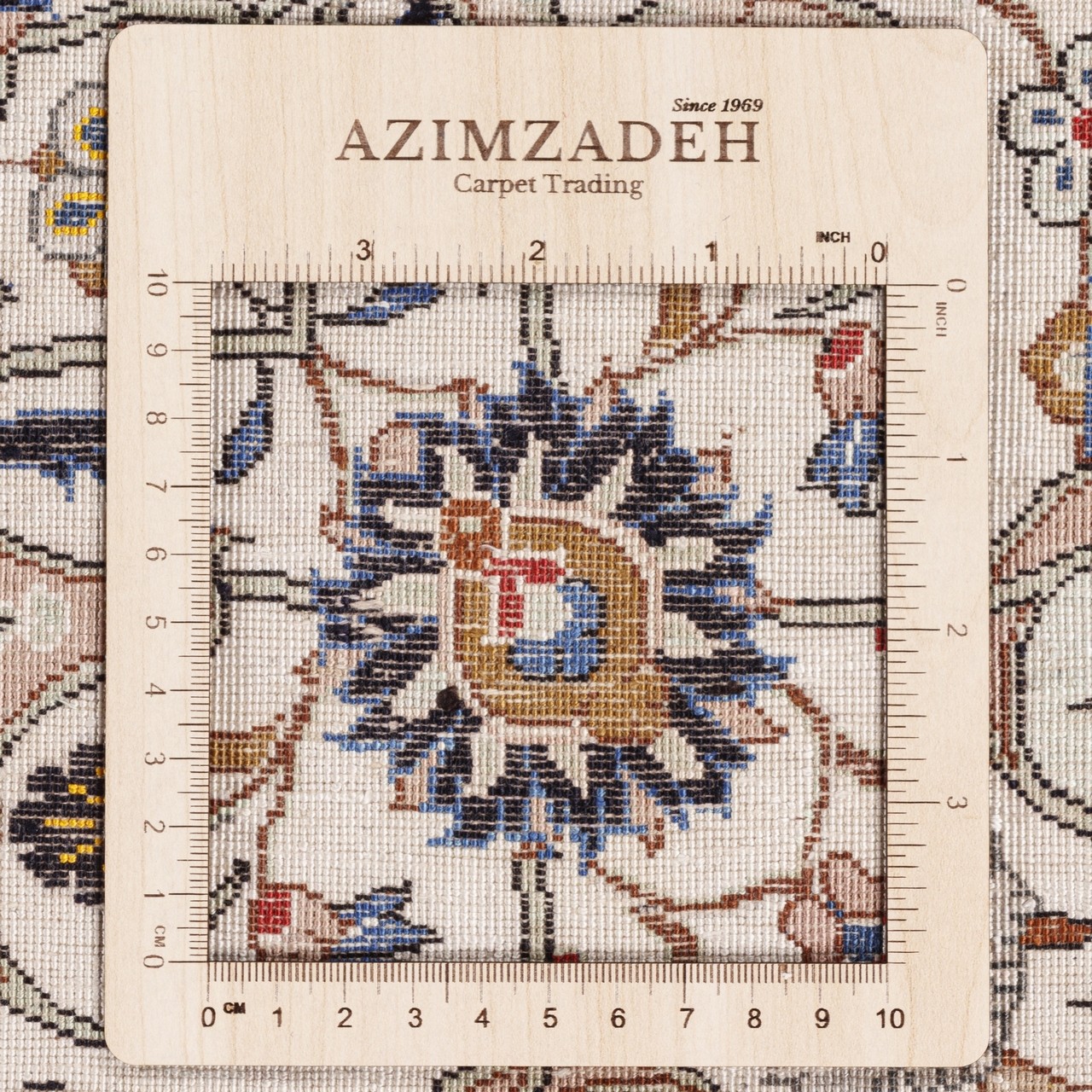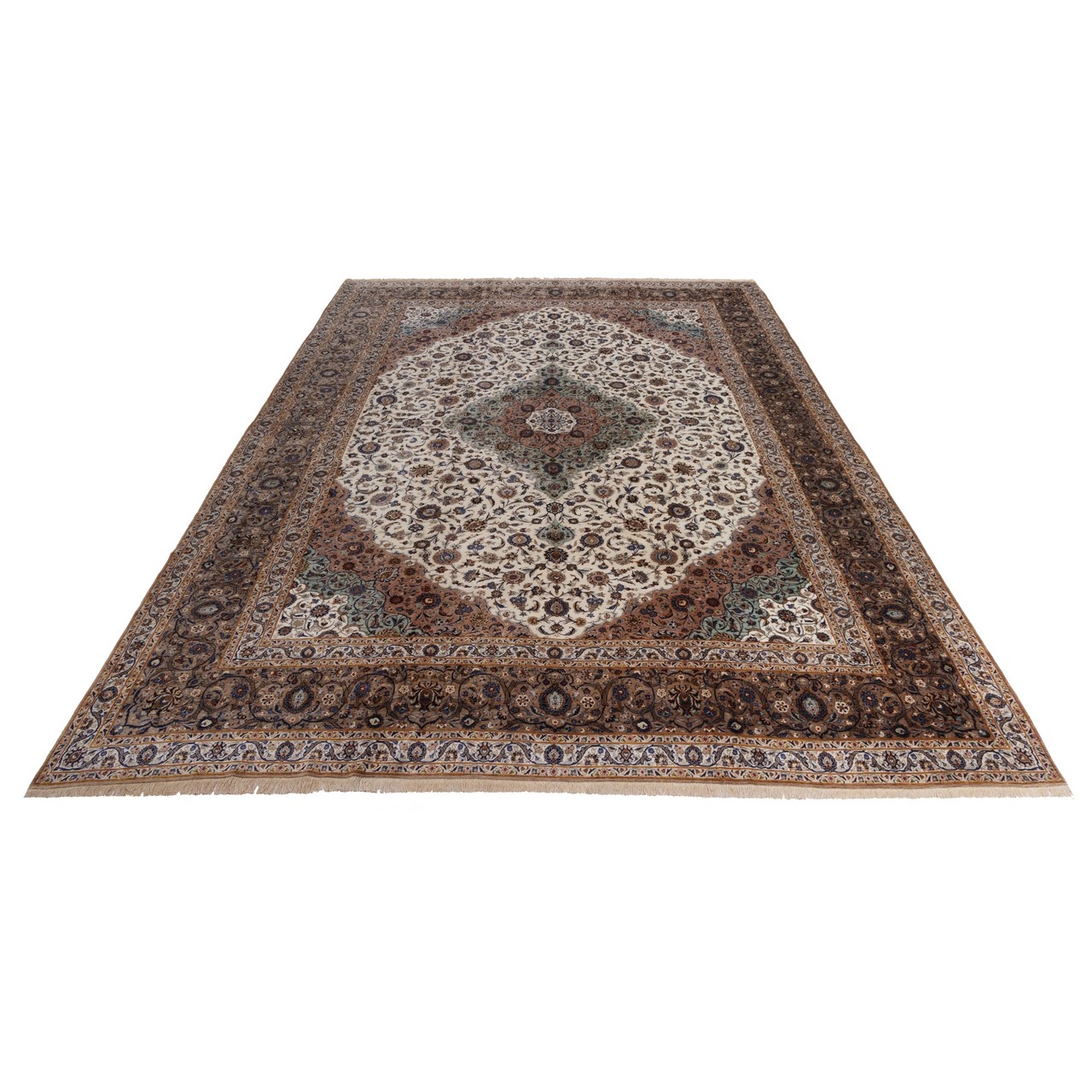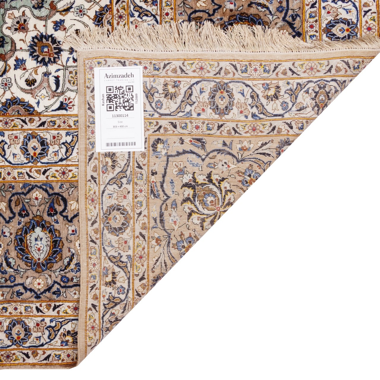 هذه سجادة أنتيك من كاشان من حرير بالكامل بتصميم مدالية مع أركان وزخارف زهرة الشاه عباسي. أبعادها 303 × 430 سم (9'11" × 14'1") ومساحتها 13.03 م² (140.25 قدم²). النسج حريري بالكامل وتبلغ كثافته نحو 7,300 عُقَد/دسم²، في دلالة واضحة على الدقة والبراعة في الحياكة. تتوسطها مدالية بهيّة كأنها شمس مشرقة، فيما تُنبت الأركان الأربعة حدائق من اللبلاب وزهور الشاه عباسي. وقد دَبَّت الحياة في الزخارف بفضل الدقة الفائقة وبريق الحرير الطبيعي، حتى ليُخيَّل أنّ كل زهرة تتفتح وأن كل خط وقوس يردد نغمة من مجدٍ إيراني. أرضية كريمية ناعمة تؤمّن مسرحًا هادئًا لعرض العناصر، وحاشية بلونٍ بنيٍّ رصين تُطوّق هذا البستان المتخيَّل بوقار. هذا التباين اللطيف بين اللونين يمنح المشهد توازنًا وعمقًا محبّبين ويشدّ النظرة إلى قلب السجادة.