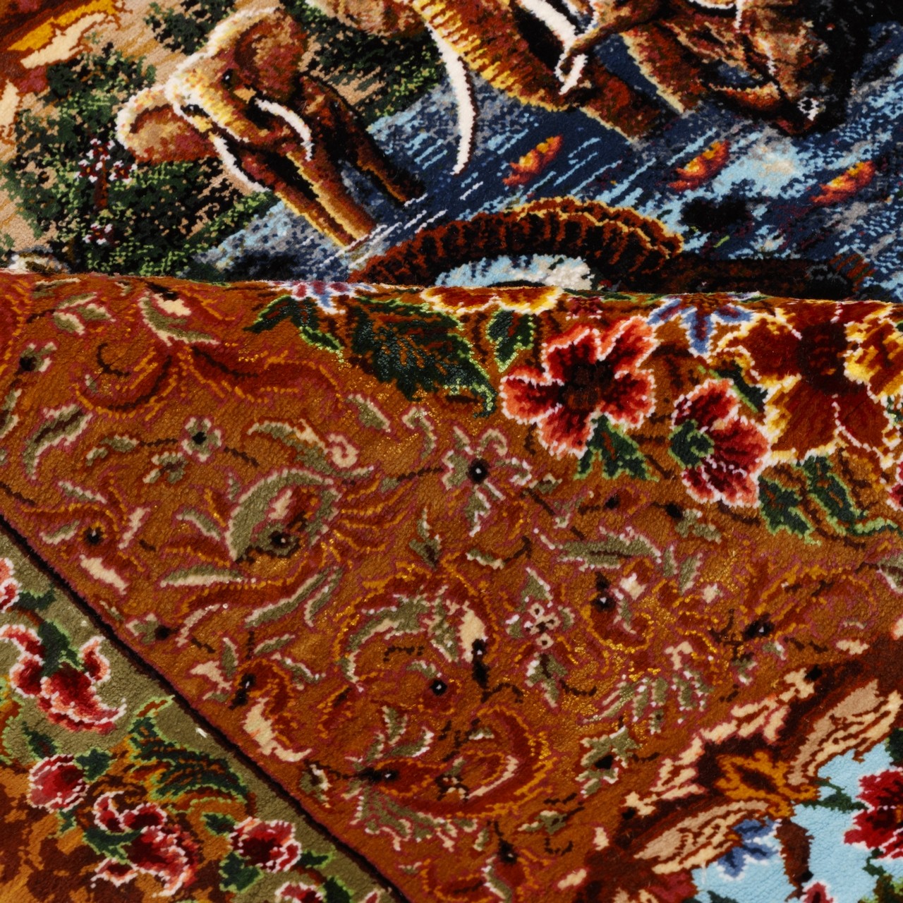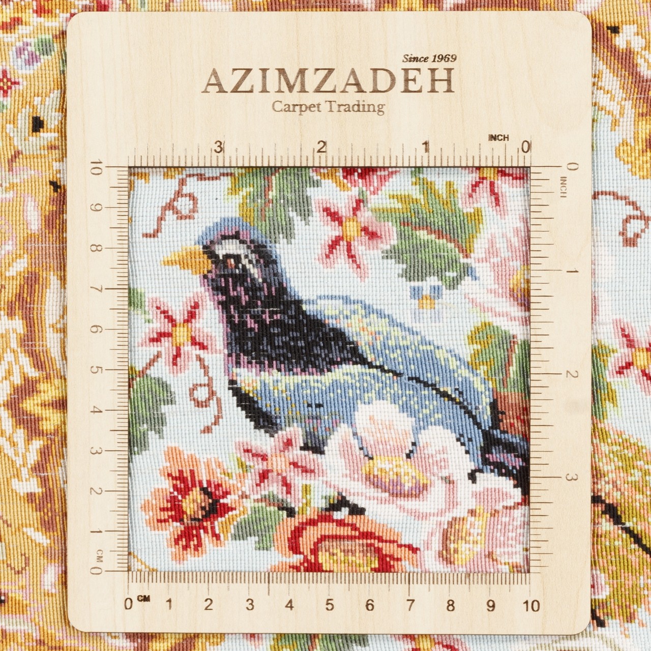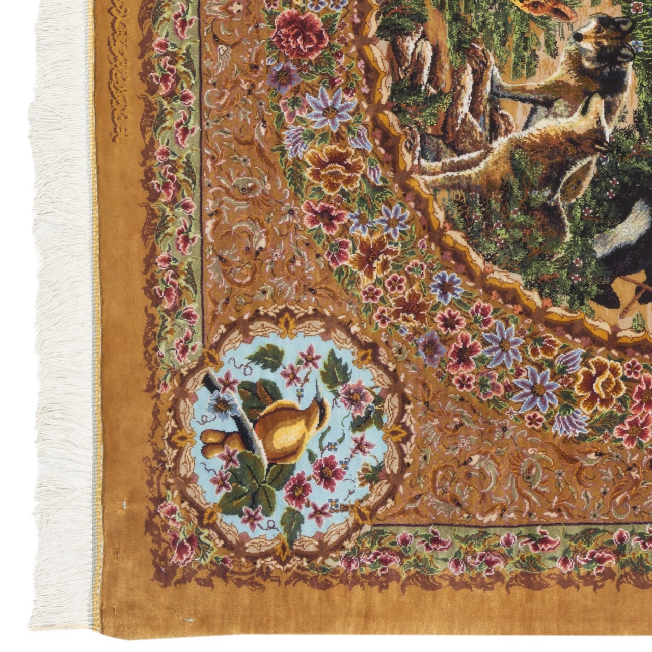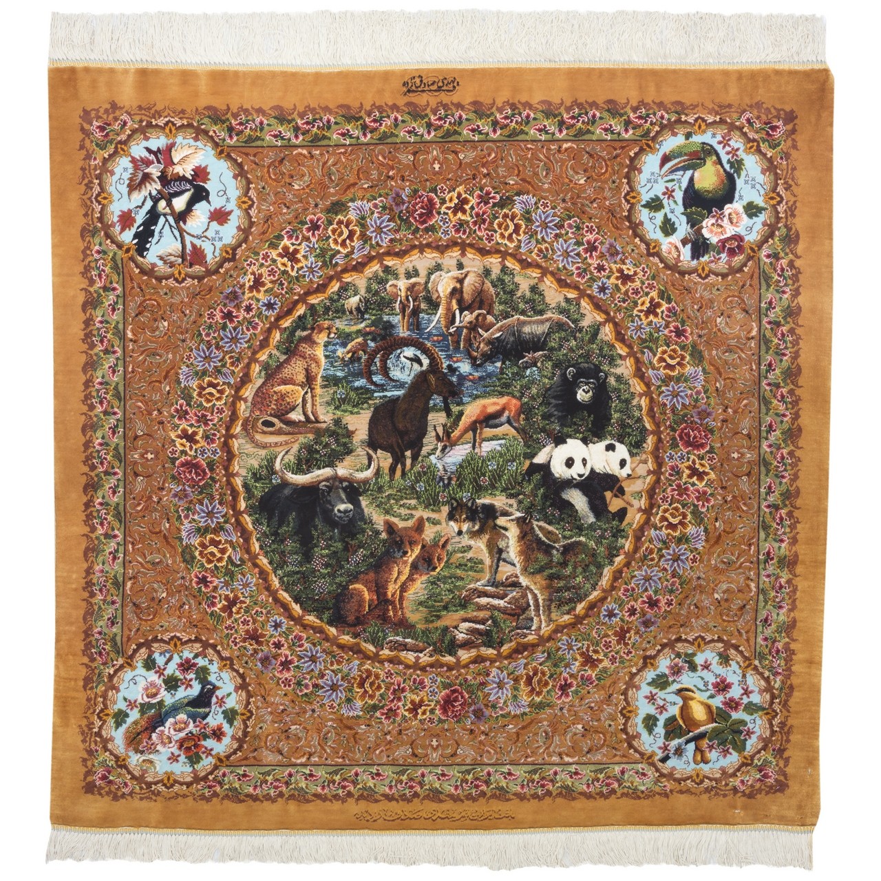 تأتي هذه السجادة اليدوية من حرير بالكامل من قم بمقاس 101 × 100 cm (3'4" × 3'3") وبمساحة دقيقة 1.01 m² (10.87 ft²). تحمل علامة «مهدي صادق زاده» وبكثافة تقديرية ≈ 11,500 عُقَد/دسم²، وتعرض حريرًا خالصًا في السدى واللحمة بملمس ناعم وبريق مميّز. وهي نموذج من التصميم الممتد حيث تظهر رموز لحيوانات متنوّعة داخل المدالية المركزية—تصاوير متخيّلة لكائنات وطيور كأنّها خارجة من الحكايات والأساطير القديمة وقد دبّت فيها الحياة داخل إطار السجادة. وكل حركة ونظرة في هذه الزخارف تحمل رسالة من أسرار الطبيعة وانسجام الخليقة. تصنع الأرضية البنيّة الفاتحة مع الإطار بلون جملي توليفة دافئة أصيلة، تستحضر الأرض الخصبة وحضن الطبيعة الدافئ.