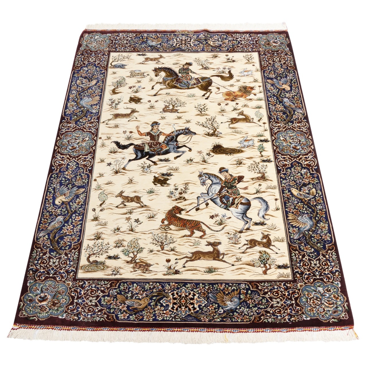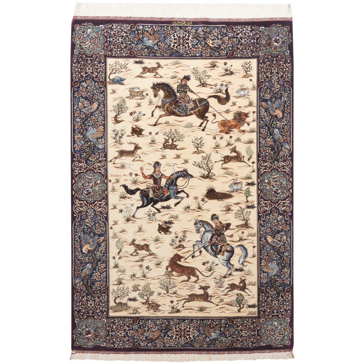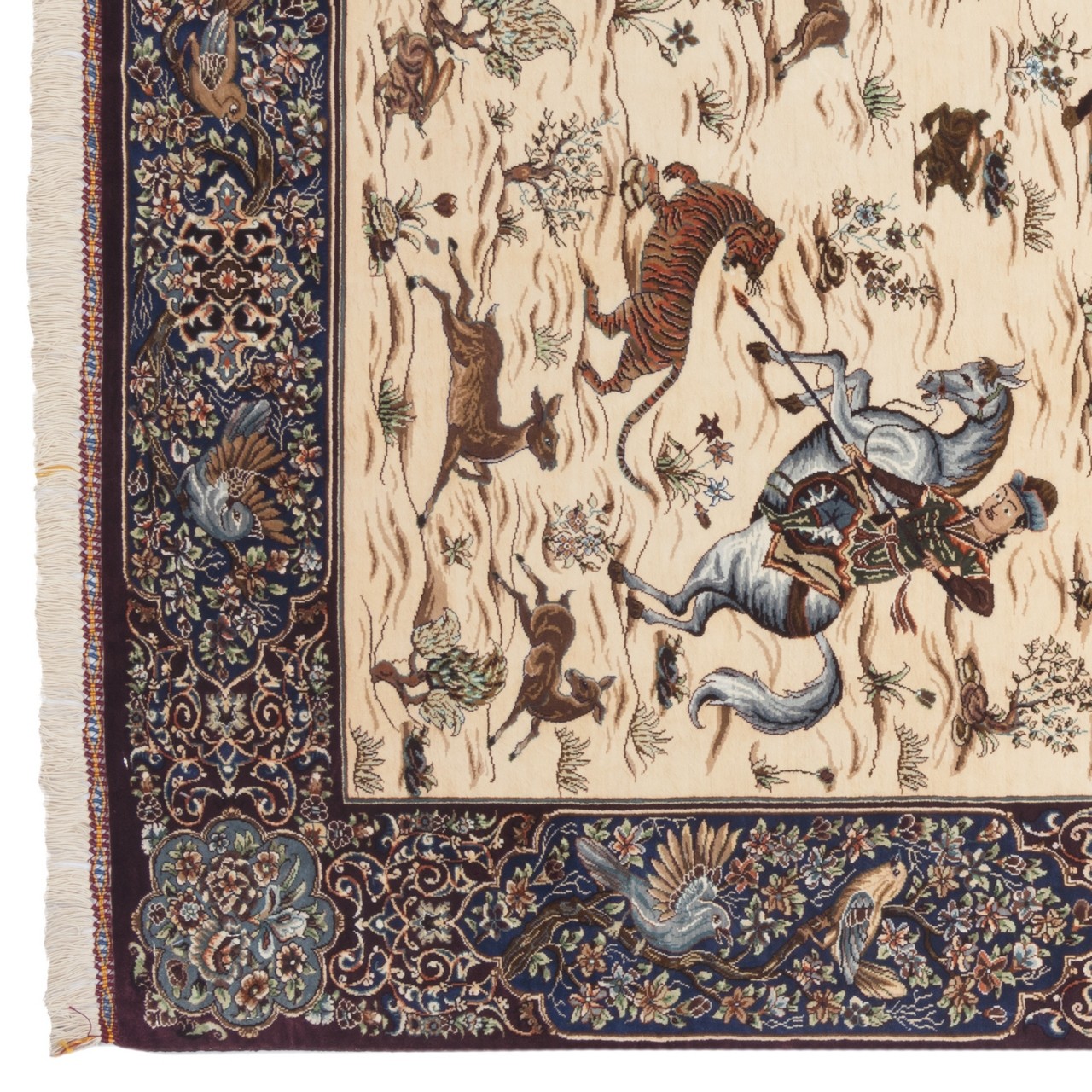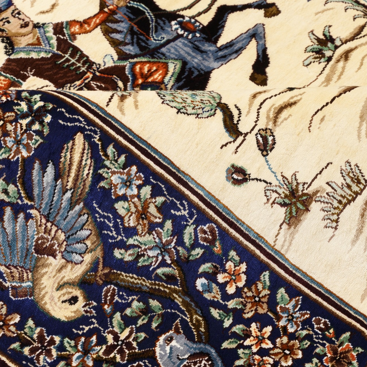 سجادة حرير بالكامل من مدينة قم تتألق كحكاية مصوّرة عن الأسطورة والطبيعة. نُسجت بمقاس 100 × 143 سم (3'3" × 4'8") ومساحة 1.43 م² (15.39 قدم²)، وتعرض بتصميم مشهد الصيد قصصاً عن العظمة وشجاعة الإنسان وعالم الطبيعة في قلب السدى واللحمة. أُنتجت تحت علامة «لاجوردي» بكثافة عقدية تقارب 11,400 عُقَد/دسم²، لتجسد دقةً فائقة مستمدة من فنون عدة أجيال من أساتذة النسيج القميين. التصميم الممتد لمشهد الصيد في هذا العمل يرسم مشاهد المطاردة والملاحقة، ركوب الخيل، الرماية، وحضور حيوانات مثل الغزلان، الأسود، الفهود والطيور على أرضية بلون كريمي هادئ. هذه الخلفية الدافئة والمريحة تحيط بها حاشية بلون كحلي داكن تمنح عمقاً وتبايناً أخّاذاً. إن هذا المزيج اللوني يجمع بين الوقار والرقي، ويمنح السجادة في الوقت نفسه حيوية بصرية لافتة.