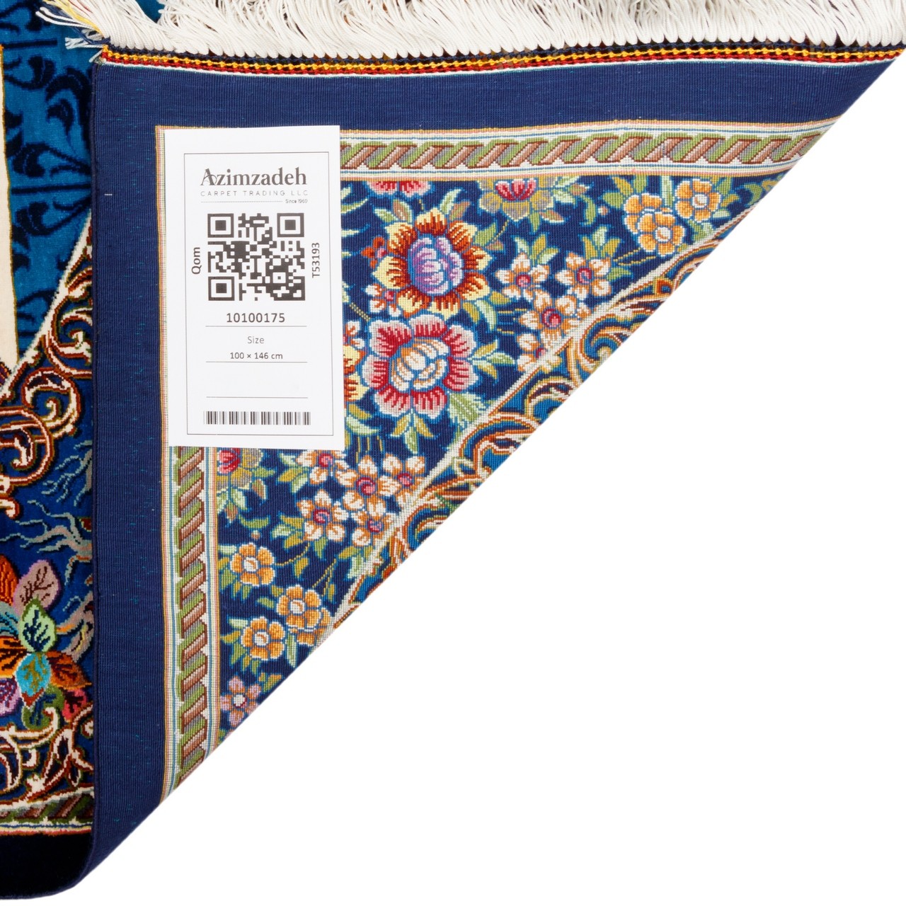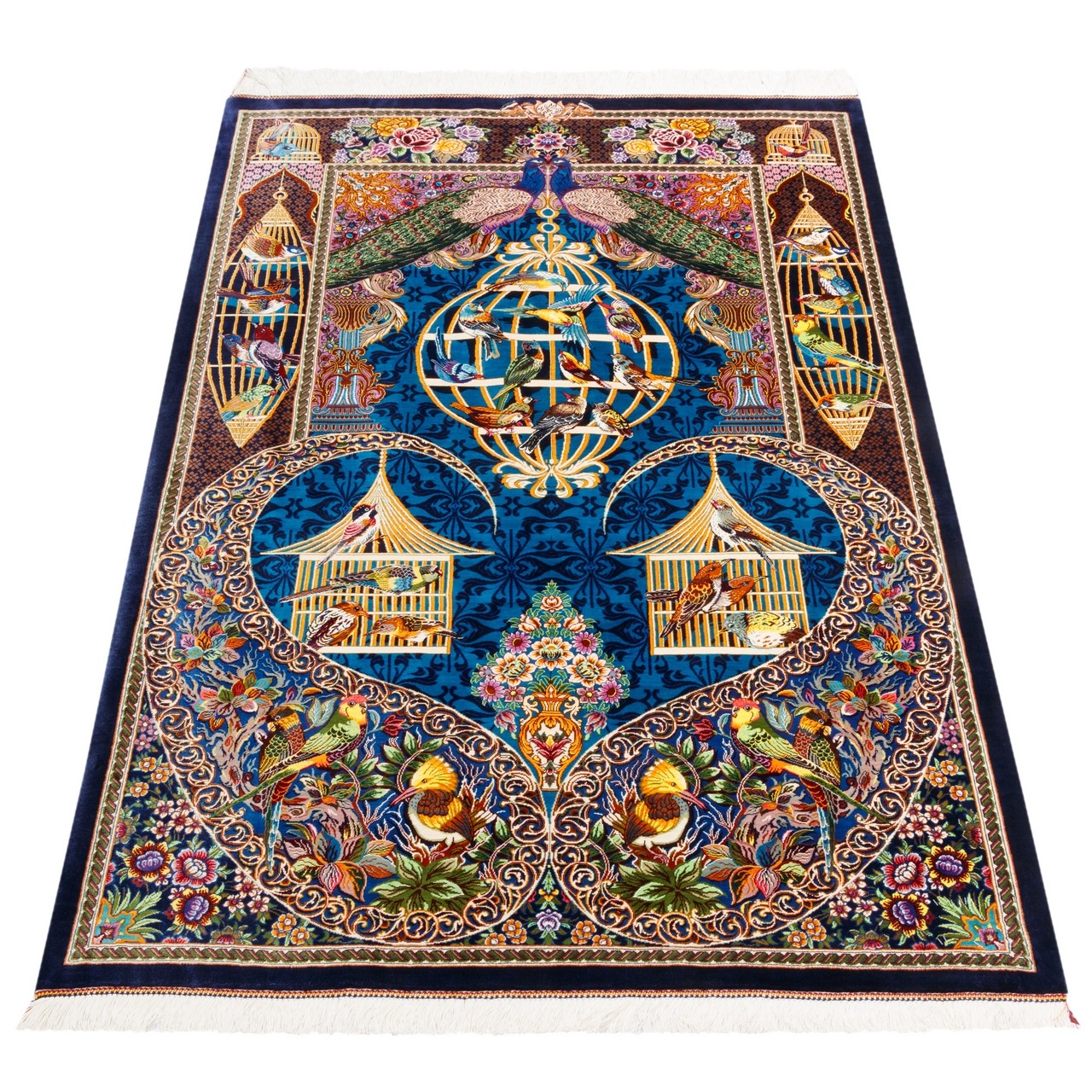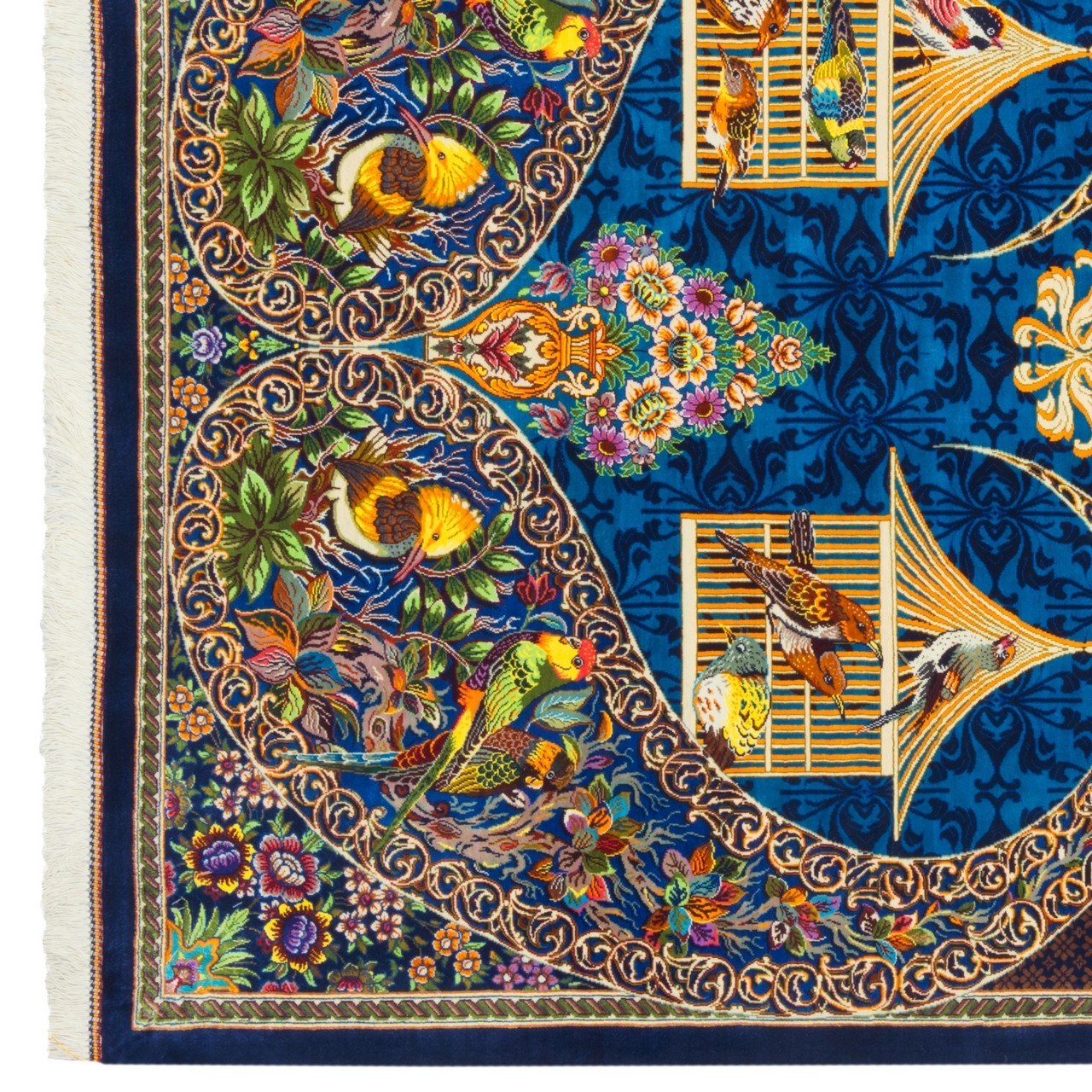هذه السجادة اليدوية المنسوجة من حرير بالكامل من قم، ذات تصميم ممتد وزخارف الطيور، تبدو كقصيدة تحوّلت إلى صورة بصرية. نُسجت بمقاس 100 × 146 سم (3'3" × 4'9") وبمساحة 1.46 م² (15.72 ft²)، لتحتوي في إطارها عالماً من الجمال والمعنى. بكثافة نسج تقارب 10000 عُقَد/دسم²، تُعد دليلاً على براعة النسّاج في ابتكار عمل رفيع العقد، وتحمل علامة «حكمتي راد». التصميم الممتد بزخارف الطيور يجسّد انطلاق الخيال وحرية الروح؛ وفي الجزء العلوي من أرضية السجادة، يظهر طاووسان جميلان ومتناظران بأذيال مفتوحة. الطاووس في الفن الإيراني غالباً ما يرمز إلى الجمال والخلود. أما المركز والمناطق المحيطة به، فقد امتلأت بأقفاص تحوي طيوراً متعددة مثل الببغاء، البلبل وغيرها. في هذا التصميم الممتد، ومن دون مركزية محددة، تتوزع النقوش كحديقة شاسعة لا نهاية لها، لتأخذ عين الناظر في رحلة لا تنتهي بين أغصان الخيال. أما أرضية اللون الأزرق، فتمنح العمل بأسره لمسة من السكينة والجاذبية، في حين أن الحاشية الكحلية الداكنة، كإطار جوهرة متلألئة، تزيد من تماسك وعمق هذه التحفة الفنية.