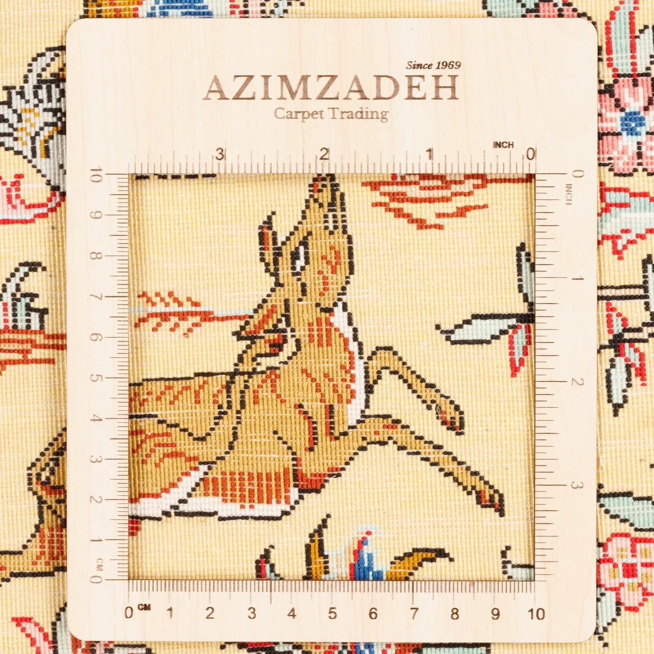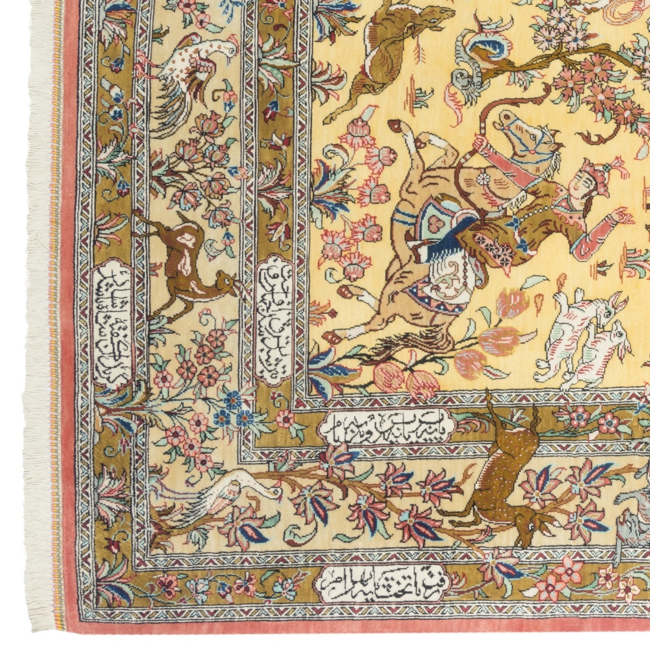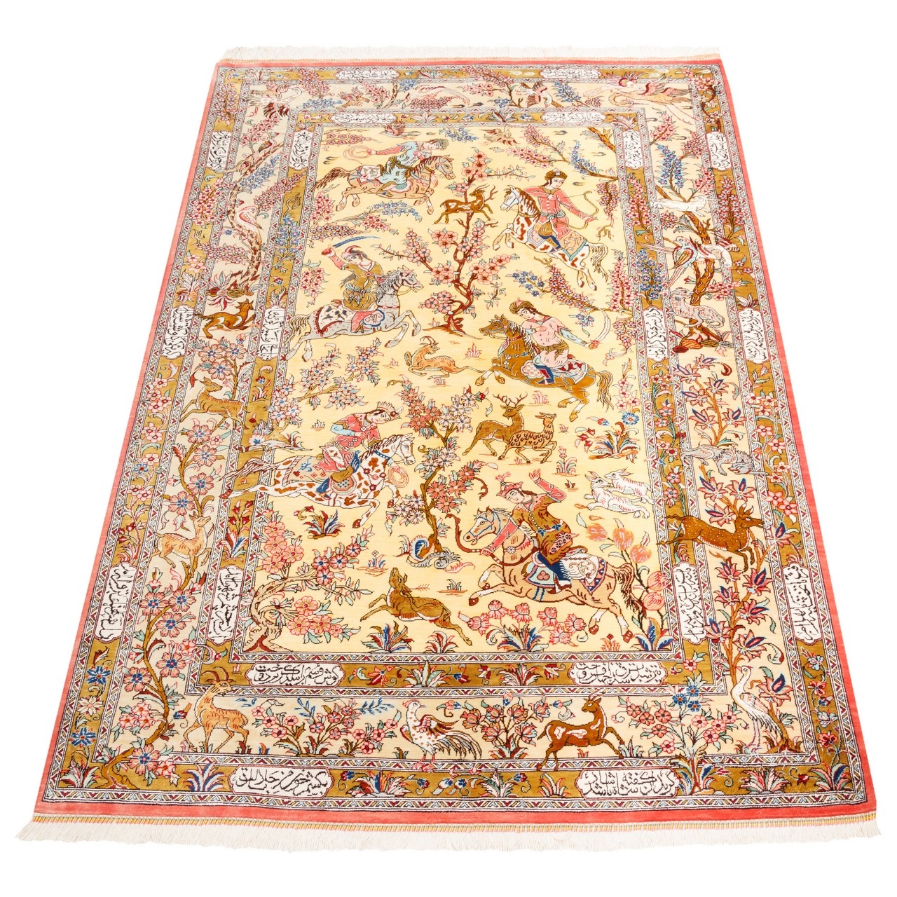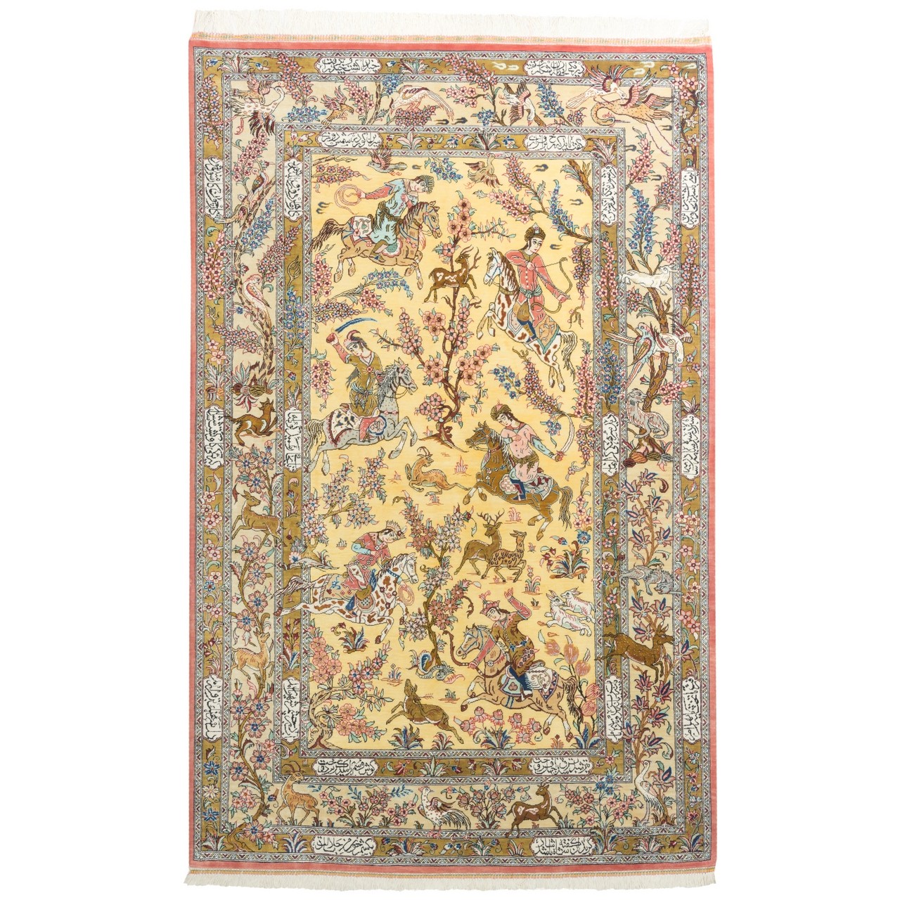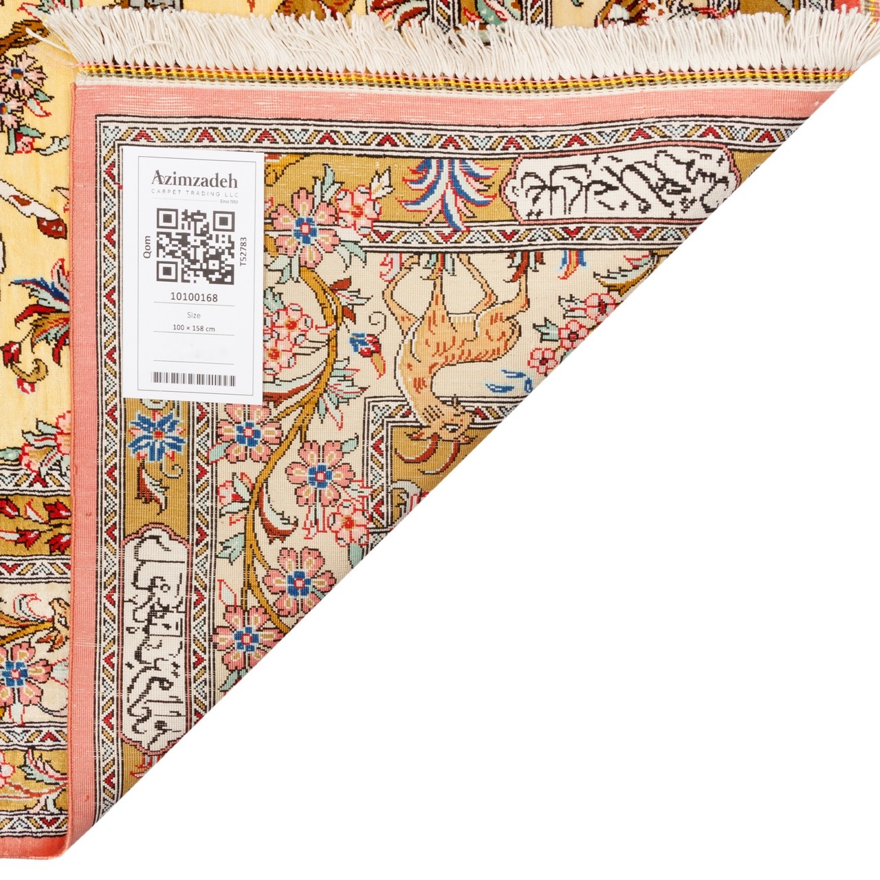 في فن نسج السجاد في قم، المدينة التي تتداخل في كل سداها ولحمتها مئات السنين من التراث، وُلدت سجادة تتجاوز الزينة لتضمّ في نسيجها سرداً مصوّراً لأساطير إيران القديمة. تأتي هذه القطعة الآسرة بمقاس 100 × 158 سم (3'3" × 5'2") ومساحة 1.58 م² (17.01 ft²)، ومع كثافة نسج تقارب 8,600 عُقَد/دسم²، شاهدةً على رفيع الفن وبراعة الحياكة. في هذا التصميم الممتد، تتجلّى “قصة بهرام گور مع جاريته” عبر نقوش مشهد الصيد؛ قصة عشقيّة ومليئة بالأحداث متجذّرة في أعماق الشاهنامة وأساطير إيران، وقد أُحييت هنا على بساط من حرير ذهبي. كان بهرام گور الشاهنشاه الخامس عشر لإيران من السلالة الساسانية، وقد خلف والده يزدگرد الأوّل سنة 421 ميلادية. تتجسّد مشاهد الصيد، وجموح الخيل، ونظرة الجارية الغامضة بمهارةٍ استثنائية وسط زخارف متقنة ومنسجمة، كأنّ الزمن توقّف في هذه السجادة ليدعو كل مشاهد إلى رحلةٍ من الخيال. وقد نُقشت أبيات من هذه الحكاية الواردة في «هفت پیکر» لنظامي في الحاشية الصغيرة. يولّد لون الأرضية الذهبي—رمز الفخامة والنور—مع الحاشية الكريمية توليفةً دافئة نبيلة متألّقة تمنح العمل حضوراً ملكياً. ويُضفي الحرير، ببريقه الطبيعي ونعومته الفائقة، ليس الجمال البصري فحسب، بل أيضاً حيويةً وديناميكيةً تبدو معها روح السجادة متبدّلة مع تغيّر الضوء. إنها سجادة يدوية من قم تُظهر تجلّياً لا نظير له لذوق الفنّ الإيراني، وتحكي حكاية منسوجة في خيوطها ذاتها—قصة حبٍّ وبأسٍ وجمالٍ وقوّة تناقلتها الأجيال، ها هي اليوم تستقرّ على الأرض في قالبٍ خالد.