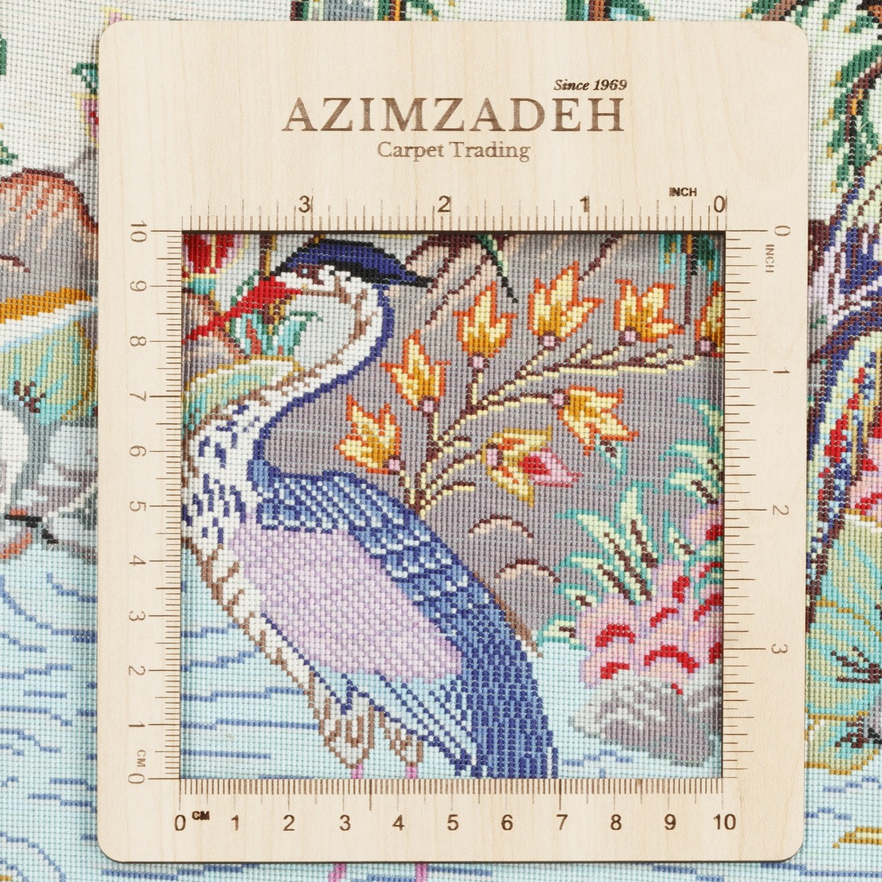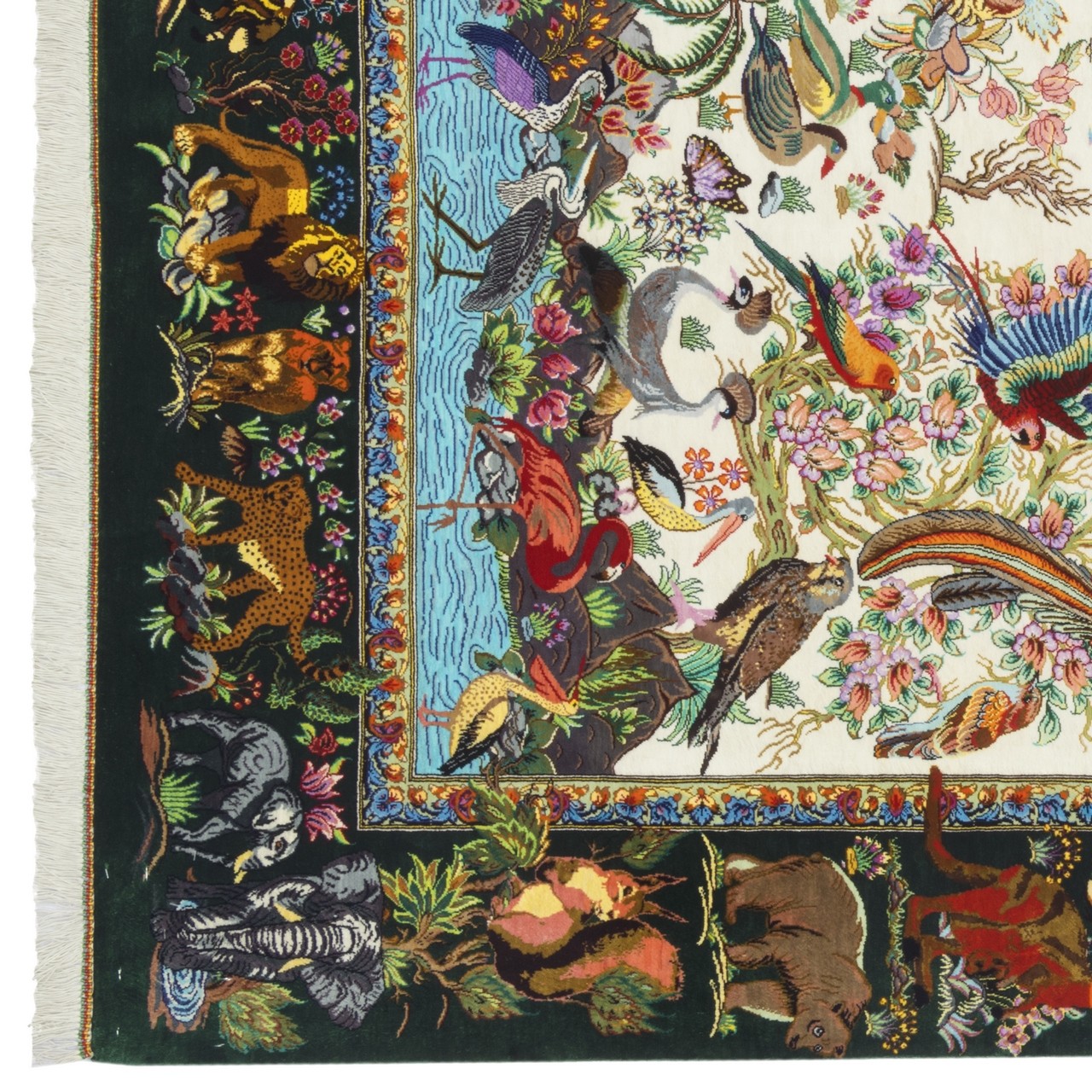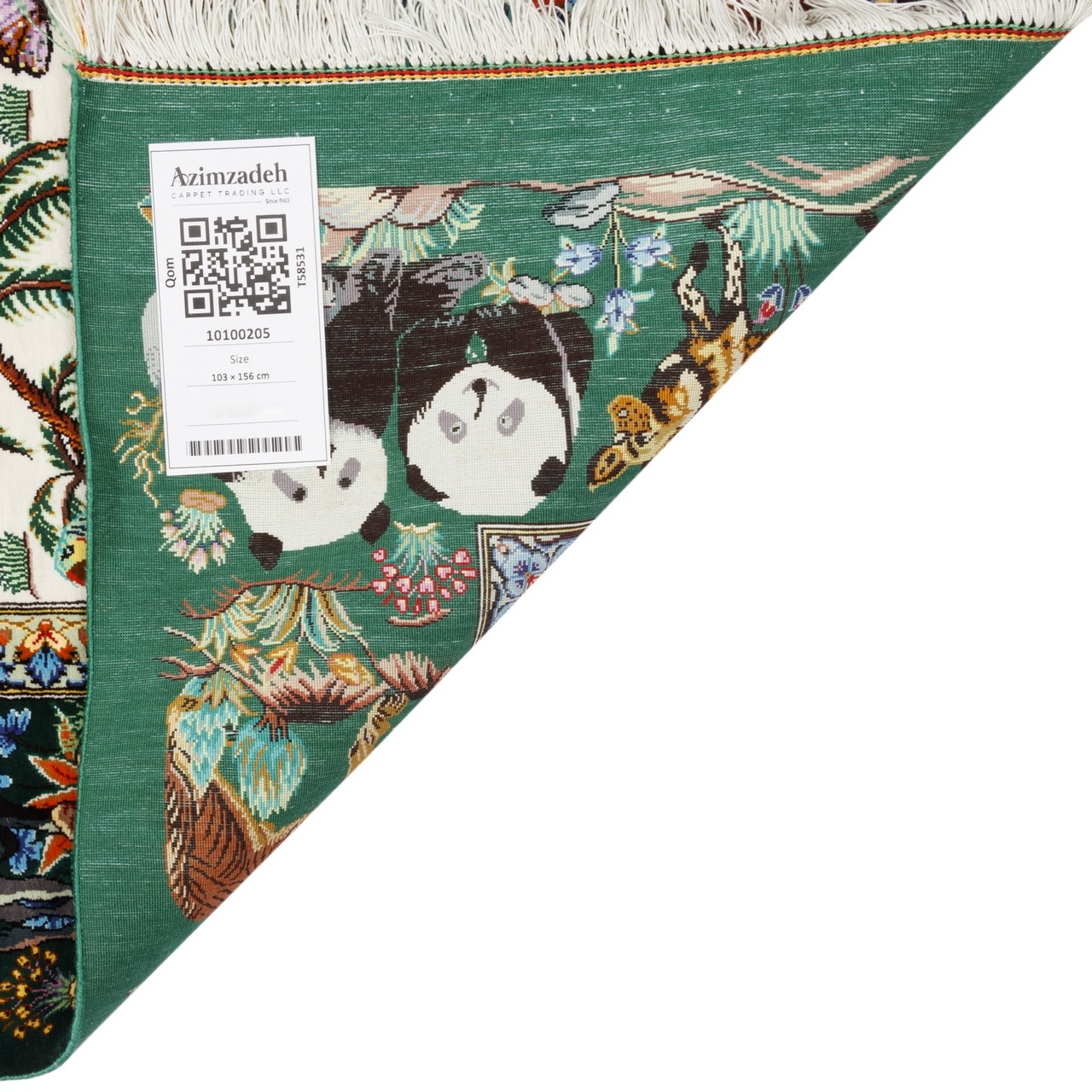 هذه السجادة اليدوية من قم، بمقاس 103 × 156 سم (3'5" × 5'1") ومساحة 1.61 م² (17.34 قدم²)، نُسجت بكثافة تقارب 10,000 عُقَد/دسم²، وتُعد مثالاً بارزاً على براعة الحِرَف الإيرانية. من علامة «صفي‌زاده» ومصنوعة من حرير بالكامل، ما يمنحها سطحاً لامعاً، ناعماً وحيوياً يكشف عن طبقات جديدة من الألوان والزخارف مع تغيّر الضوء عليها. التصميم الممتد بتركيز على الزخارف الحيوانية يميّزها عن غيرها من النماذج؛ إذ تظهر الحيوانات في أرجاء السجادة—تارةً ساكنة وهادئة، وتارةً أخرى في حركة وقفز—وكأن موطناً كاملاً قد خُلق في نسيجها. أرضية بلون كريمي توفّر خلفية هادئة للنقوش، وتتآلف بانسجام مع حاشية خضراء لتمنح التكوين توازناً وانتعاشاً بصرياً بديعاً. هذا الاختيار اللوني، وفي الوقت نفسه الذي يُكرّم الطبيعة، يضفي على السجادة رقّة روحية ولمسة بصرية آسرة.