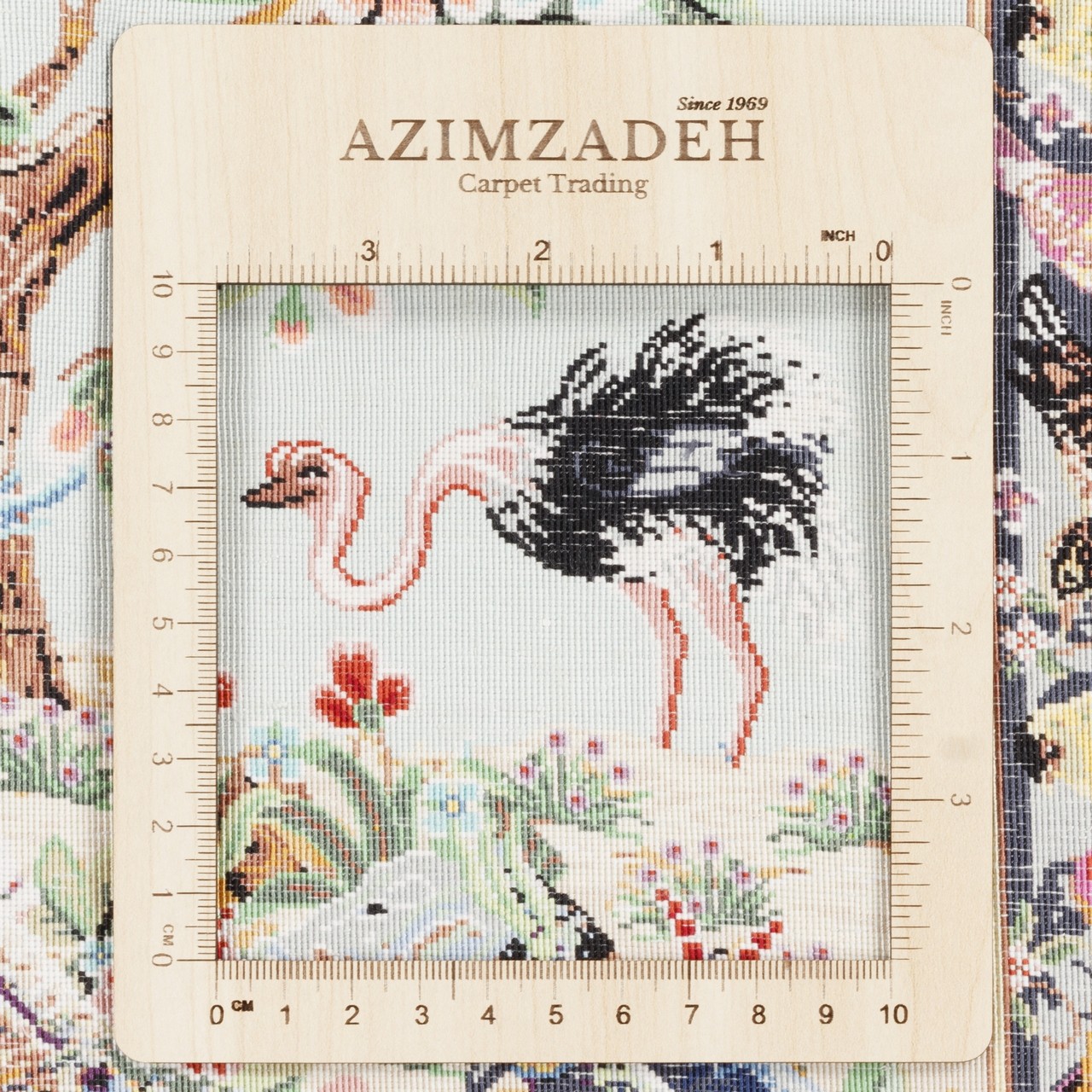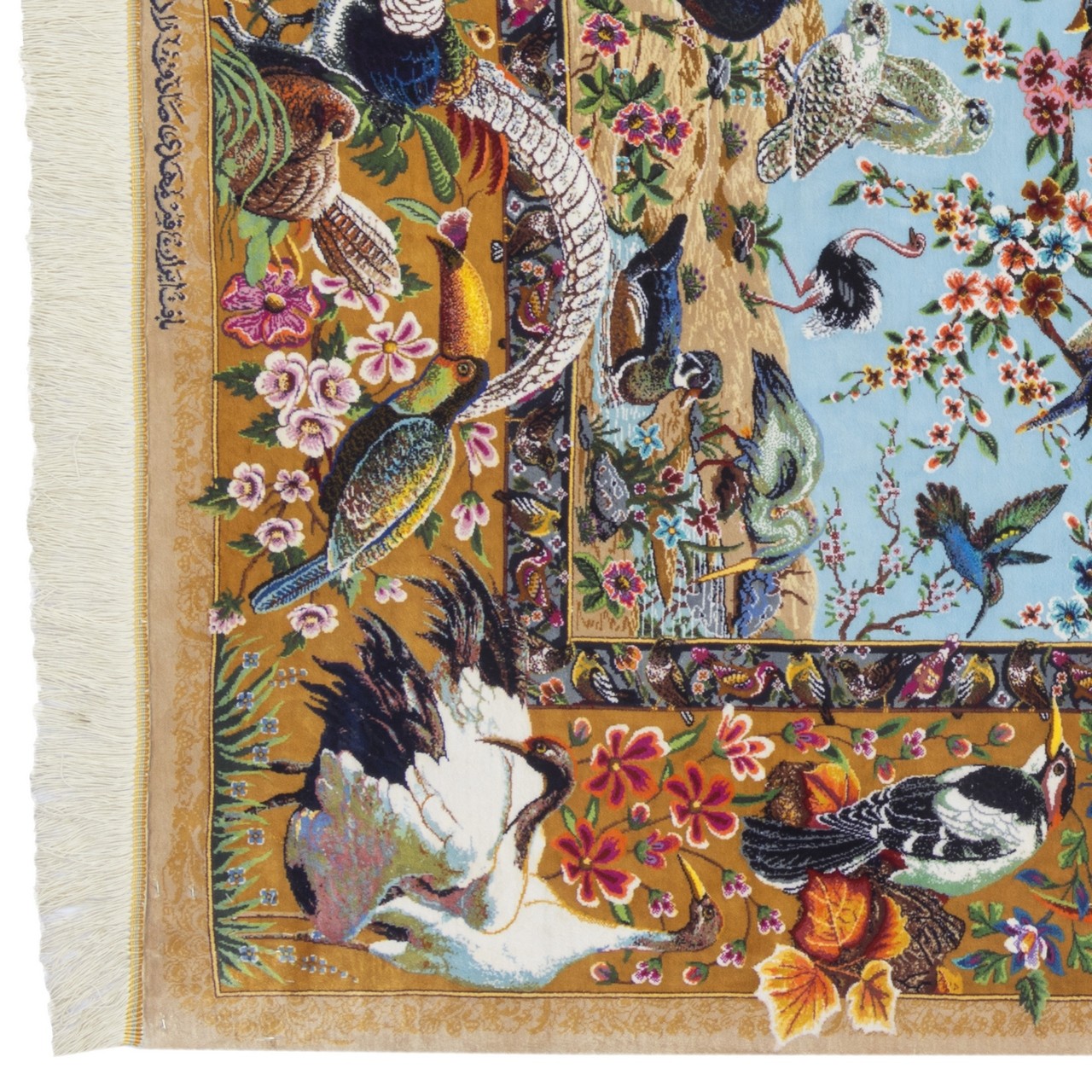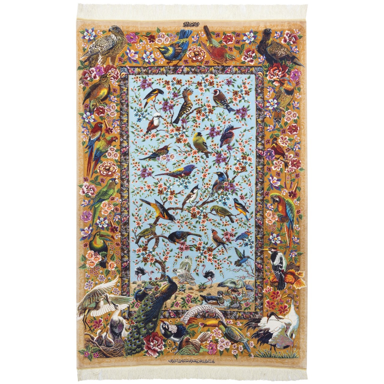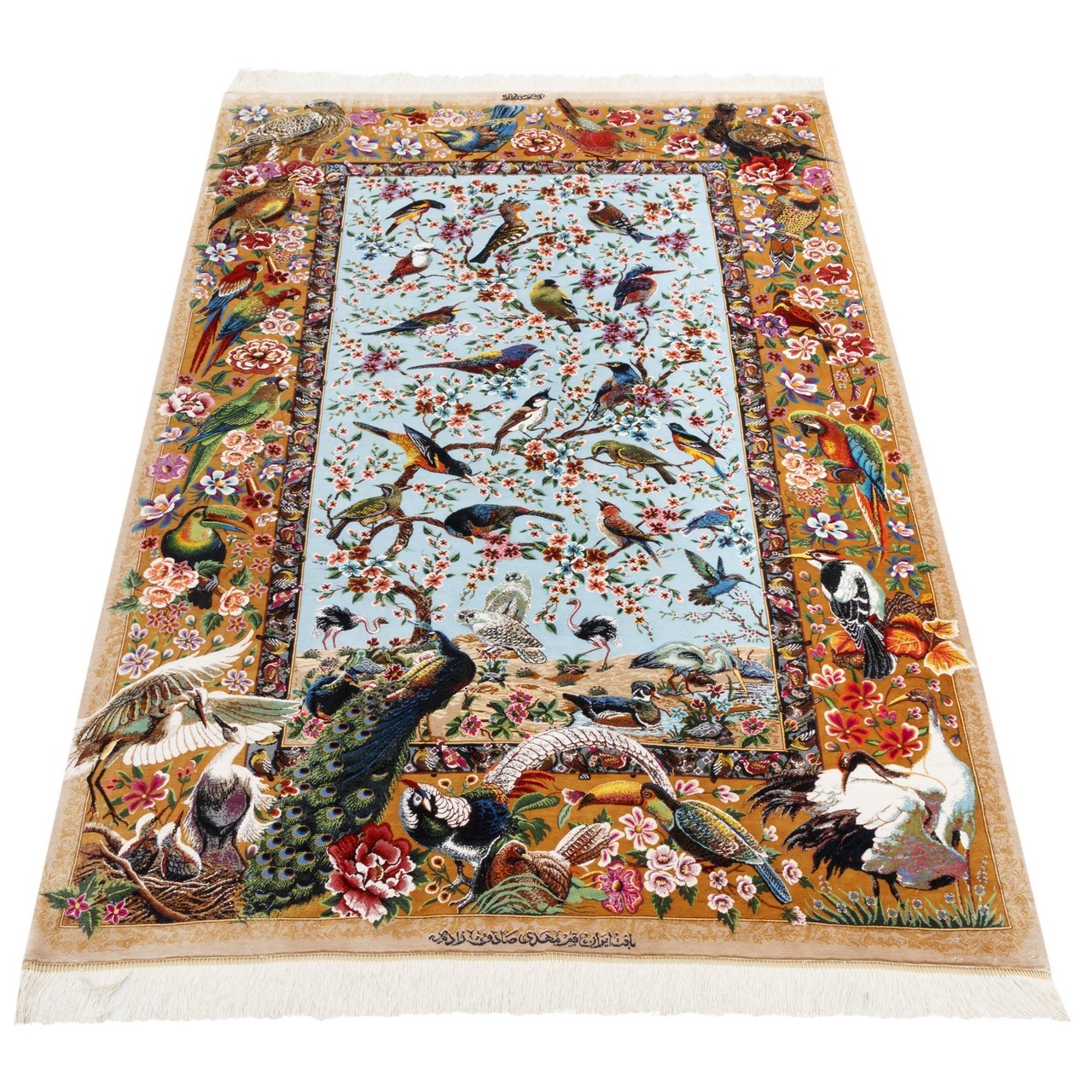 هذه السجادة اليدوية، بمقاس 108 × 158 سم (3'6" × 5'2") ومساحة 1.71 م² (18.40 قدم²)، نُسجت بكثافة تقارب 11,400 عُقَد/دسم²، ما يعكس قمّة المهارة في النسج وتماسك العُقَد بدقّة متناهية. إن استخدام الحرير في السدى واللحمة أضفى بريقاً لطيفاً وشفافاً جعل الألوان حيّة، نابضة وحسّاسة للضوء. من علامة «مهدي صادق‌زاده» وبتصميم ممتد، يحمل هذا العمل زخارف الطيور؛ بعضها بأجنحة ممدودة في طيران رشيق، وبعضها جاثم على أغصان الخيال، وكأن كل طائر لحن متناثر في أنحاء السجادة. هذا البُساط الحريري يتحوّل إلى سماء مفعمة بالأغاني والحركة. أرضية زرقاء فاتحة تُشكّل خلفية هادئة وروحية لهذه الزخارف، فيما تُطوّق الحاشية بلون نخودي لطيف التكوين بإطار متوازن وجذاب، لتُكمل حديقة الطيور هذه بانسجام ورقّة.