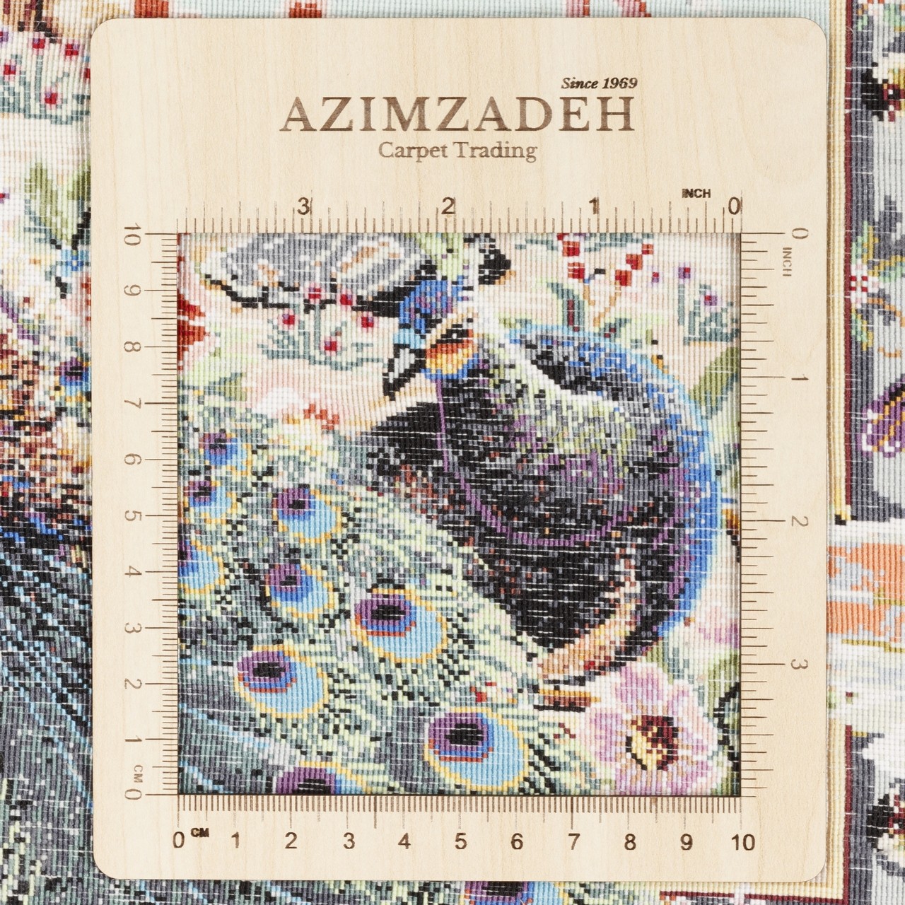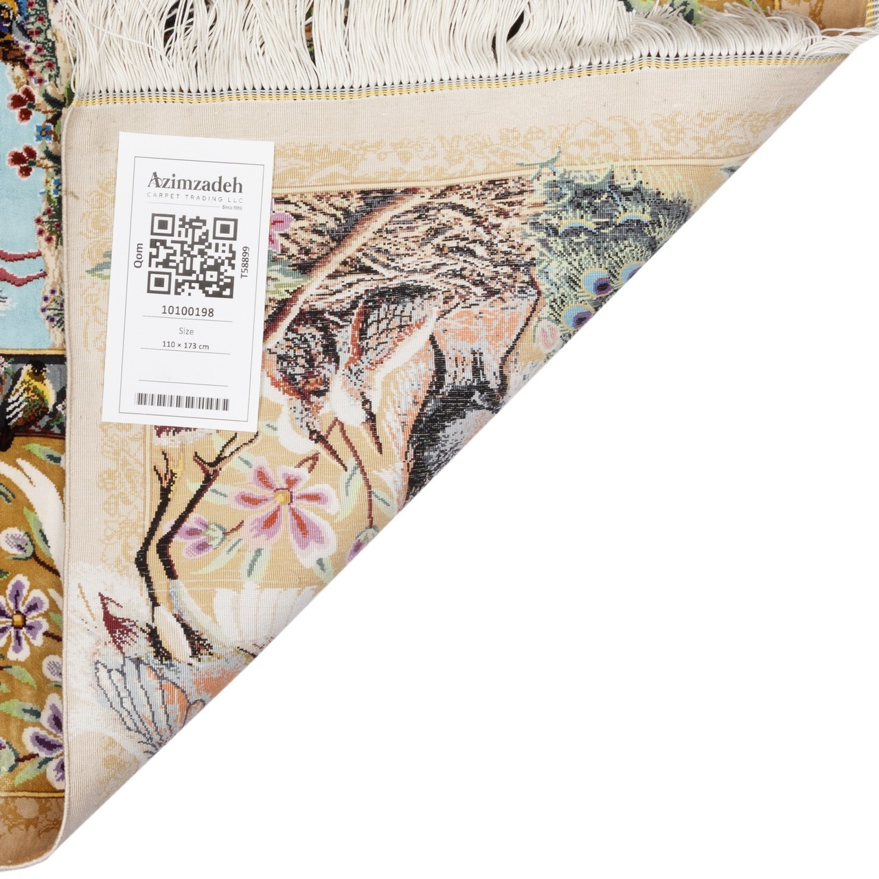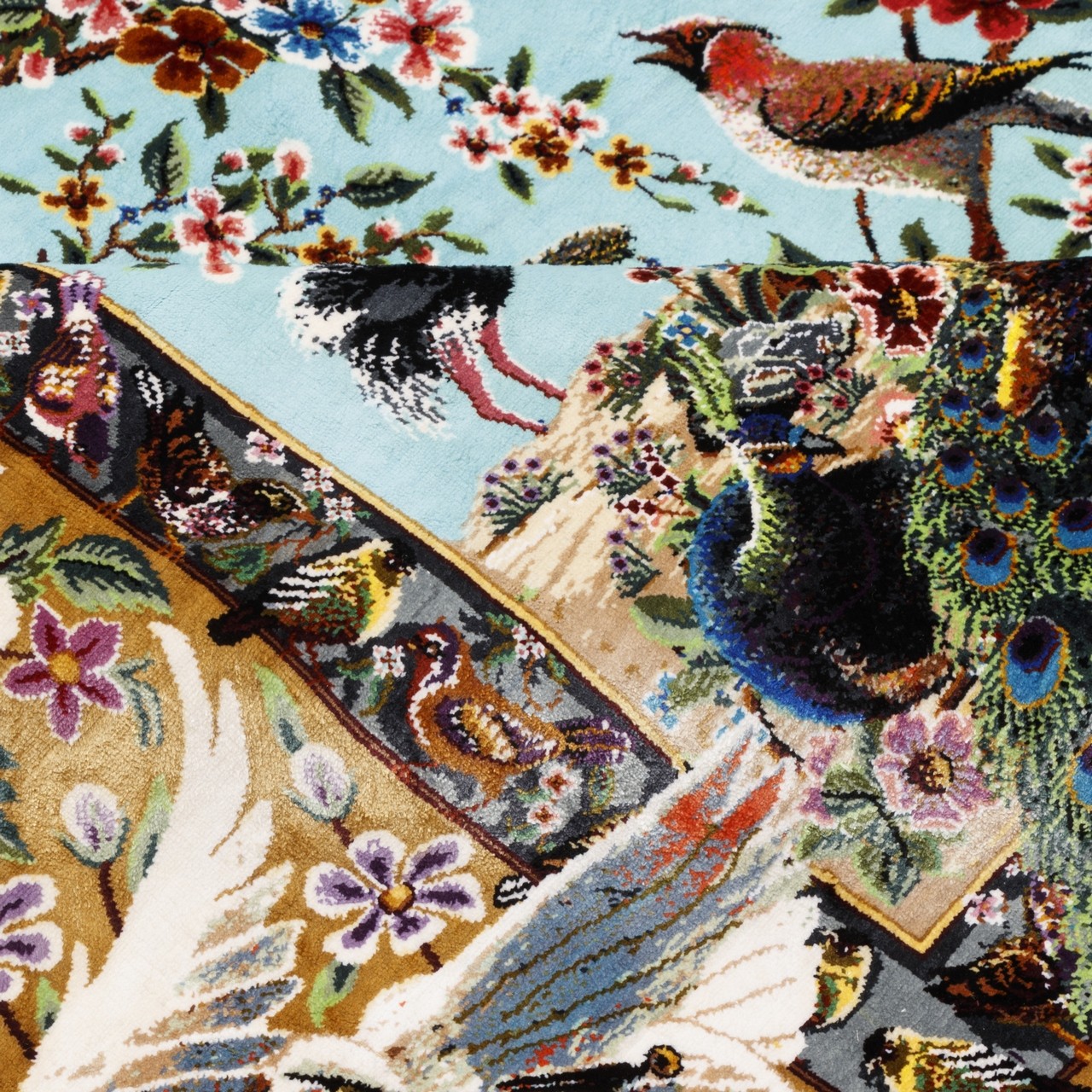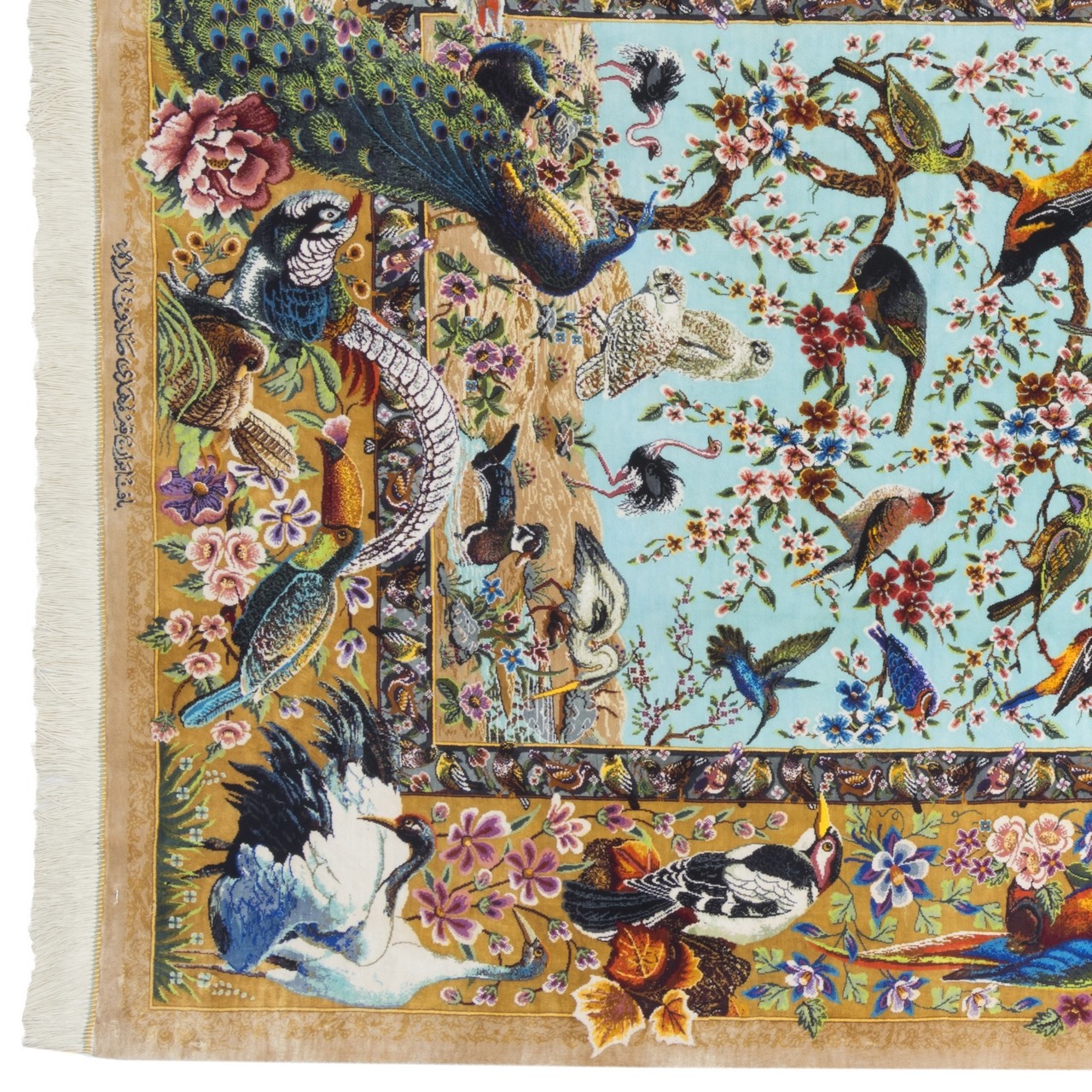 سجادة يدوية من حرير بالكامل من قم، بأبعاد 110 × 173 cm ‏(3'7" × 5'8") ومساحة 1.91 m² ‏(20.56 ft²)، تُجسّد رواية بصرية، طبيعة حالمة، وزخارف أصيلة من الفن الإيراني. صُنعت تحت علامة «صادق‌زاده»، بكثافة نسج تبلغ نحو 11,500 عُقَد/دسم²، مما يضعها ضمن فئة السجاد الدقيق النسج. يعرض تصميمها الممتد عالماً غامضاً من الطيور: الطاووس بجلال أجنحته، البلبل بنغمته الصامتة، السنونو في طيرانه، الصقر وغيره من الطيور الجارحة في مقام القوة، والببغاء بألوانه الآسرة—all قد استقرّوا في قلب هذا الميدان الفيروزي. أرضيتها الزرقاء الفاتحة، المستوحاة من السماء والماء، منحت السجادة رهافة روحية، فيما يحيط بها إطار بلون نخودي كإطار دافئ ومتوازن يضفي انسجاماً مبهجاً على العمل بأكمله. هذه السجادة ليست مجرّد بساط، بل لوحة تروي قصة.