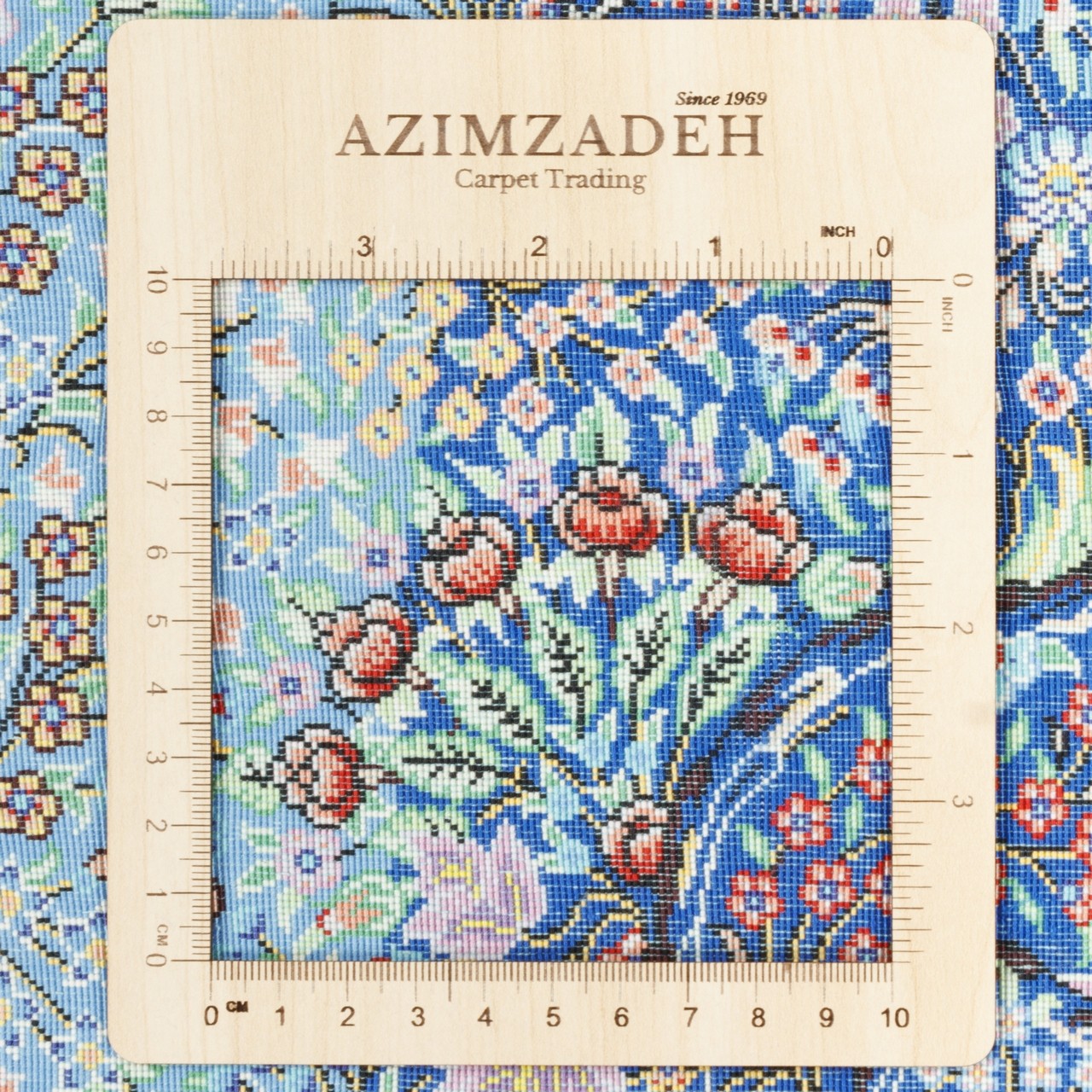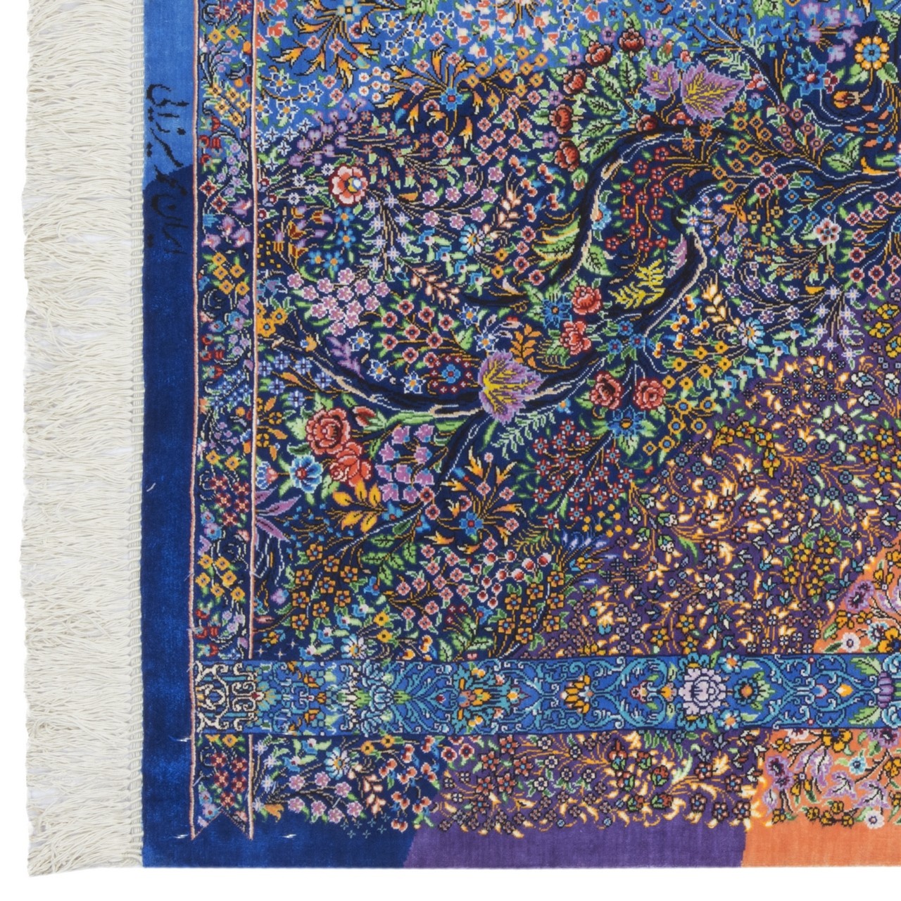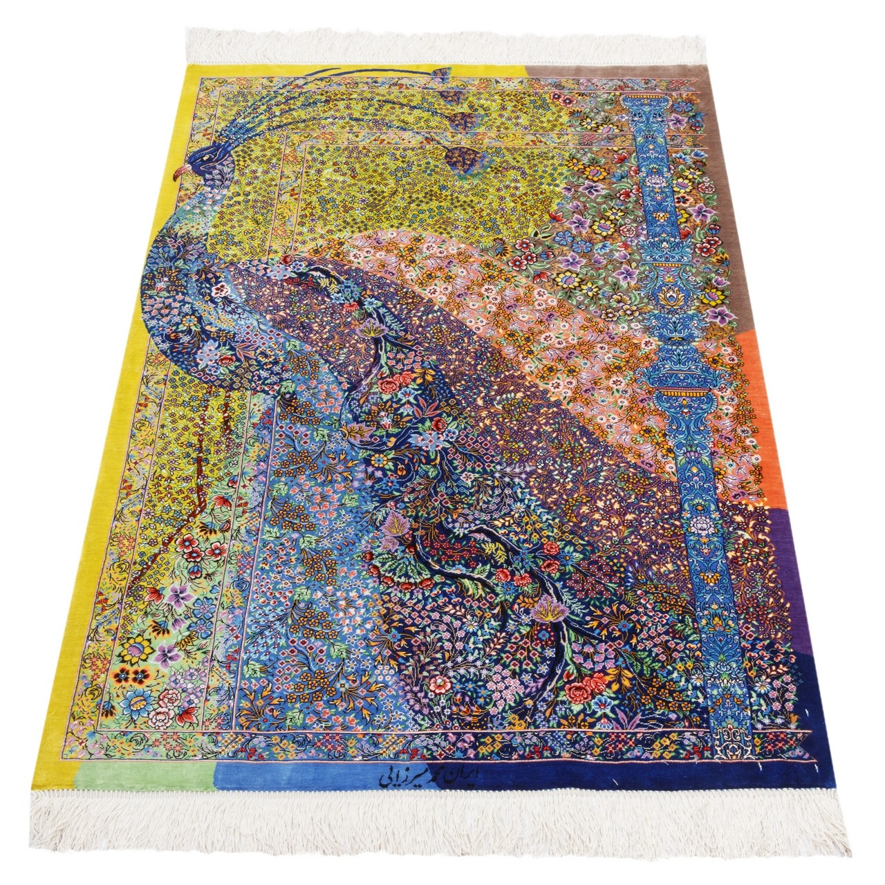 تأتي هذه السجادة اليدوية من حرير بالكامل بتصميم ممتد تصويري بمقاس 77 × 177 cm (2'6" × 5'10") وبمساحة 1.37 m² (14.75 ft²). تحمل علامة «محمد ميرزائي» وقد نُسجت بأيادي حرفيي قم، مع كثافة تقديرية ≈ 10,000 عُقَد/دسم²، لتشكّل مثالاً لافتًا لفن السجاد التصويري الإيراني. يبلغ التكوين الممتد حضورًا رمزياً أخّاذًا بفضل طاووس جميل في المركز؛ تملأ ريشاته المرفوعة والمتعدّدة الألوان—أزرق وأرجواني وكحلي ووردي—المجال الأوسط. وعلى الهامش الأيمن يظهر عمودان بلون أزرق مع زخارف كلاسيكية وتزيينات نباتية مستوحاة من العمارة الإيرانية. يغمر السطحَ زخرفٌ زهريّ متناسق يكسو السجادة كلّها بلا فراغات، في انسجام مع الروح الإيرانية وحبّ الطبيعة وإيقاع التكرار. وتمنح الألوان المتعدّدة في الحقل والإطار طابعًا حيًّا متعدد الأبعاد، كما يُبرز تلاقي الألوان في سدى ولحمة الحرير وجوهًا مختلفة للعمل تحت الإضاءات المتنوّعة، كأنّ كل نظرة تكشف مظهرًا جديدًا.
