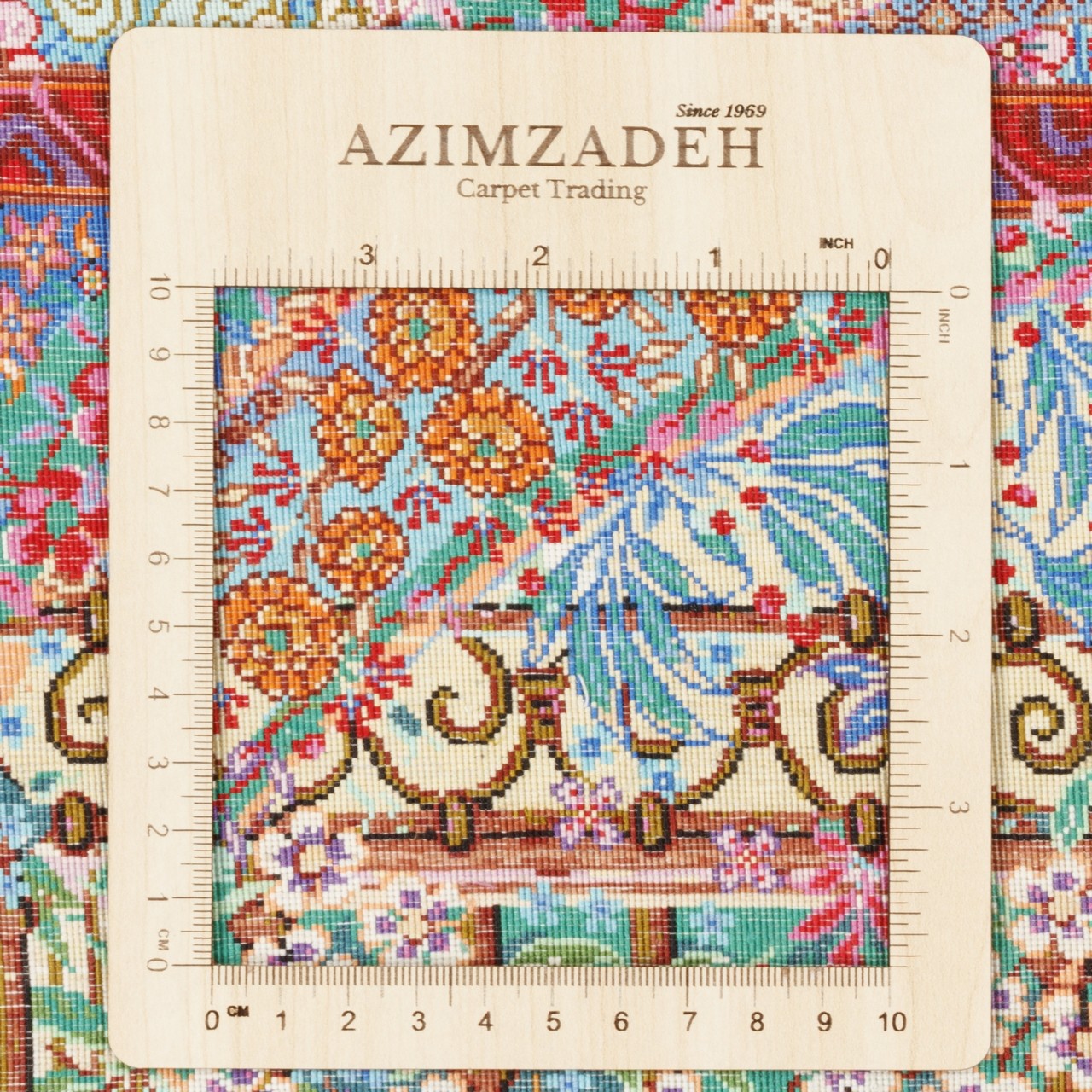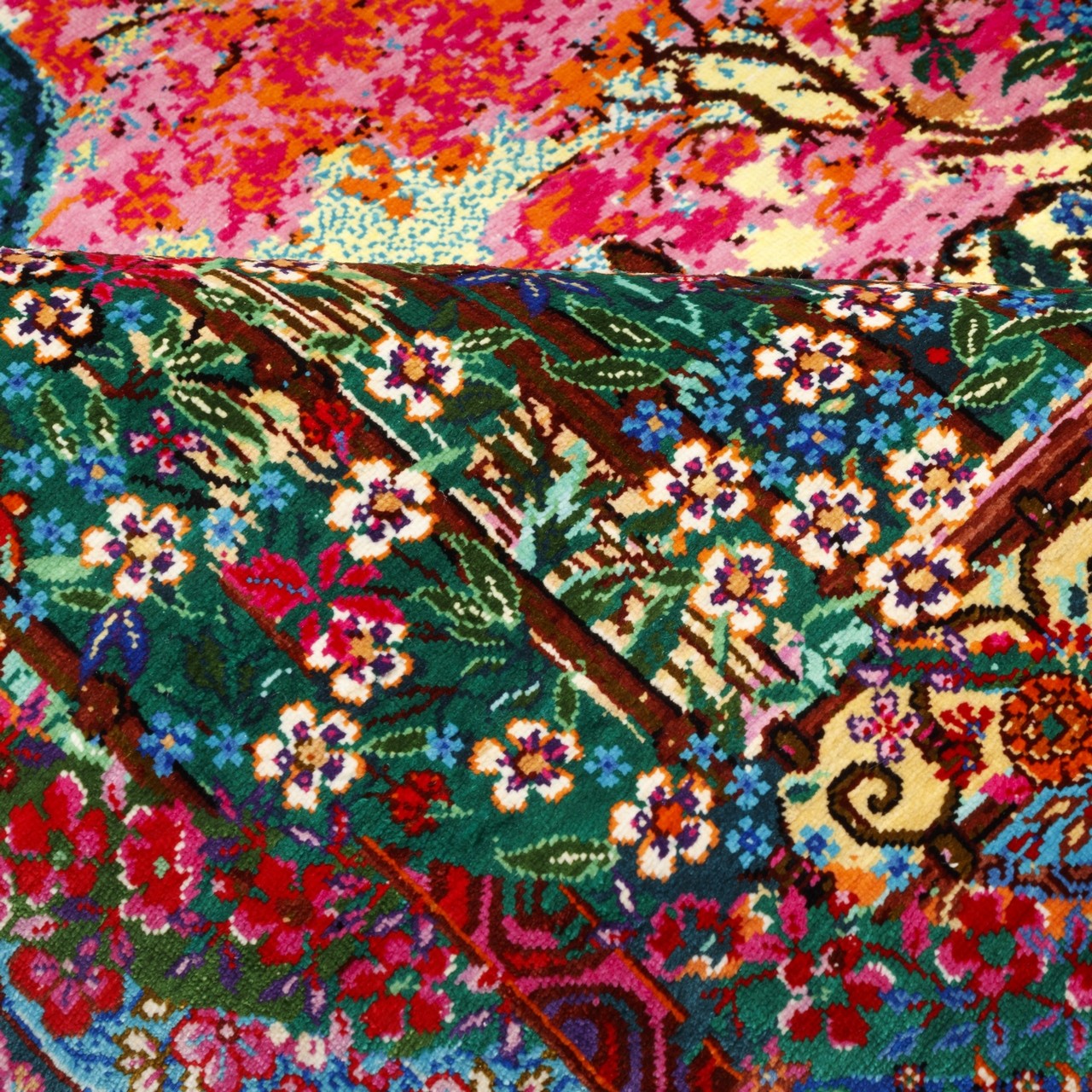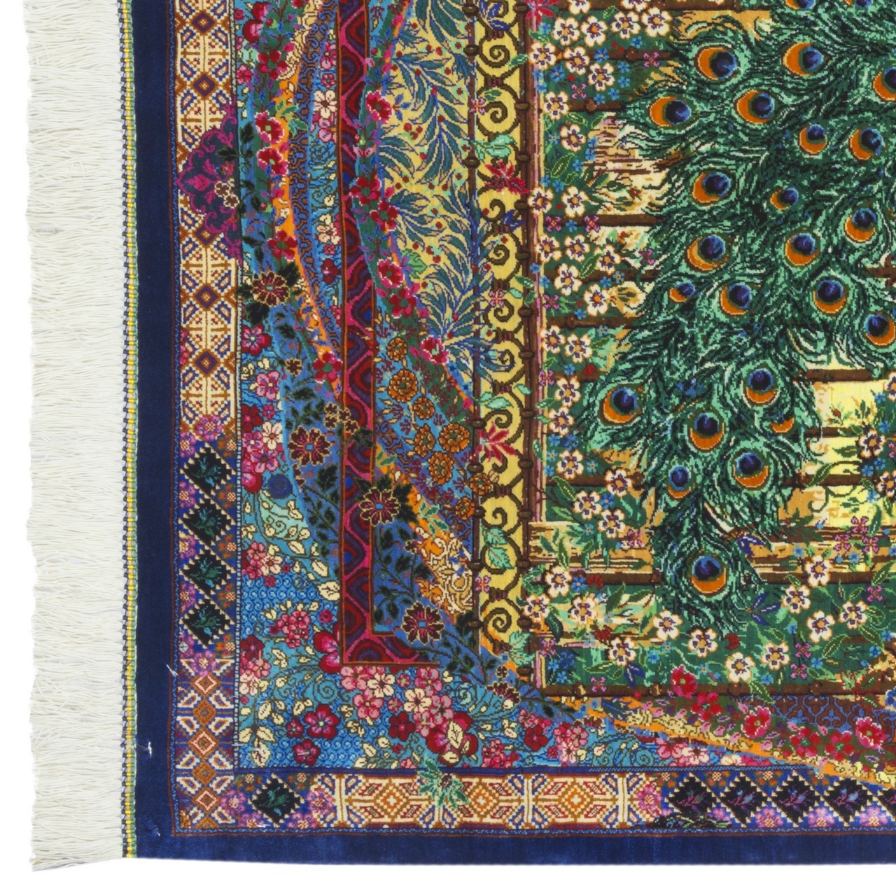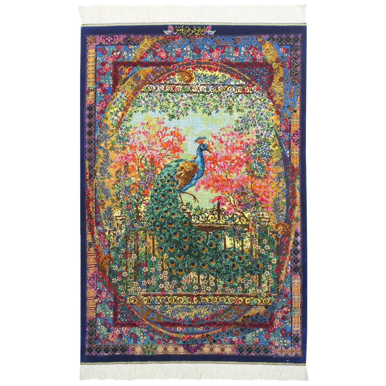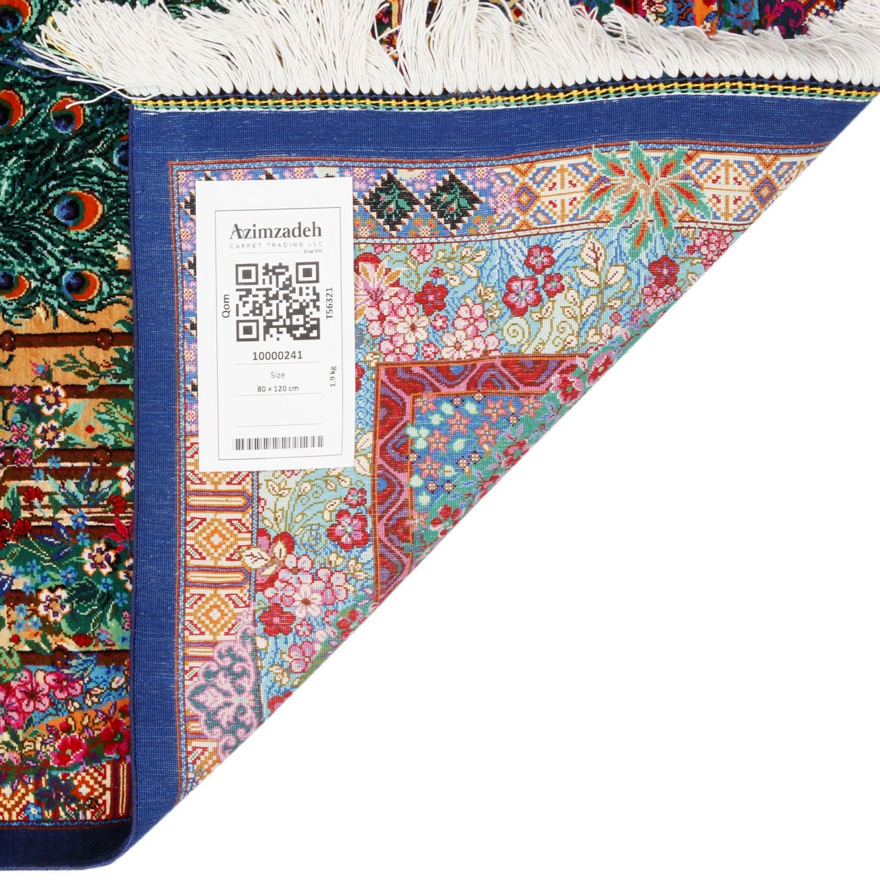 تأتي هذه السجادة اليدوية من قم، من حرير بالكامل وتحت علامة «فردوس»، بمقاس 80 × 120 cm (2'7" × 3'11") وبمساحة 0.96 m² (10.33 ft²). وبكثافة 10,000 عُقَد/دسم² (محوَّلة عن رج 70)، تُعدّ خيارًا لهواة الأصالة والجمال. يحمل التصميم الممتد، المستوحى من الطبيعة، نقش طاووس كبير في مركز الحقل يحوّل السطح إلى بستانٍ متخيَّل، مع ألوان متنوّعة متناغمة تبثّ روح الحياة في السدى واللحمة. وتُنشئ الأرضية الالوان وحافةٌ كحلية توليفةً فاخرةً ومتوازنة تمنح العمل عمقًا بصريًا ملحوظًا. ليست هذه السجادة رمزًا لفن السجاد القمّي فحسب، بل صورةً باقيةً لثقافة إيران وطبيعتها وجمالها.