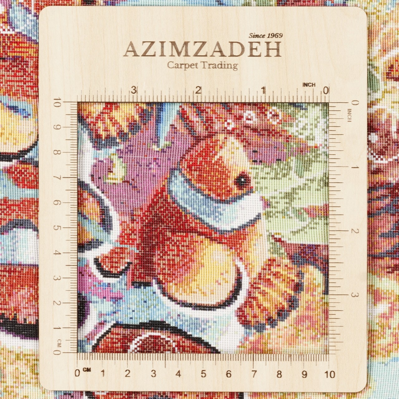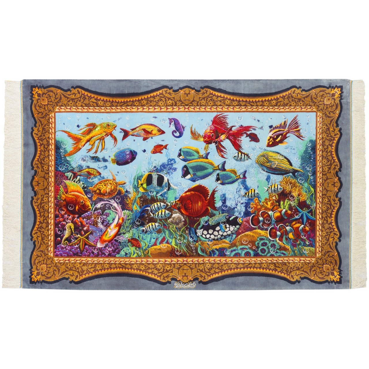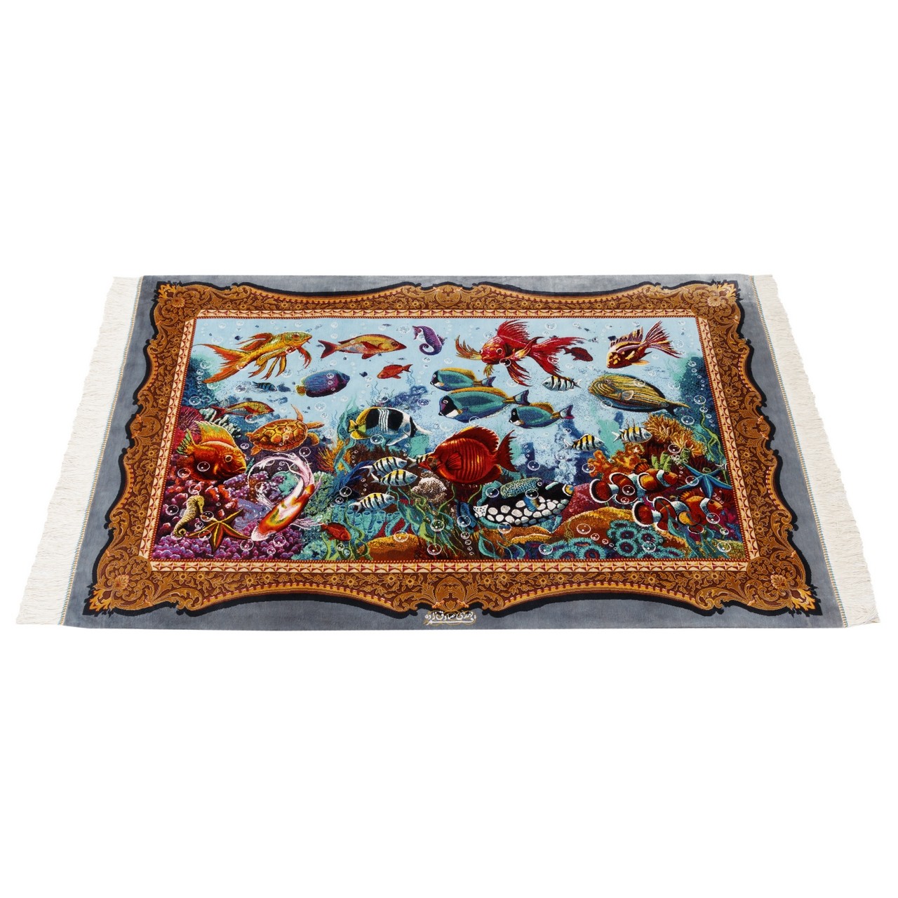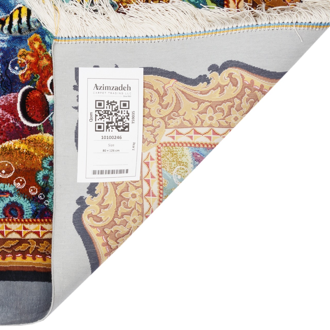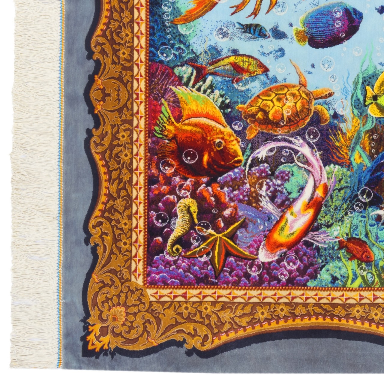 هذه السجادة اليدوية من حرير بالكامل من قم، منسوجة بكثافة تقديرية ≈ 11,500 عُقَد/دسم²، بمقاس 80 × 126 cm (2'8" × 4'2") وبمساحة 1.01 m² (10.87 ft²). صُنعت تحت علامة «مهدي صادق‌زاده» بتصميم ممتد تصويري بنقشة الأكواريوم، فتفتح نافذة إلى عالمٍ حُلْميّ في قلب المياه الصافية. يقدّم مشهد الأكواريوم عالمًا تحت الماء متخيّلًا—ينبض بالكائنات البحرية متعدّدة الألوان، والنباتات المرجانية، وجريان الماء اللطيف—ومرسومًا بتناغم ألوانٍ وخطوطٍ ناعمة تبعث سكينة لا تنتهي. تُنشئ الأرضية المتعدّدة الألوان مع حاشيةٍ بنّية كأنها إطارٌ خشبيّ تكوينًا مكتملًا. ويُضفي بريق الحرير الطبيعي حياةً على الماء ويجعل حضور الأسماك أكثر واقعية.