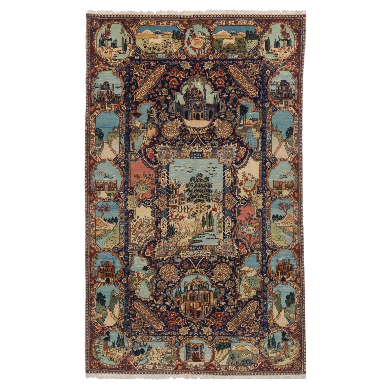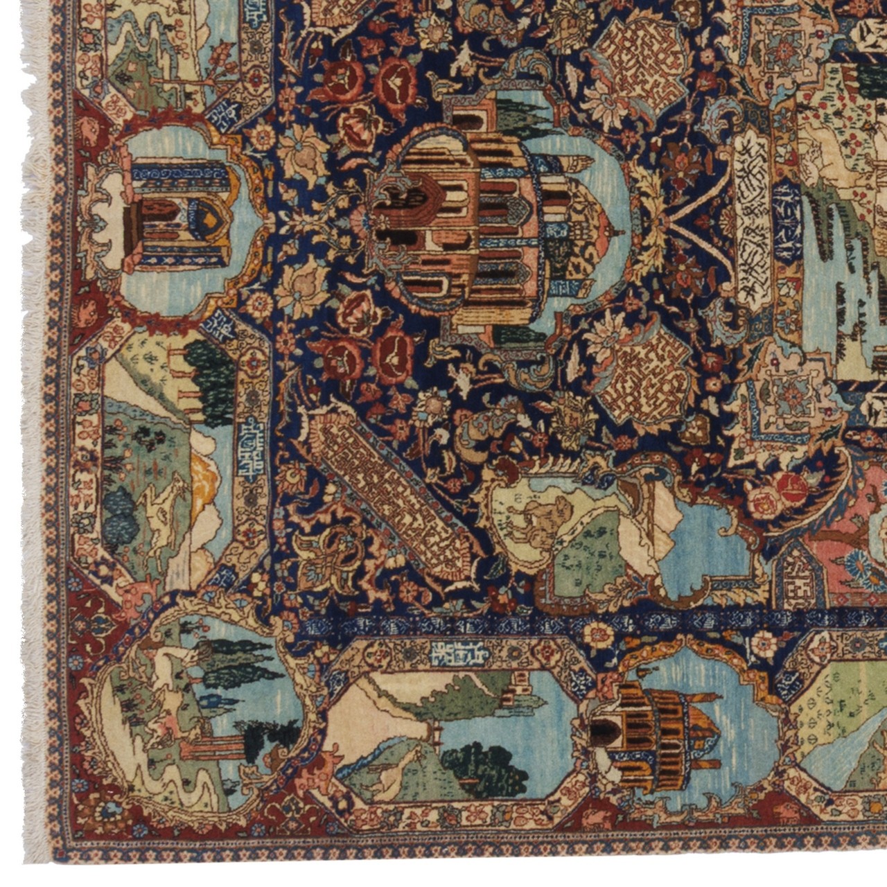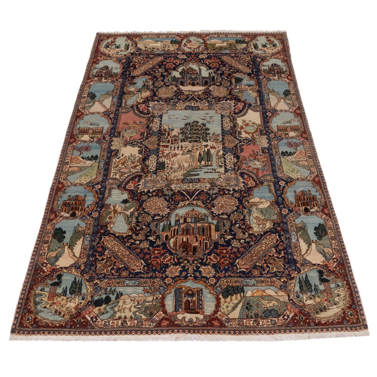 تجسّد هذه السجادة اليدوية من تبريز بتصميم ممتد ونقش تصويري أصالة فنّ النسج في المدينة. قياسها 160 × 265 سم (5'3" × 8'8") وبمساحة 4.24 م² (45.64 قدم²)، وهي خيار مدروس للمساحات ذات الذائقة الفنية والنَفَس الإيراني الأصيل. نُسجت بوبر من صوفٍ عالي الجودة مع سدى من القطن، فأتت ببنية متينة، متقنة ومريحة الملمس، تحمل دفء التقاليد إلى أجواء اليوم. كثافة العُقَد تقارب 5,100 عُقَد/دسم²، ما يمنح المشاهد التصويرية وضوحاً وحضوراً نابضاً. حقلٌ كحلي عميق مع إطارٍ أزرق يخلقان تضاداً كلاسيكياً هادئاً يذكّر بليالي إيران المفعمة بالسكينة والمعنى. تنساب الحكاية البصرية على السدى واللحمة كقصة صامتة—سواء كانت مشهداً طبيعياً، أو هيئةً بشرية، أو لحظة متخيلة—فتدعو العين إلى التأمل والقلب إلى الإصغاء.