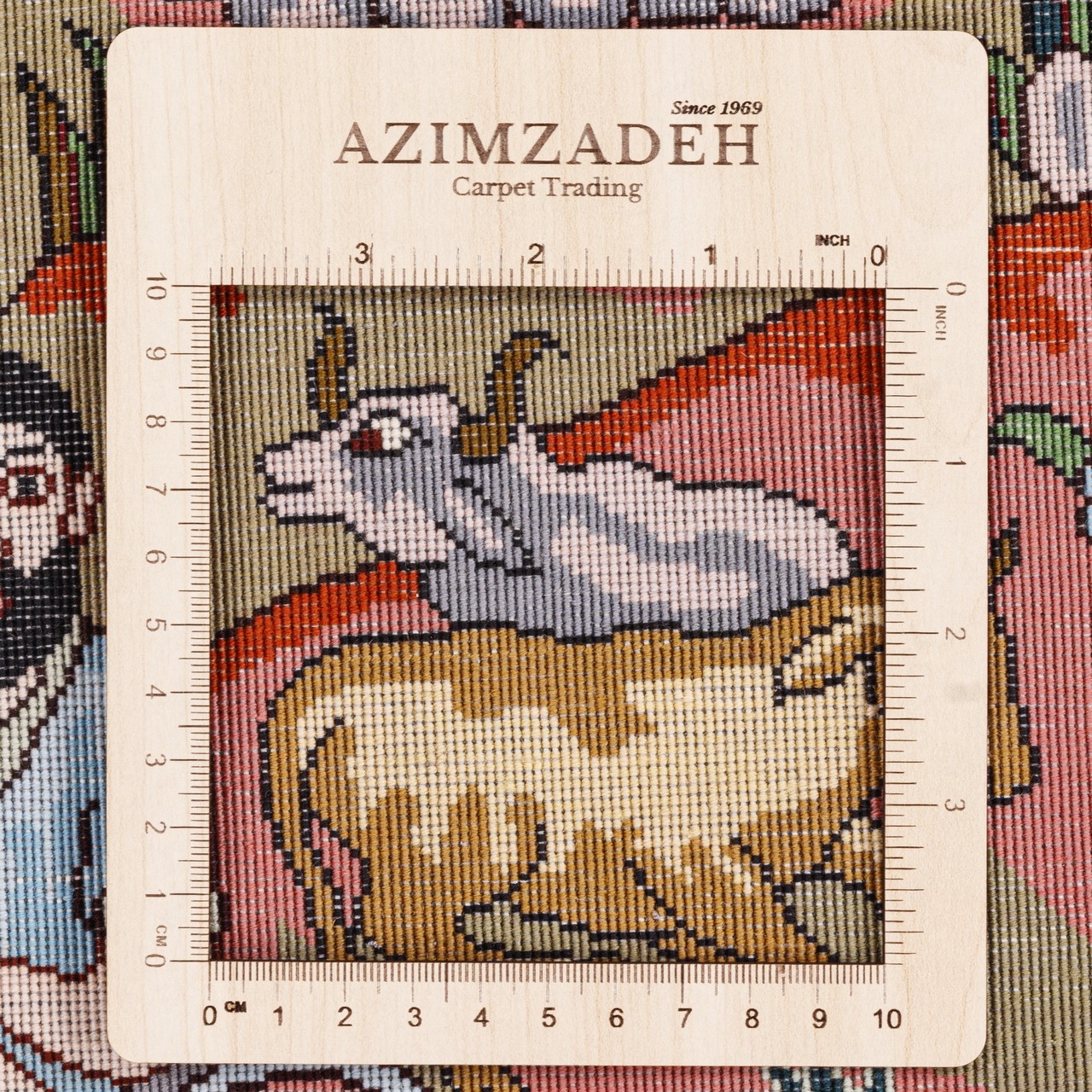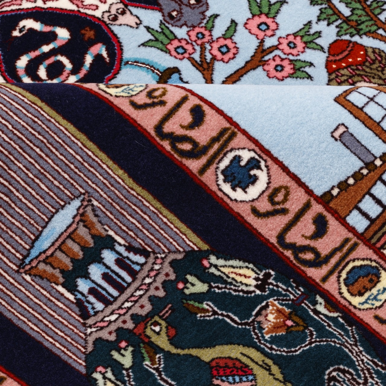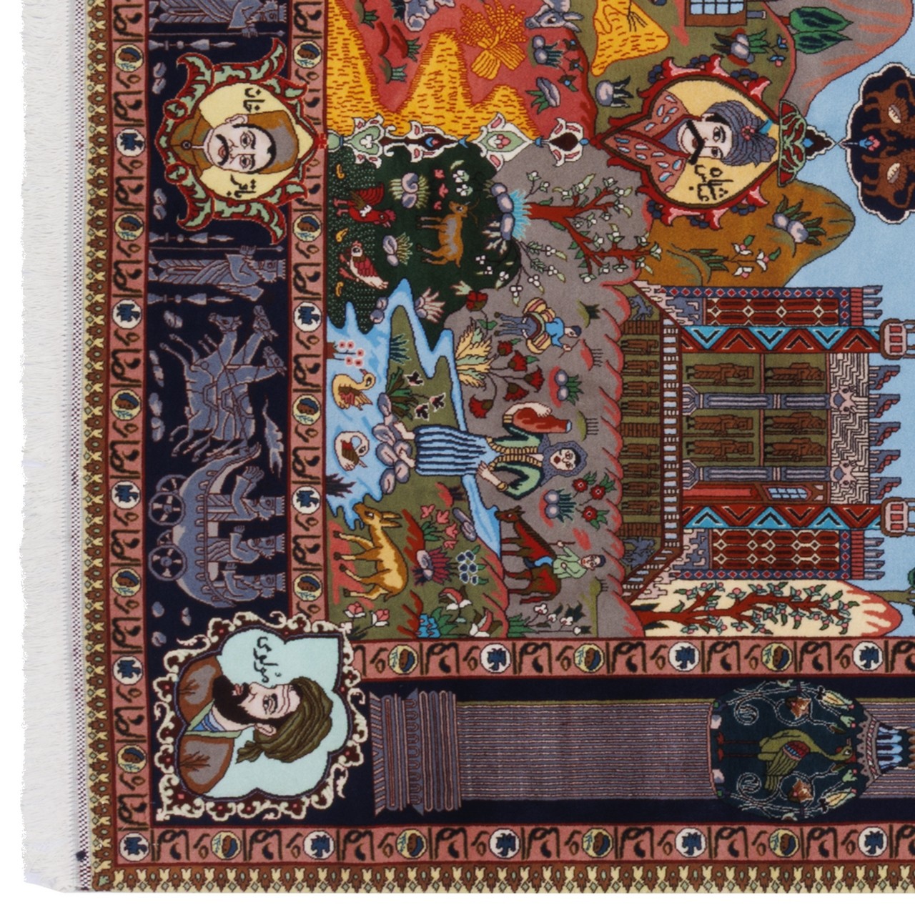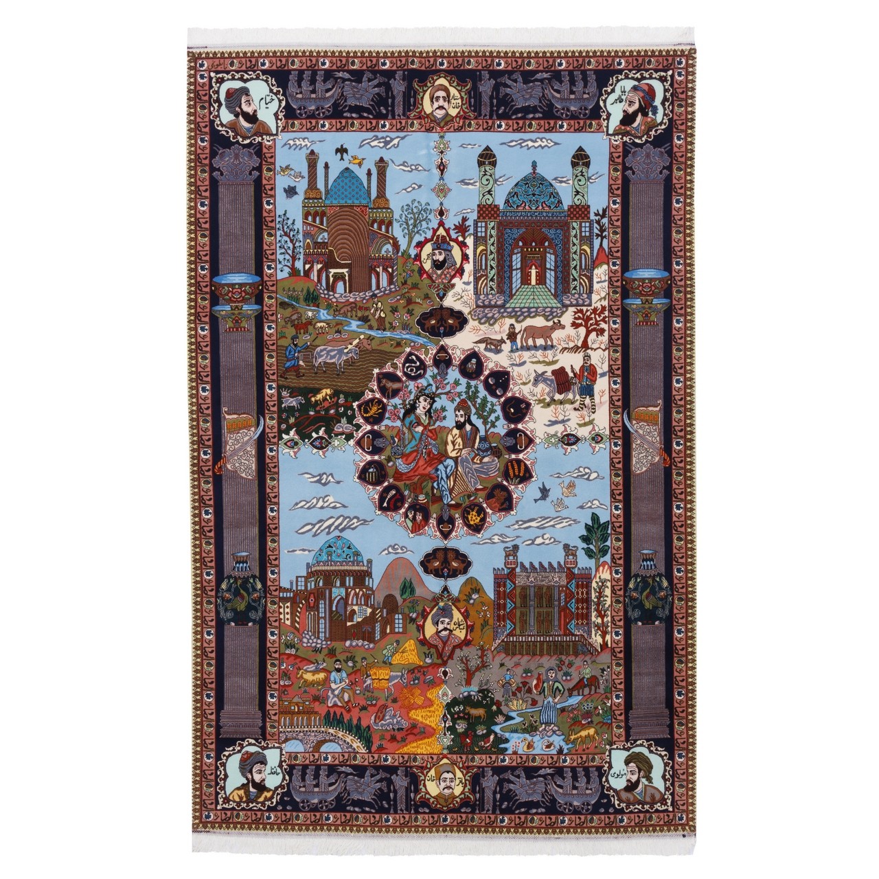 سجادة تبريز يدوية بنقش تصويري ممتد تجسّد روعة الفصول الأربعة. من علامة «فایطونچی»، تنبسط كستار واسع للحياة؛ من تبرعم الربيع إلى تساقط أوراق الخريف، ومن شمس الصيف إلى سكون ثلوج الشتاء. مقاسها 185 × 290 سم (6'1" × 9'6") وبمساحة 5.37 م² (57.80 ft²) وبكثافة تقارب 4,100 عُقَد/دسم²، ما يجعلها خيارًا مثاليًا لفضاءات ذات روح ثقافية وتنسيق فني متقن. في زواياها الأربع تُنسَج صور لشعراء إيرانيين، وعلى أعلى وأسفل الإطار تظهر هيئة أشخاص في عربات من العصر الأخميني، يُحتمل أنهم من الأشراف أو الممثلين. نُسجت من صوف مع سداة من خيط، فوفّرت بنية رصينة ودافئة وتقليدية تجمع بين النعومة وراحة اللمس من جهة، والمتانة العالية من جهة أخرى. حقل متعدد الألوان ضمن حاشية كحلية يخلق حضورًا متوازنًا لكنه نابضًا بالحركة—تناغمًا بين الوقار والحيوية يعكس موضوع الفصول الأربعة بصيغة بصرية بديعة. هذه السجادة رحلة بصرية عبر الزمن، وحكاية شاعرية عن التحول والاستمرارية—من قلب تبريز إلى أعماق روح المتلقي.