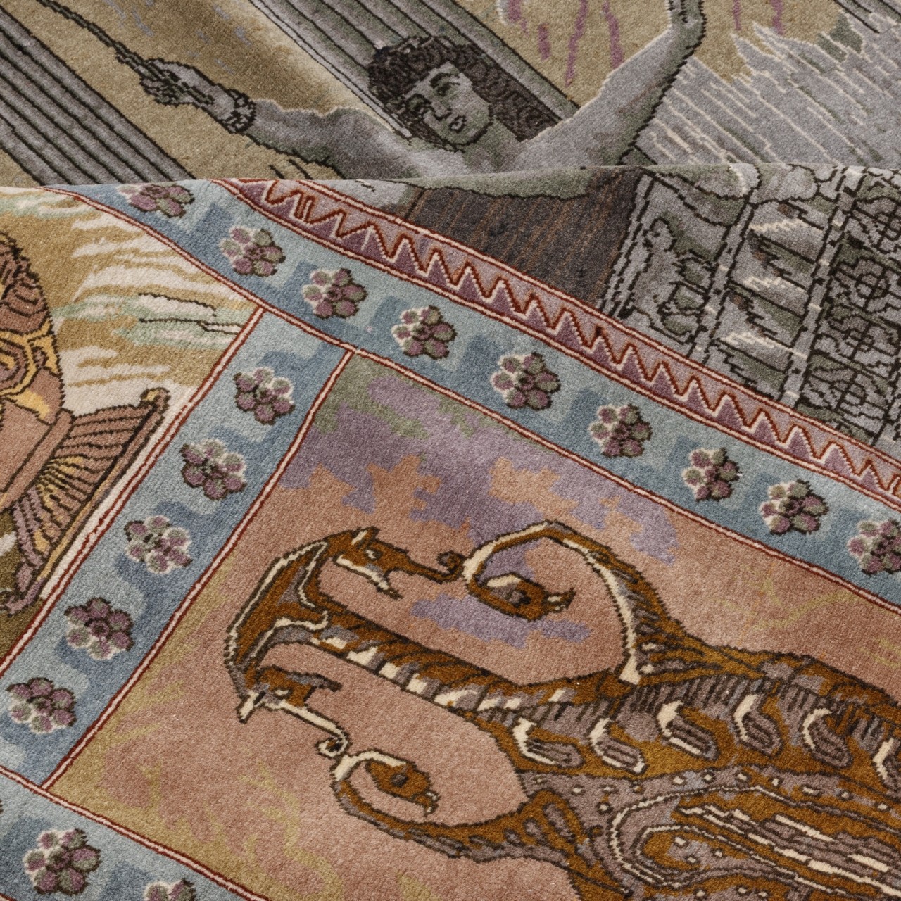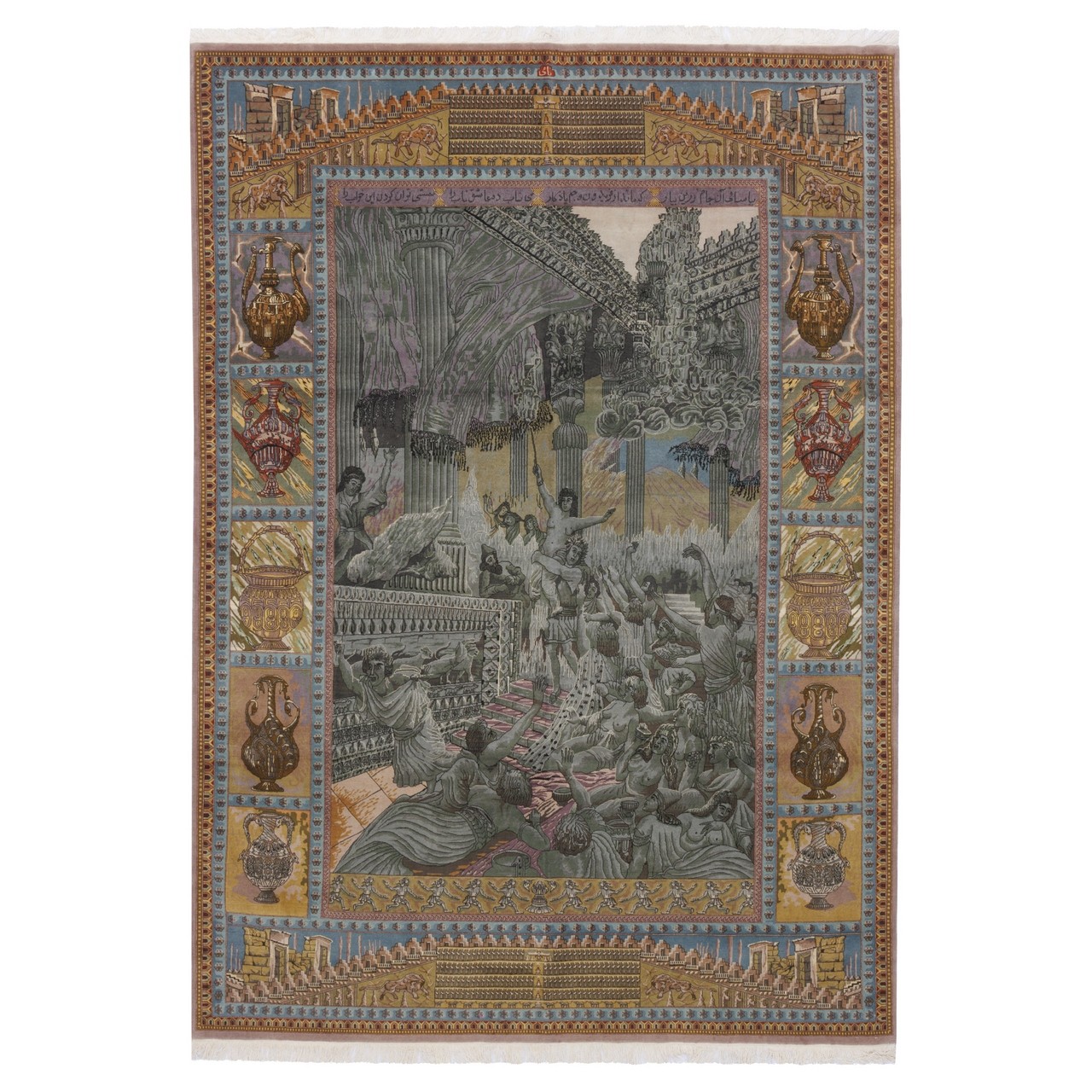 تندرج هذه السجادة اليدوية التصويرية ذات التصميم الممتد من تبريز، من علامة نامي، ضمن القطع التاريخية؛ فعُقَدها المنضبطة تقرأ ككلمات صامتة في سردٍ مفعم بالشجن. تبلغ أبعادها 195 × 277 سم (6'5" × 9'1") وبمساحة 5.41 م² (58.23 قدم²)، وتُجسّد مشهداً تاريخياً من «قصة إحراق تخت جمشيد»—إحدى أكثر لحظات تاريخ إيران مرارةً وعمقاً، تُستعاد رمزاً للفخامة في مواجهة الخراب، والكبرياء في مواجهة الطمع. وجوهٌ في حداد، ولهيبُ غضب، وعمارةٌ تنهار وما زال بهاؤها يأسر النظر، كلّها مُنفَّذة بدقة وانضباط. كثافة النسج تقارب 6,200 عُقد/دسم². ويوفّر تركيب الصوف مع سدى قطني ملمساً دافئاً وأصيلاً. أما الألوان المتعددة والرمادية في المتن والحاشية، فبتناغم مدروس تُكمل توتر السرد البصري—ألوان تهدأ حيناً وتتلظّى حيناً، على مثال الحكاية نفسها. هذه السجادة ليست عملاً فنياً فحسب؛ إنّها وثيقة بصرية لذاكرتنا الجمعية—لا لتُنسى، بل لتُستعاد—وتليق بكل فضاء تُقدَّر فيه القيمةُ للتاريخ والفن والهوية.