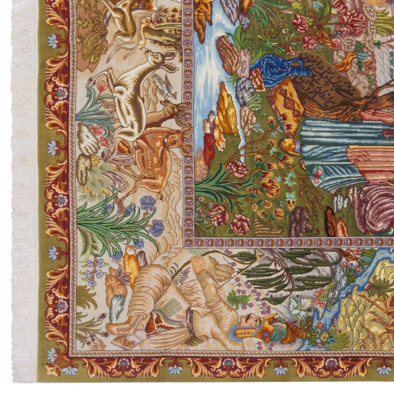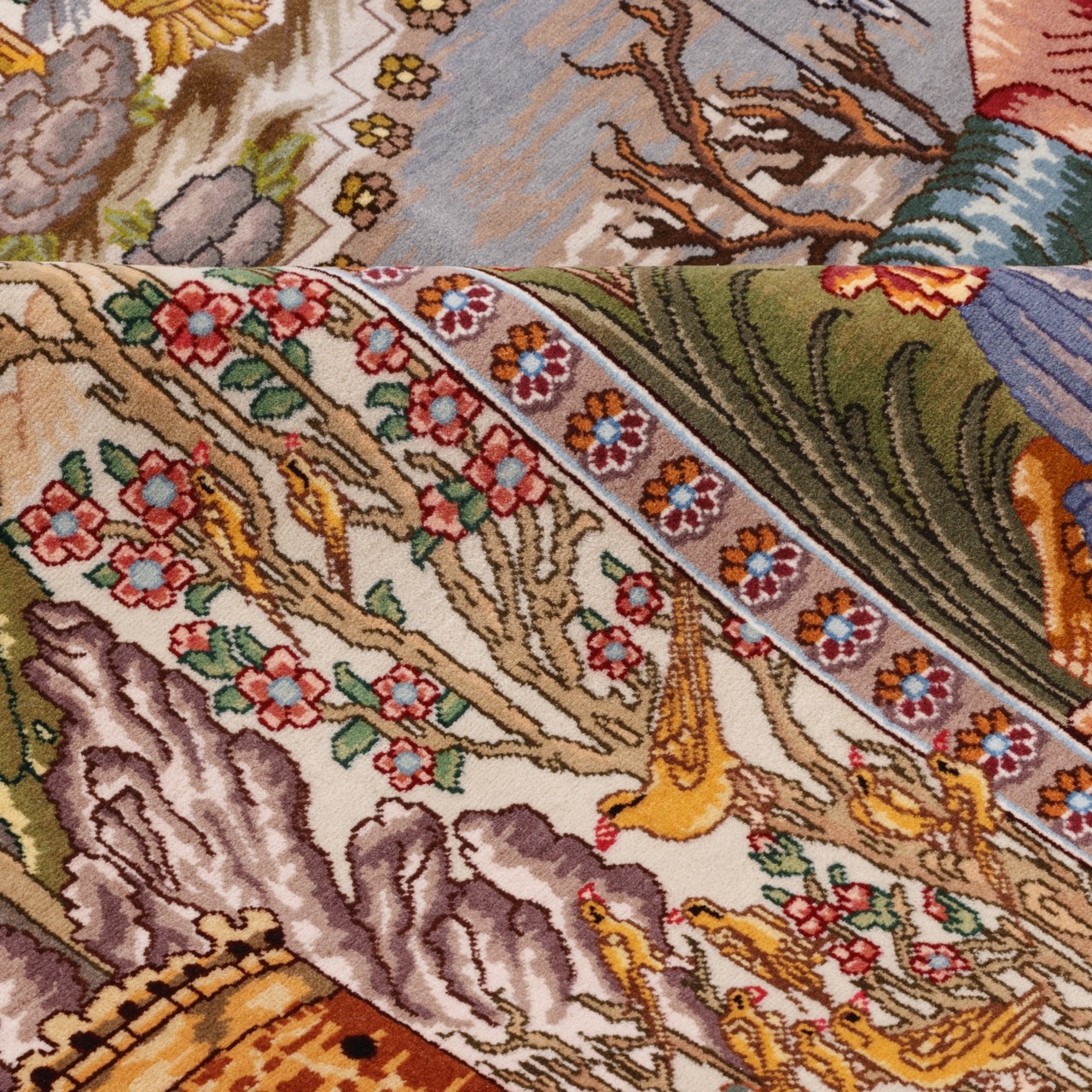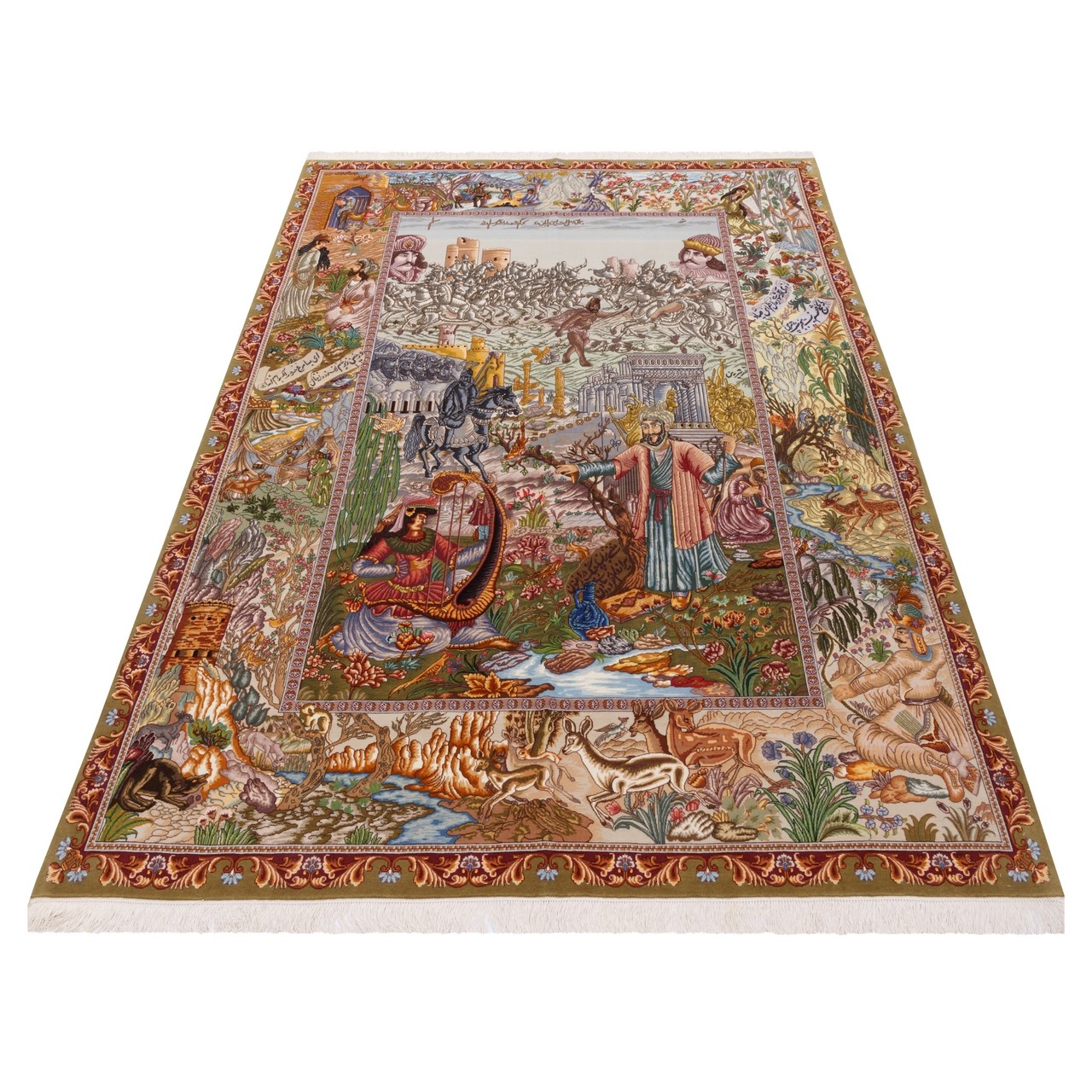 تسرد هذه السجادة اليدوية ذات التصميم التصويري الممتد أحد أكثر مشاهد الشاهنامه حماسة: «حرب تور وسَلْم». فالمشهد الأسطوري المأخوذ من قلم الفردوسي الخالد لا يُنسَج هنا فحسب، بل ينبض حياة على سطح السجادة. تبلغ أبعادها 200 × 300 سم (6'7" × 9'10") وبمساحة 6 م² (64.58 قدم²)، وتأتي بشكل مستطيل من علامة عبادي، كلوحة حيّة مفعمة بالحركة. وتبلغ كثافة النسج نحو 5,100 عُقد/دسم²، ما يضعها ضمن الأعمال الغنية بالتفاصيل حيث تُجسَّد الوجوه والخيول والأسلحة وميدان القتال بإيقاع منضبط ودقة واضحة. يوفّر تركيب صوف ناعم على سدى من حرير بنية متينة وملمساً مريحاً، ويمنح الألوان عمقاً وبريقاً مميزين. أما الأرضية والحاشية المتعدّدتا الألوان، فتنصهران بتناغم بارع، ليجتمعا على أجواء أسطورية تُعبّر عنها ألوان حيّة وموحية. ليست هذه السجادة مجرّد قطعة فاخرة؛ إنها مرآة للتاريخ الإيراني خُلِّدت بخيوط وألوان، فتجعل أي فضاء مسرحاً للثقافة والملحمة.