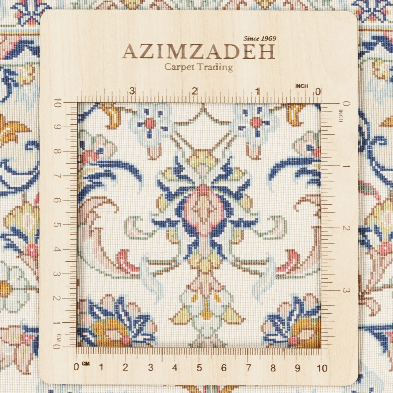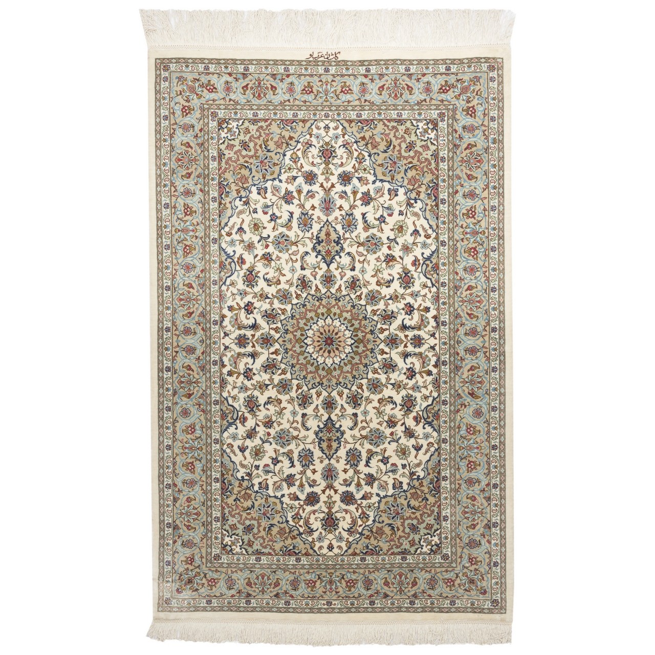 تأتي هذه السجادة بتصميم مدالية مع أركان بمقاس 80 × 120 cm (2'7" × 3'11") وبمساحة 0.96 m² (10.33 ft²). وتحمل علامة «عربلو» مع كثافة 10,000 عُقَد/دسم²، شاهدةً على رهافة ومهارة النسّاجين الكاشانيين. هذه السجادة من حرير بالكامل بتصميم المدالية مع الأركان وزخارفٍ زهريةٍ تنبض على أرضية كريمية اللون فتمنح المتلقي شعورًا بالسكينة. ويجسّد اللون الكريمي معاني النقاء والوقار، فيما يكوّن الإطار ذو الدرجة الترابية توليفةً دافئةً هادئةً وأصيلةً تعزّز إحساس العمق والاتساق في القطعة.