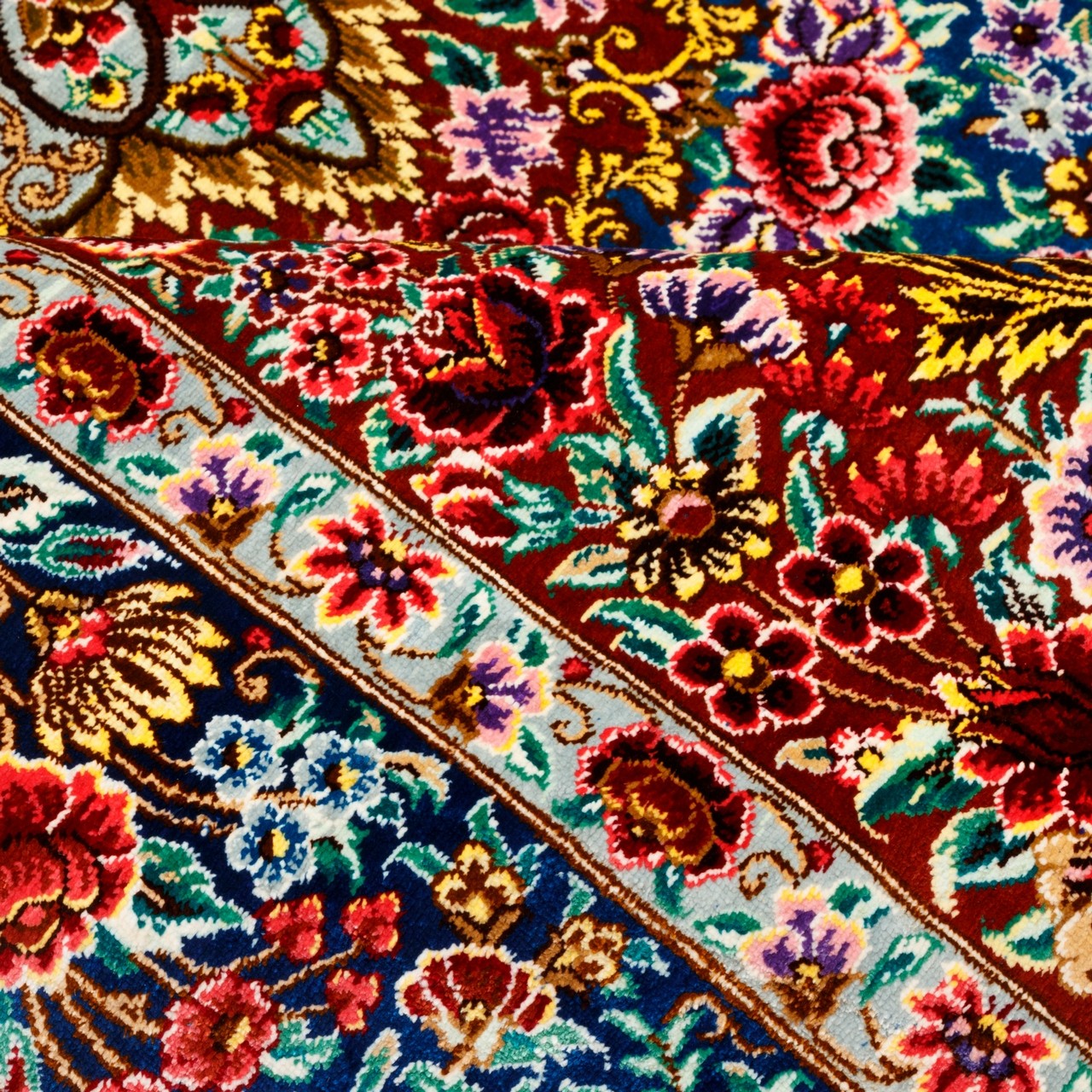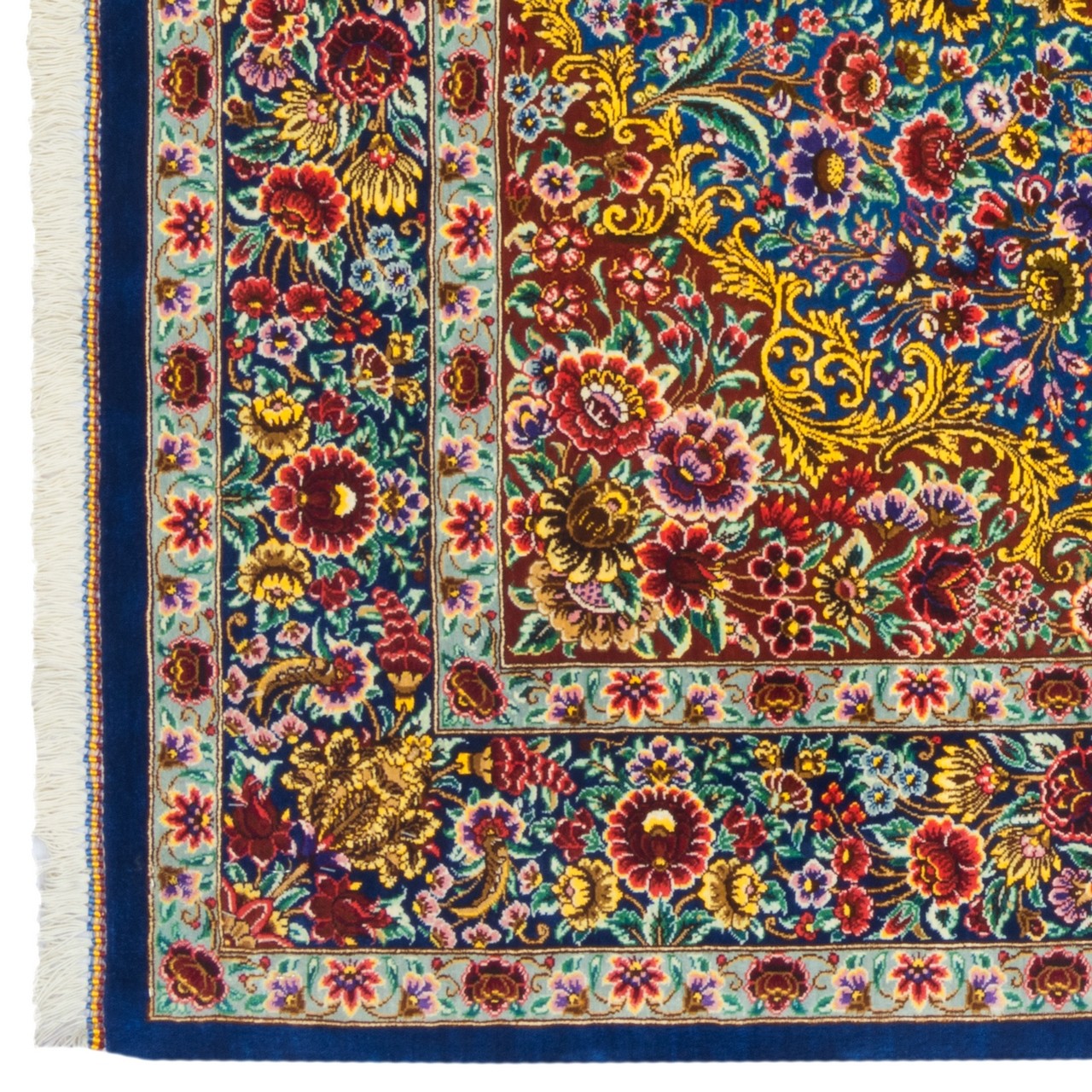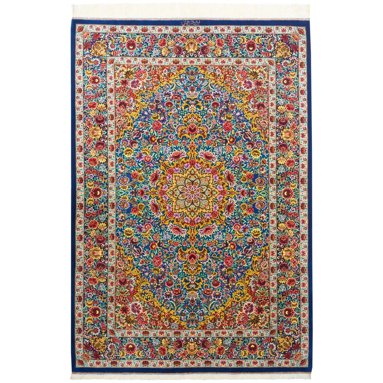 تأتي هذه السجادة اليدوية من قم بتصميم مدالية مع أركان من علامة «رحماني»، بمقاس 100 × 147 cm (3'3" × 4'10") ومساحة 1.47 م² (15.82 ft²). توفّر الأرضية الزرقاء الداكنة قاعدة هادئة لزخارف زهرية رفيعة. تتوسّطها مدالية متناظرة تمامًا تعانقها أربعة أركان متوازنة، فتمنح التكوين انسجامًا منظمًا. تنتثر الأزهار الدقيقة بتفاصيل ملوّنة كأن حديقةً تنبت داخل النسيج. كثافة النسج: 10,000 عُقَد/دسم². تؤطّر الحاشية السرماوية العميقة القطعة بتباينٍ لطيف مع المتن الأزرق الداكن. يمنح استخدام الحرير في النسج نعومةً ولمعانًا م+[@[توصیف انگلیسی]]ميّزين، ويرتقي بالسجادة إلى مستوى القطع المقتناة.