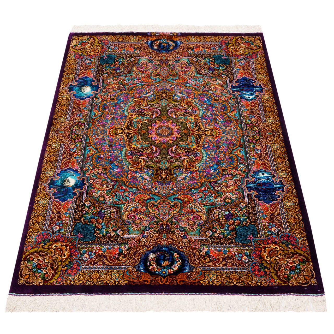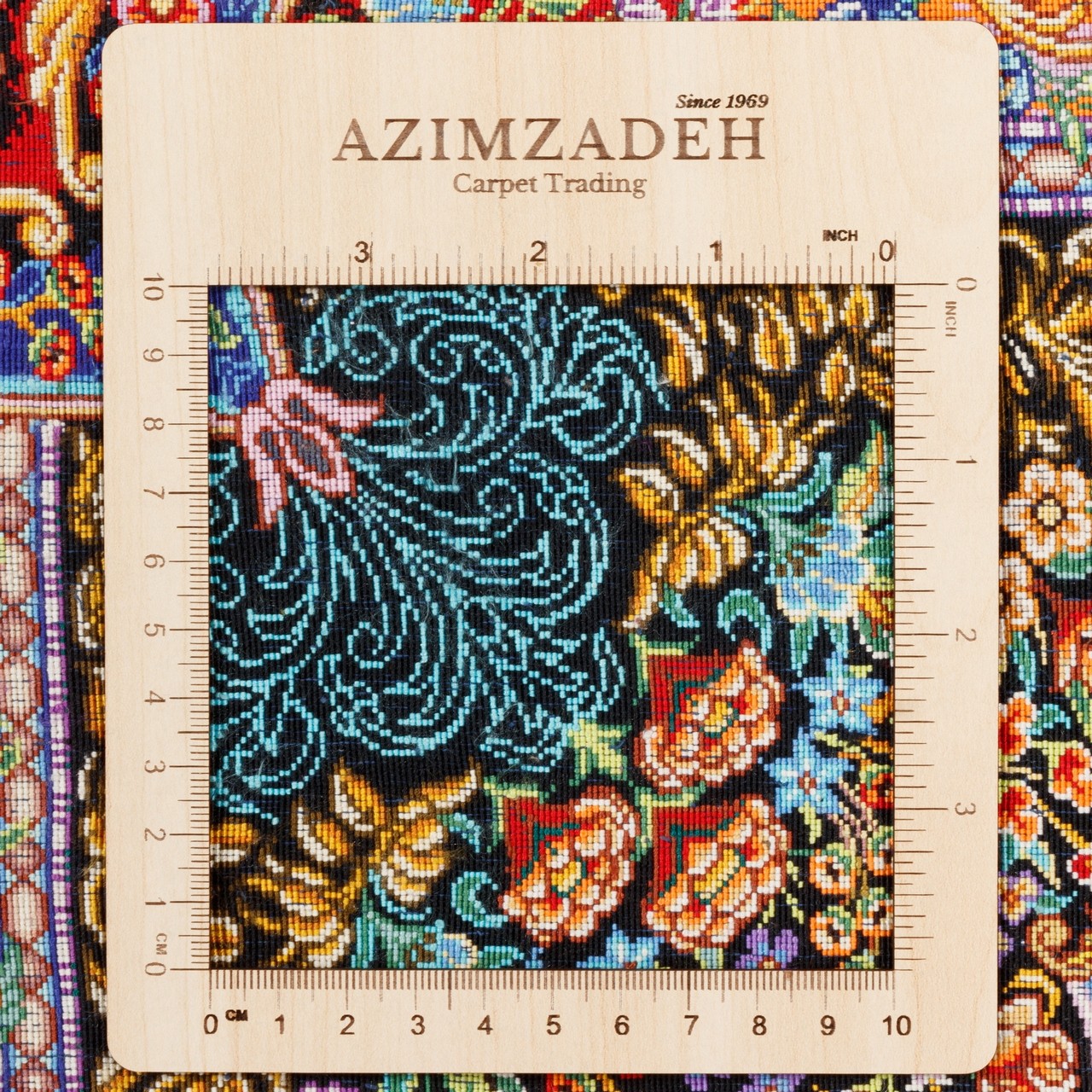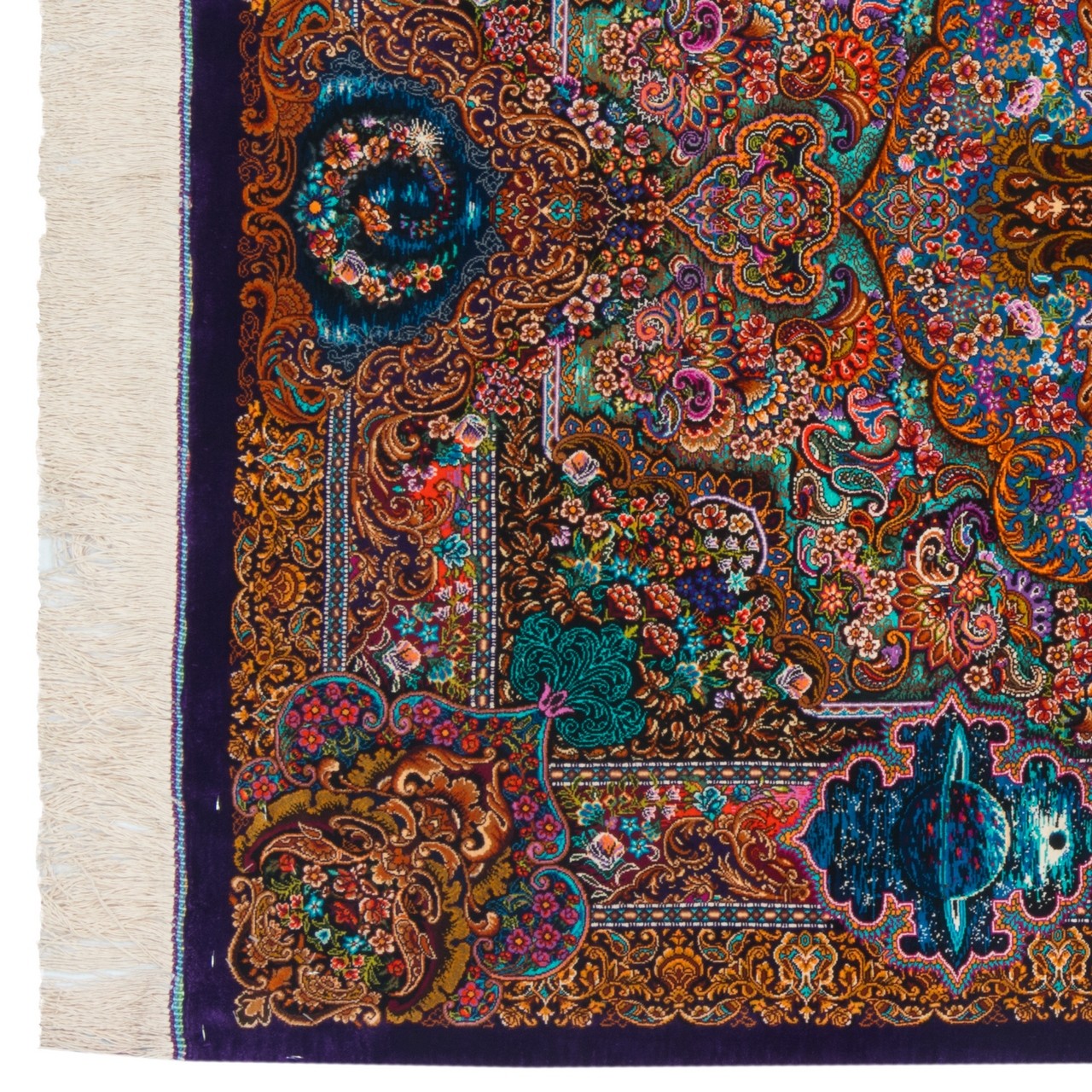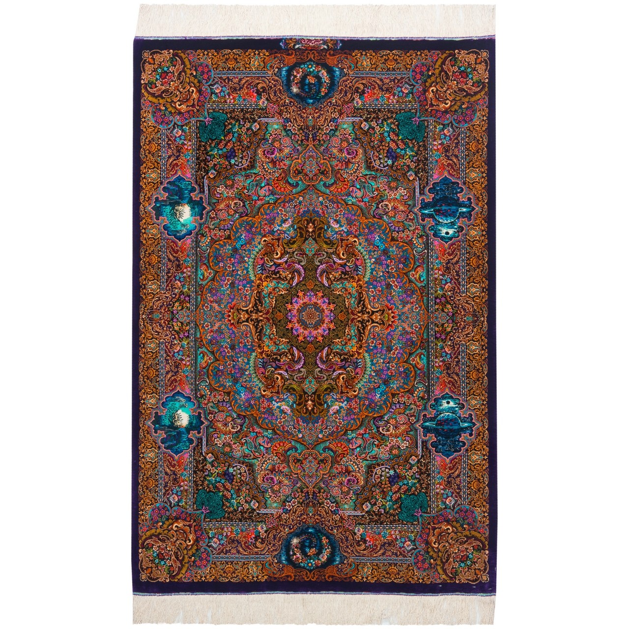 في الورشات الأصيلة والعريقة في قم، المدينة التي ارتبط اسمها بدقة نسج السجاد الحريري، نُسجت سجادة من حرير بالكامل بقياس 100 × 150 سم (3'3" × 4'11") وبمساحة 1.5 م² (16.15 ft²)، تُجسّد ذروة الإبداع والدقة لدى نسّاجي قم. يُعدّ هذا النموذج الفريد من النسج الدقيق، من إنتاج علامة «حسینمحمدي»، بكثافة نسج تقارب 11,500 عُقَد/دسم²، دليلاً على الصبر والبراعة الاستثنائية. تصميمها المدالية مع الأركان نُفّذ بمزيج متقن من الزخارف الزهرية والإسلامية (أسليمي). أما ألوانها الزاهية والمتنوعة، فهي كحديقة نابضة بالحياة، تبث الانتعاش والبهجة وتأسر أنظار كل من يتأملها. الميزة الاستثنائية لهذه التحفة تكمن في النقوش الفريدة التي زُيّنت بها أرضيتها وهوامشها: أزهار «گل فرنگ» الممزوجة بالأشكال الأسليمية تُذكّر برهافة فن المنمنمات الإيرانية؛ الزخارف الحلزونية والشمسية التي ترمز إلى المجرّة تعكس معنى العمق واللانهائية؛ وعلى وجه الخصوص، رسم كوكب زحل على الهوامش الذي يستحضر رمزياً ارتباط الإنسان بالأرض والكون. هذه السجادة ليست مجرد نسيج يدوي نفيس، بل تجسيد للخيال والفكر السامي.