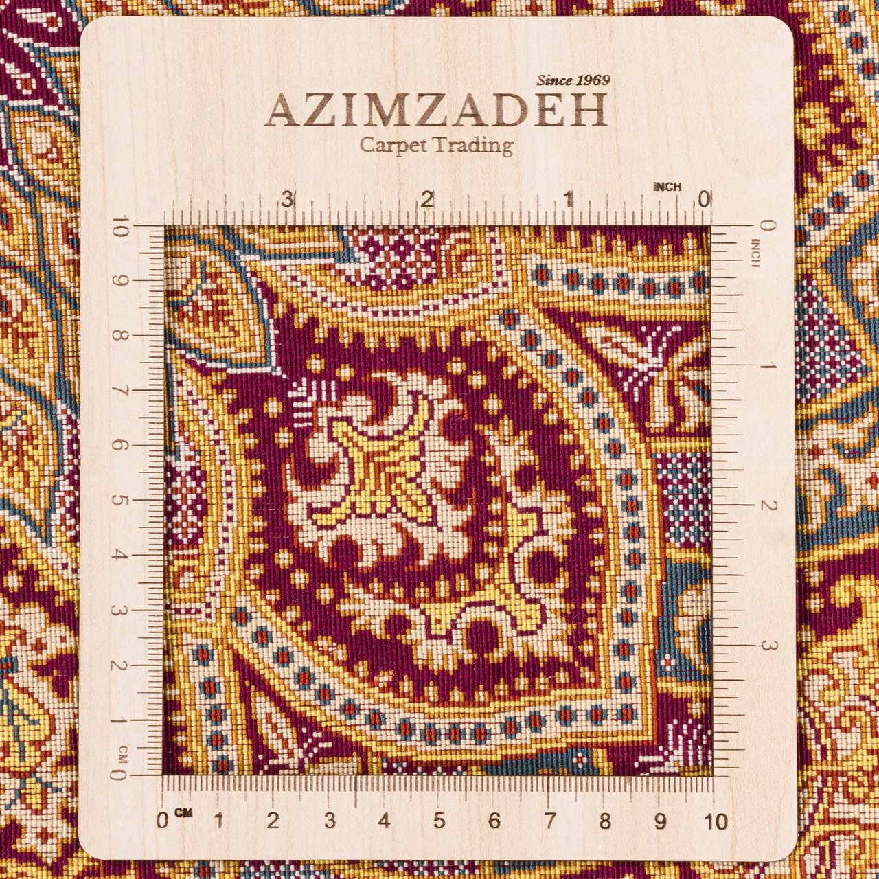 سجادة يدوية من حرير بالكامل من قم، بمقاس 100 × 153 سم (3'3" × 5'0") ومساحة 1.53 م² (16.47 ft²)، تأسر الناظر منذ الوهلة الأولى بتلألؤ ألوانها وتناسق زخارفها الكامل. نُسجت لعلامة «رضوي» بكثافة دقيقة تقارب 13,000 عُقَد/دسم²، وتقدّم مثالاً لافتاً لتصميم مدالية مع أركان يتفتح على أرضية قرمزية غنيّة، ببهاء إيراني ورؤية عصرية. تزدان المدالية والأركان بزخارف زهرية مُتقنة، كأن بستاناً ملوّناً قد أزهر في ليلٍ قرمزي. ويمنح التناسق بين المتن والحاشية المماثلة لوناً تماسكاً بصرياً ووقاراً خاصاً، فيما تضفي الألوان الثانوية والتدرّجات اللونية حركة لطيفة تسري في أنحاء التصميم.