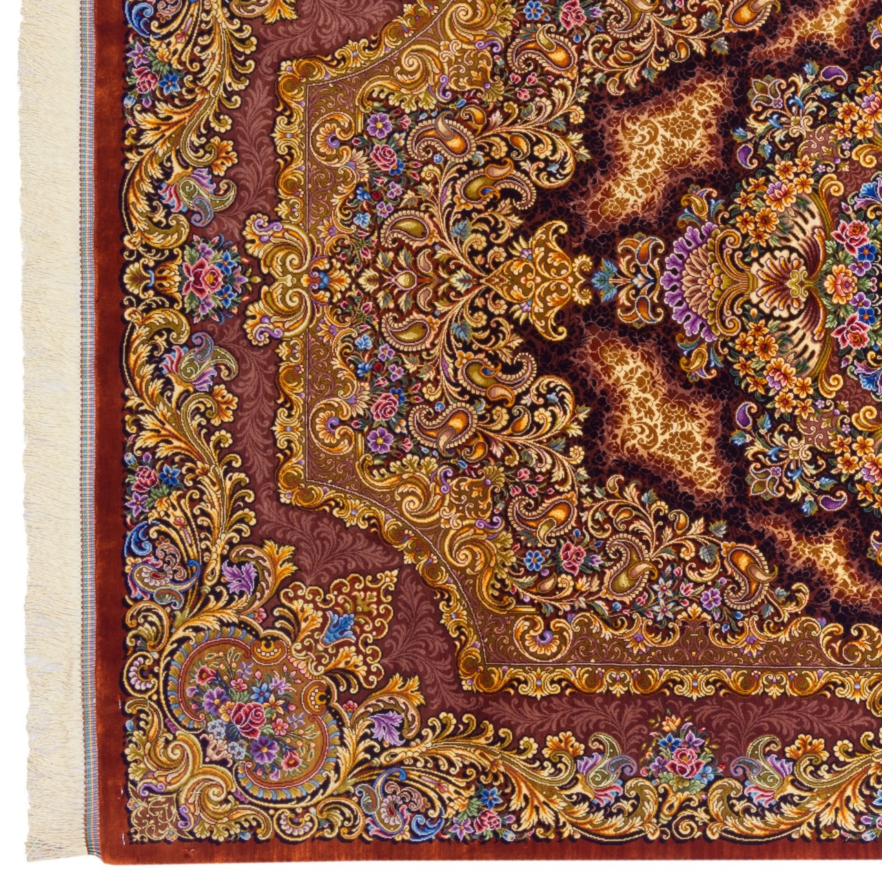 هذه السجادة الحريرية بالكامل من قم، بقياس 102 × 150 سم (3'4" × 4'11") وبمساحة 1.53 م² (16.47 ft²)، نُسجت بكثافة استثنائية تبلغ نحو 13,000 عُقَد/دسم²؛ وهو إنجاز لا يتحقق إلا على يد نسّاجي قم المهرة ودليل على الفن في أعلى مستوياته. من إنتاج علامة «مجيد محرري»، يجمع تصميمها المدالية مع الأركان بين البُنى الكلاسيكية للسجاد الإيراني وزخارف البُته (البيزلي)، ليمنحها هوية تمزج بين الأصالة والحداثة. في هذا النسيج، لا يُجسّد البُته رمز الحياة والاستمرارية فحسب، بل من خلال التكرار المتناغم والتواءاته الإيقاعية يستحضر إيقاع الطبيعة والخليقة ذاتها. أرضيتها الملوّنة، كحديقة رباعية الفصول، تُشكّل خلفية نابضة بالحياة ومتنوعة لهذه الزخارف، فيما يضفي الإطار العنّابي إشراقاً مهيباً ووقاراً ملكياً عليها. إنها سجادة نفيسة تُعدّ تحفة فنية للاحتفاء بالثقافة والفن والجمال الإيراني في أرقى وأغنى صوره.