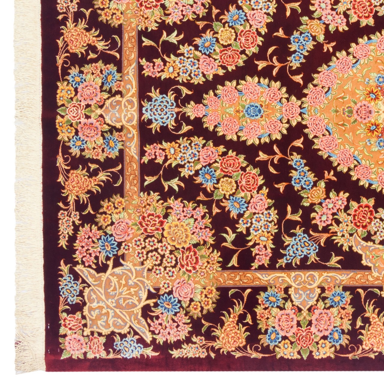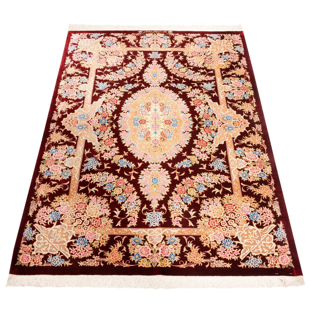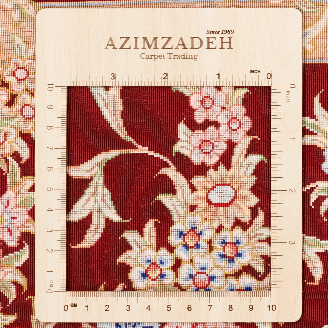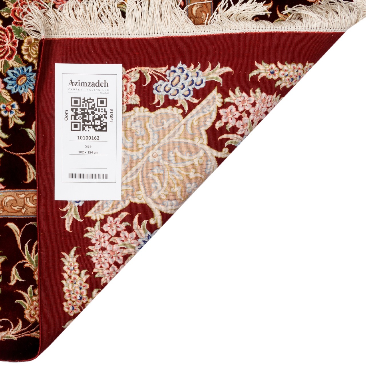 في مدينة قم، التي اشتهرت منذ القدم بأنها مهد أدقّ السجاد الحريري في إيران، أُبدِعَت تحفة بديعة تحت اسم علامة فرش «صادقي». منسوجة بتصميم أصيل من مدالية مع أركان، يعبّر كل عقد منها عن الذوق والصبر والفن الإيراني الأصيل. هذه السجادة من حرير بالكامل، بمقاس 102 × 154 سم (3'4" × 5'1") ومساحة 1.58 م² (17.01 ft²)، تُعَدّ من النماذج النادرة في عالم سجاد قم الحريري. بكثافة نسج تبلغ نحو 11400 عُقَد/دسم²، تُمثّل قمّة الدقة والمهارة؛ عُقَد دقيقة وصغيرة هي ثمرة أيادٍ بارعة وعيون فاحصة. الأرضية الزركشية العميقة المتوهجة، بوقارٍ ملكي، شكّلت خلفية مثالية للمدالية المركزية والأركان المتناظرة. المدالية الوسطى، برهافة مدهشة، تشكّل بؤرة النظر، فيما الأركان المنسوجة بإتقان تنبض بانسجام ودقة. تنتشر الزخارف الزهرية، برسمٍ دقيق وألوان متناغمة، على أرضية الزركشية كما النسيم الربيعي، فينثر على اللوحة حيويةً ورقة. أما الحاشية، فجاءت بلون مماثل للأرضية، اختيار جريء وفني يجعل السجادة أكثر فخامة وتكاملاً. إن استخدام الحرير منحها ليس فقط نعومة فريدة، بل بريقاً دائماً وخلوداً استثنائياً. إنها سجادة من قم لأولئك الذين يبحثون عن الجمال في عمق اللون، وتوازن الزخارف، ودقة النسج؛ عمل يزيّن ليس الأرض فقط، بل القلوب أيضاً.