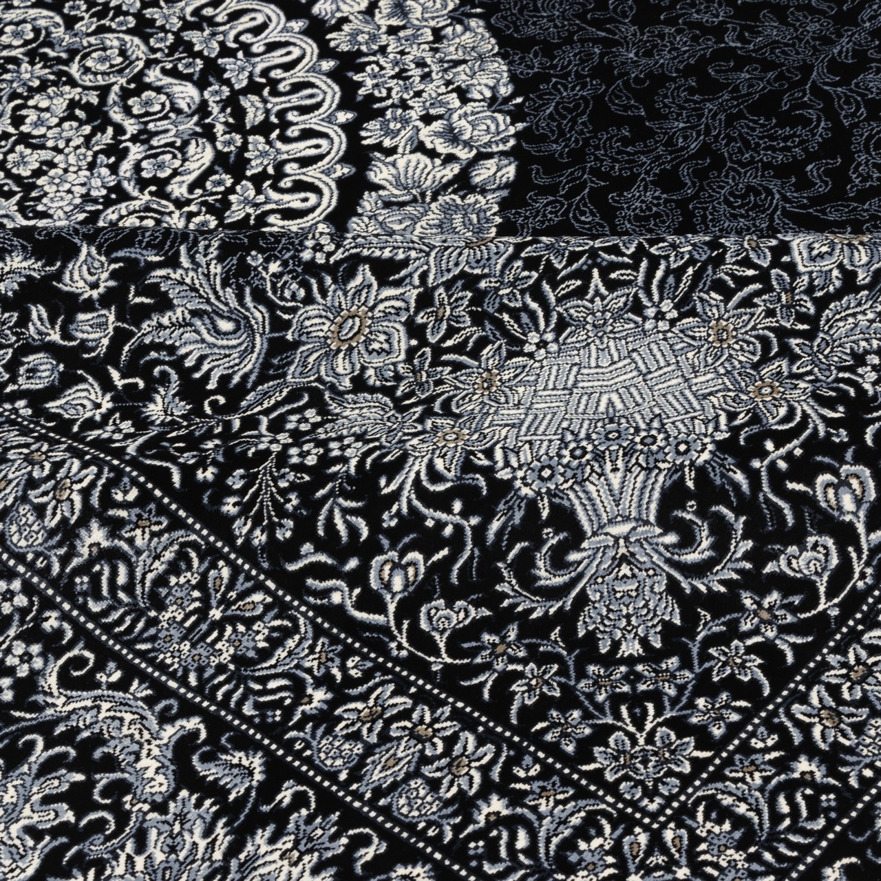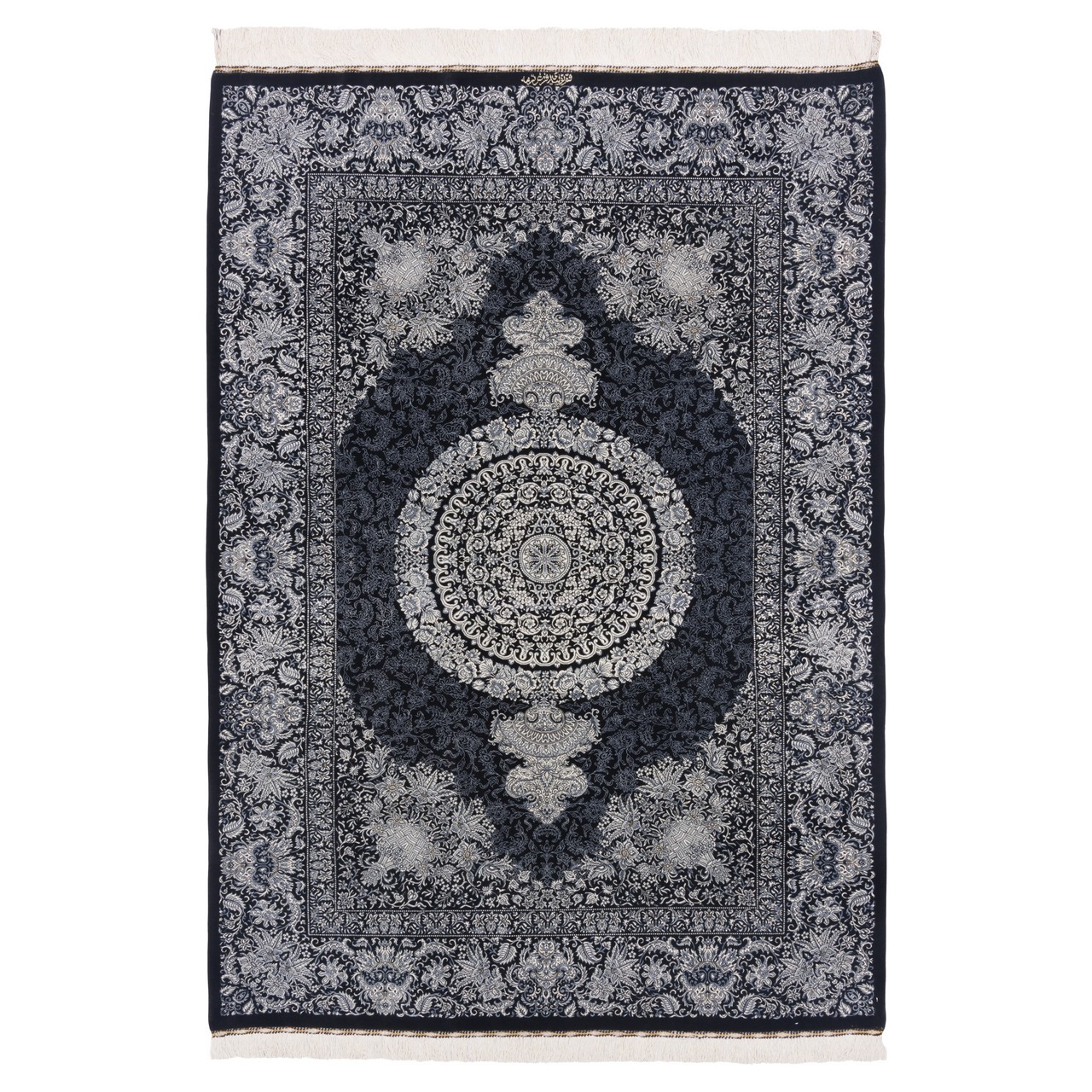 هذه السجادة اليدوية من قم بقياس 139 × 197 سم (4'7" × 6'6") وبمساحة 2.74 م² (29.49 قدم²). نُسجت بتصميم مدالية مع أركان. هذه القطعة المصنوعة من حرير بالكامل، بعلامة «ترمه» وبكثافة تقارب 10,000 عُقَد/دسم²، تُجسّد تعبيراً مدروساً عن الحرفة الرفيعة. يظهر التكوين بلون كحلي موحّد في الحقل والحاشية، وهو اختيار يمنح الفضاء إحساساً بالوقار والعمق والأصالة. يوفّر الحقل الكحلي مسرحاً مثالياً لتألّق الزخارف الزهرية الحيّة؛ فهي، المستوحاة من حدائق متخيّلة، تنتشر على كامل السجادة برهافة وتوازن، فتضفي طابعاً رصيناً ومنسجماً على العمل كله.