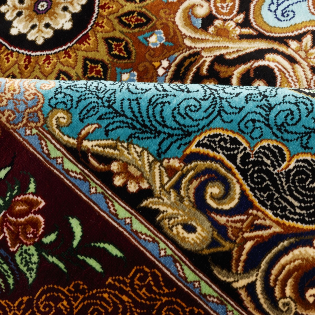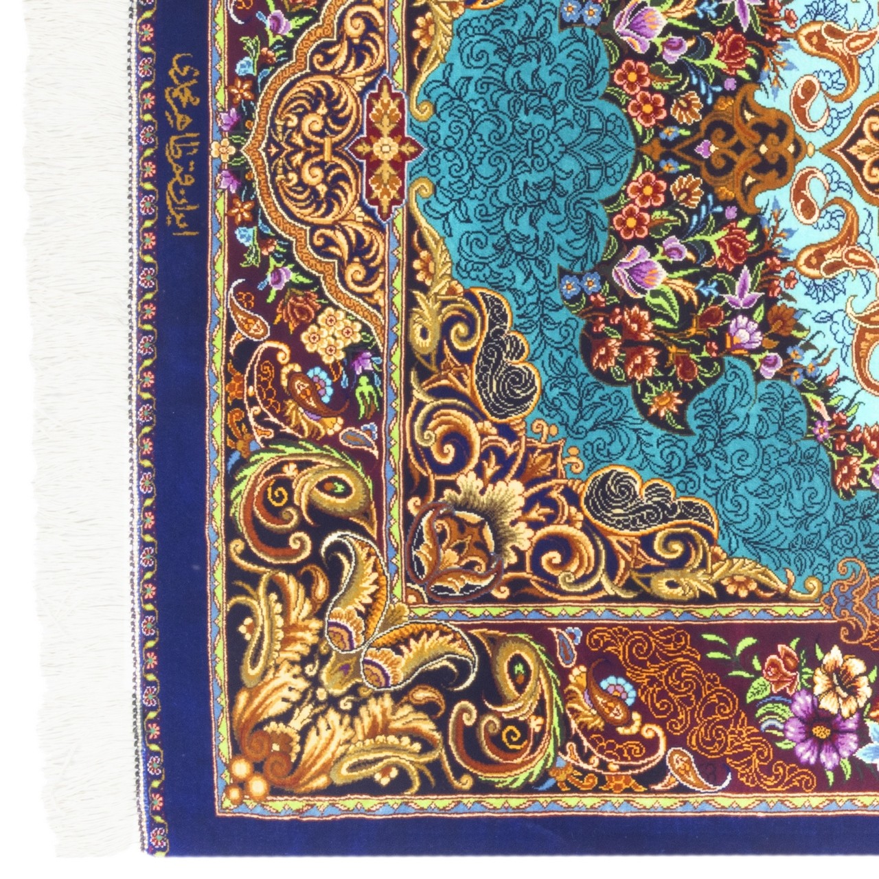 تأتي هذه السجادة اليدوية من قم بتصميم مدالية مع أركان، بمقاس 120 × 80 cm (3'11" × 2'7") وبمساحة 0.96 m² (10.33 ft²). نُسجت من حرير بالكامل تحت علامة «طاهر محمدي» بكثافة 10,000 عُقَد/دسم²، حيث يعكس كل عقدة مهارة النسّاجين الدقيقة. ينطلق تصميم المدالية مع الأركان من جذور الرسم والتذهيب الإيرانيين، ويُعاد تقديمه هنا بزخارف زهرية بإتقان. وتأتي عناصر البُته (البيزلي) في المدالية المركزية متناغمةً مع التفاف الزهور والتقابل الهندسي، لتُنتِج سجادة تجمع بين الأصالة ورهافة شاعرية. تُضفي الأرضية الفيروزية—الهادئة والمشرقة—روحًا متجددة على البناء التقليدي، فيما يطوّقها إطار كحلي كقابٍ مهيب. وهكذا يُعاد تعريف تصميم المدالية مع الأركان لا بوصفه قالبًا كلاسيكيًا فحسب، بل لغةً معاصرةً لسرد الجمال.