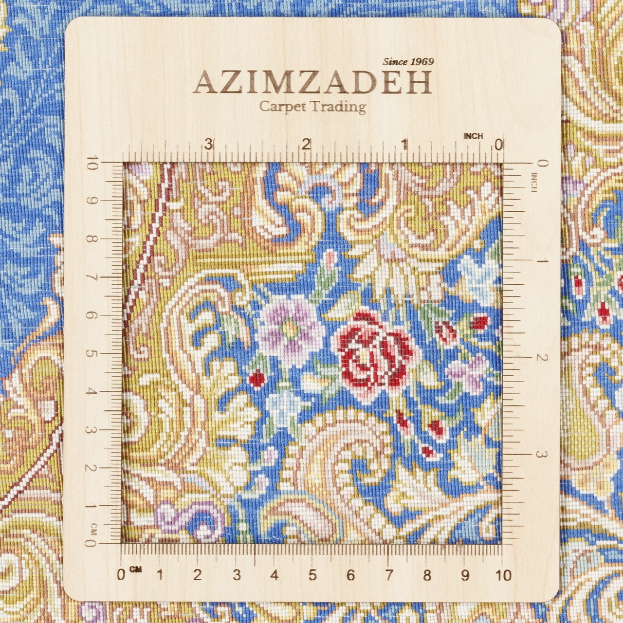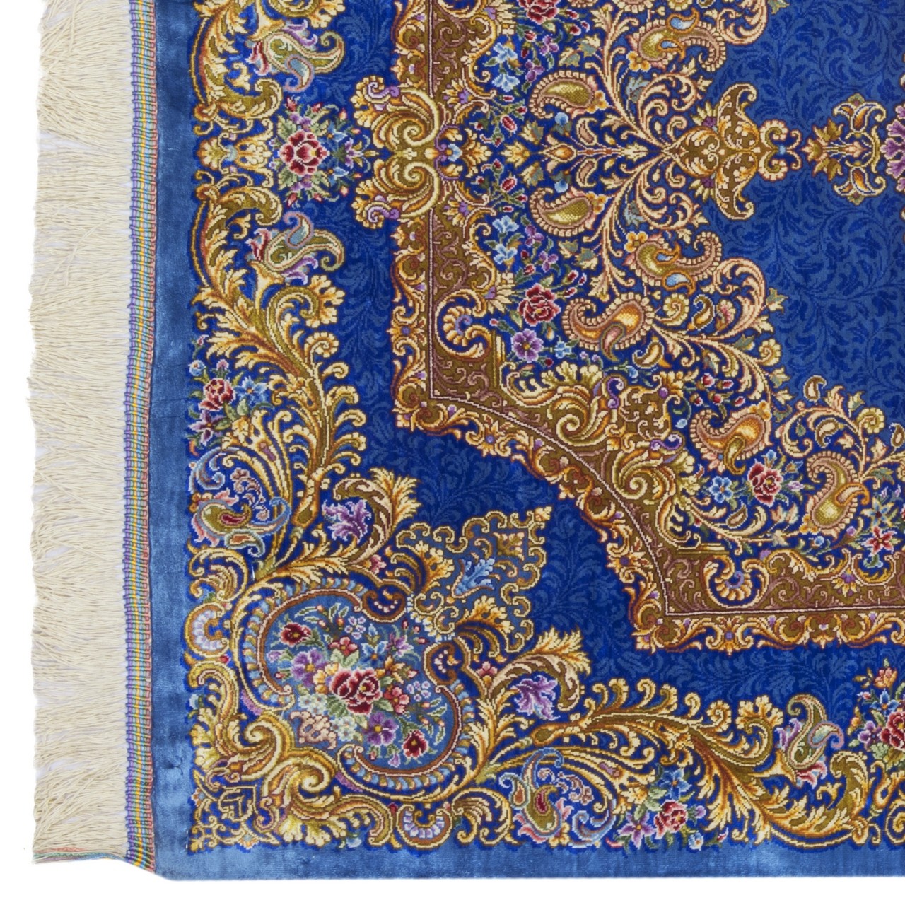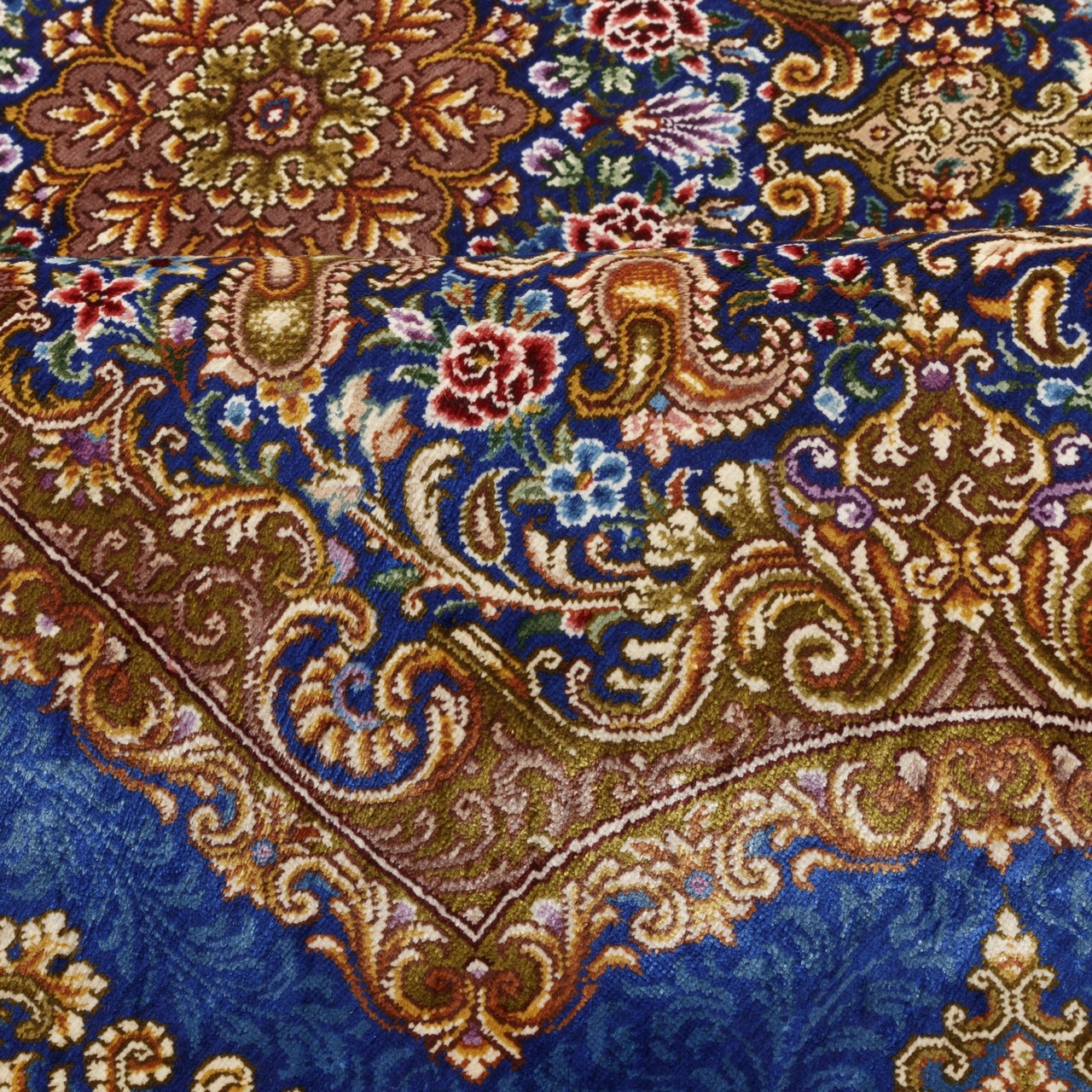 تأتي هذه السجادة اليدوية من قم بمقاس 122 × 82 cm (4'0" × 2'8") وبمساحة 1.01 m² (10.87 ft²). نُسجت من حرير بالكامل تحت علامة «مجيد محرّري» بكثافة تقديرية ≈ 11,400 عُقَد/دسم²، فتجسّد الدقة والرهافة وفن نسج السجاد الإيراني. يتألّق تصميم المدالية مع الأركان بتناسق من الزهور الدقيقة والزخارف المتشابكة كحديقة مثالية على أرضية زرقاء؛ لونٌ يكتمل مع حافةٍ متجانسة ليبلغ السكون والوقار غايتهما. واستخدام أطيافٍ متنوّعة من الأزرق لا يضفي على السجادة فخامة فحسب، بل يستحضر أيضًا عمق السماء ورقّة البحر.