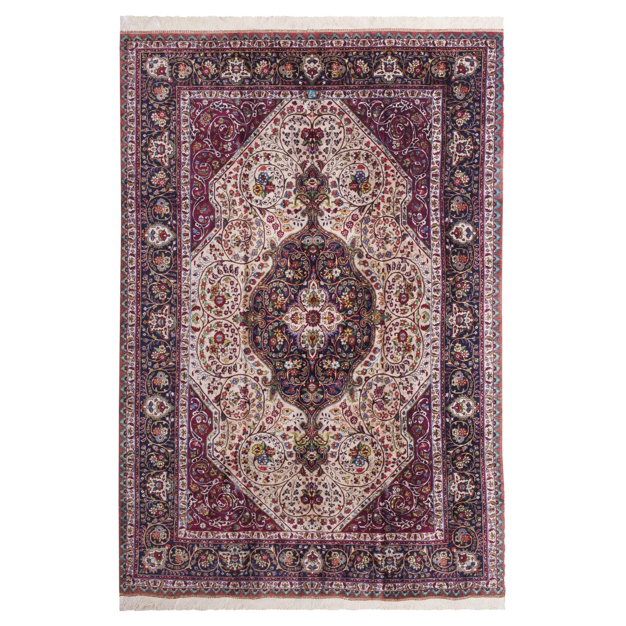 هذه السجّادة من تبريز المصنوعة من حرير بالكامل بعلامة «فارغ»، بتصميم «مدالية مع أركان»، تُذكّر بحدائق إيران المتخيَّلة؛ حيث تنتظم الأزهار بتناغمٍ موزون حول مداليةٍ مركزية فتأخذ الناظر إلى عالمٍ من النظام والفخامة. وهي مستطيلة الهيئة بمقاس 140 × 206 سم (4'7" × 6'9") ومساحة 2.89 م² (31.11 قدم²)، لتكون خيارًا مثاليًا للأماكن التي ترغب في إظهار هويةٍ شرقيةٍ ببهاءٍ مميّز. وبكثافة تقارب 4,100 عُقَد/دسم²، يثبت كلّ عقدٍ في موضعه بدقّة، فتظهر السجّادة في توازنٍ بهيّ وتفاصيل متقنة. ويُحدث اجتماع أرضيةٍ كريمية مع حاشيةٍ كحلية تباينًا فنّيًا يُمتع البصر ويثير إحساسًا بالعمق والأصالة.