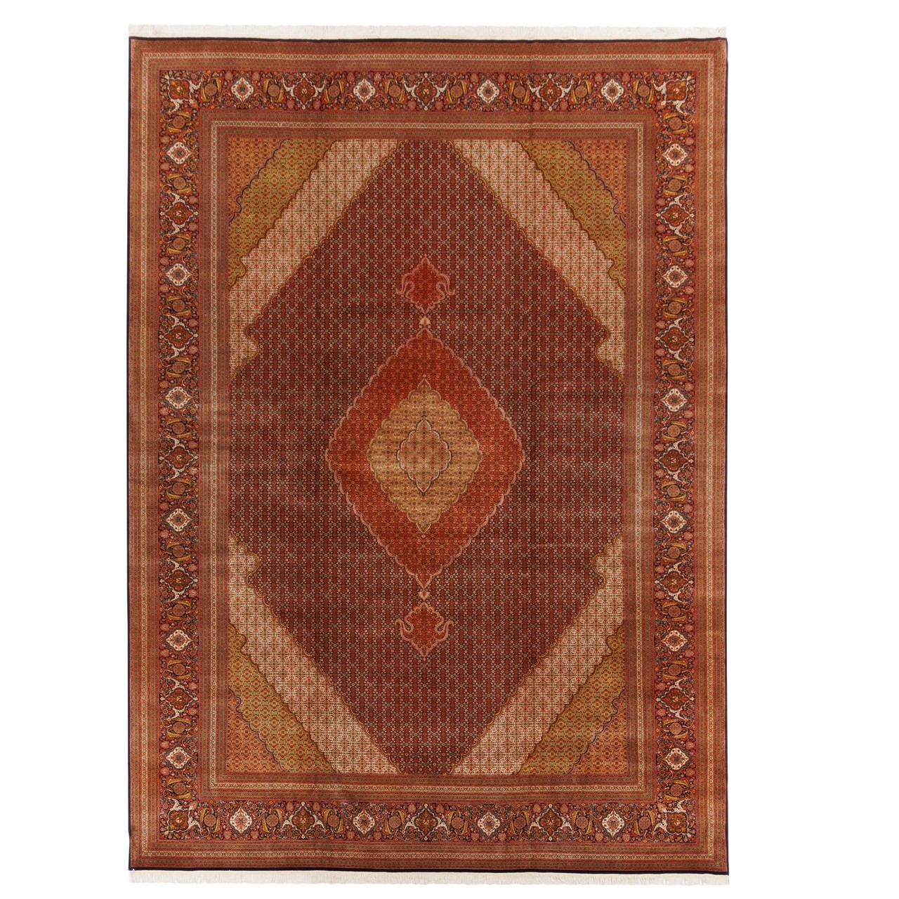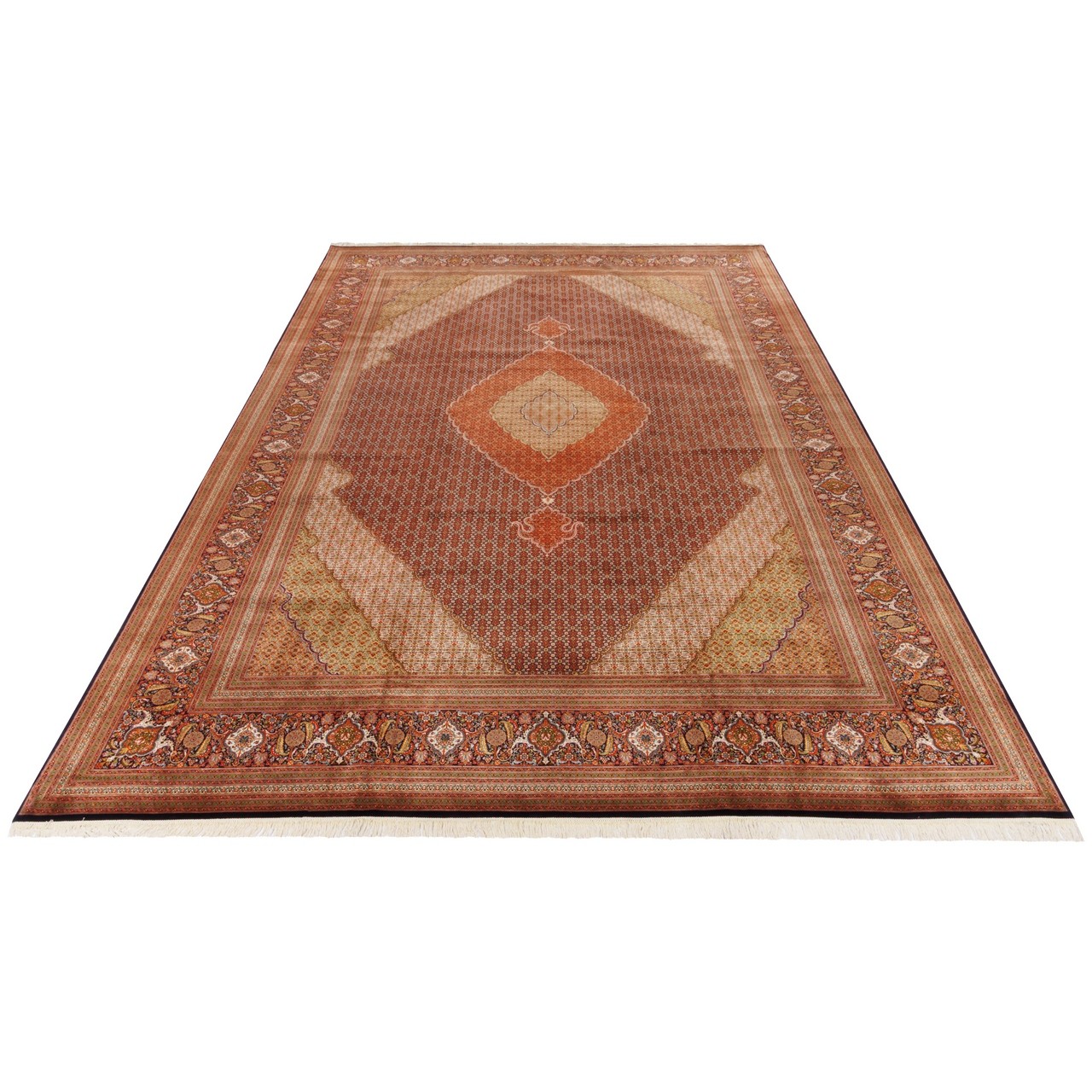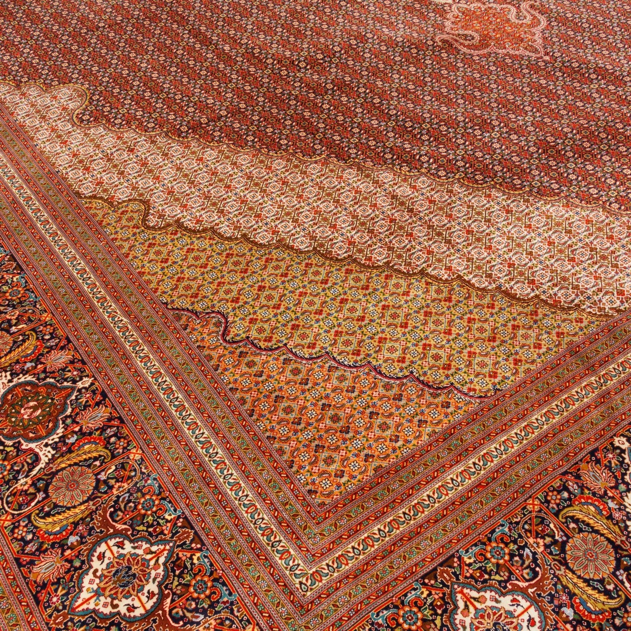 سجادة يدوية ، تصميم زاوية وترنج، حرير و سدى قطني، تبريز، 353 × 487 سم الكود 11700710