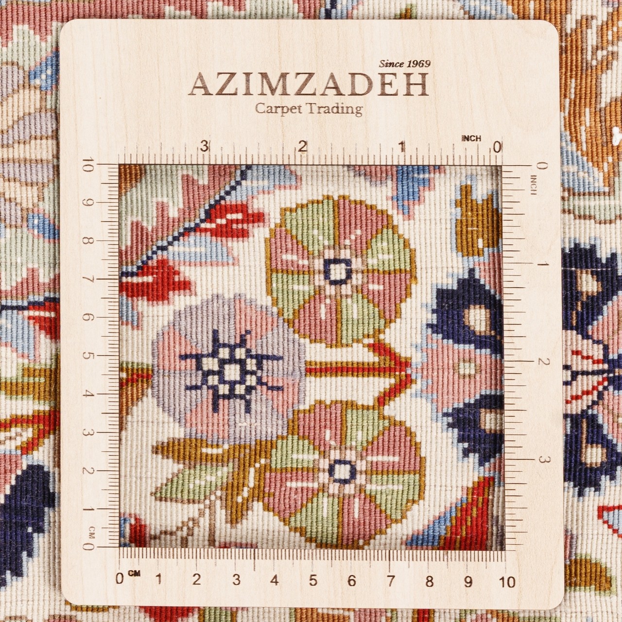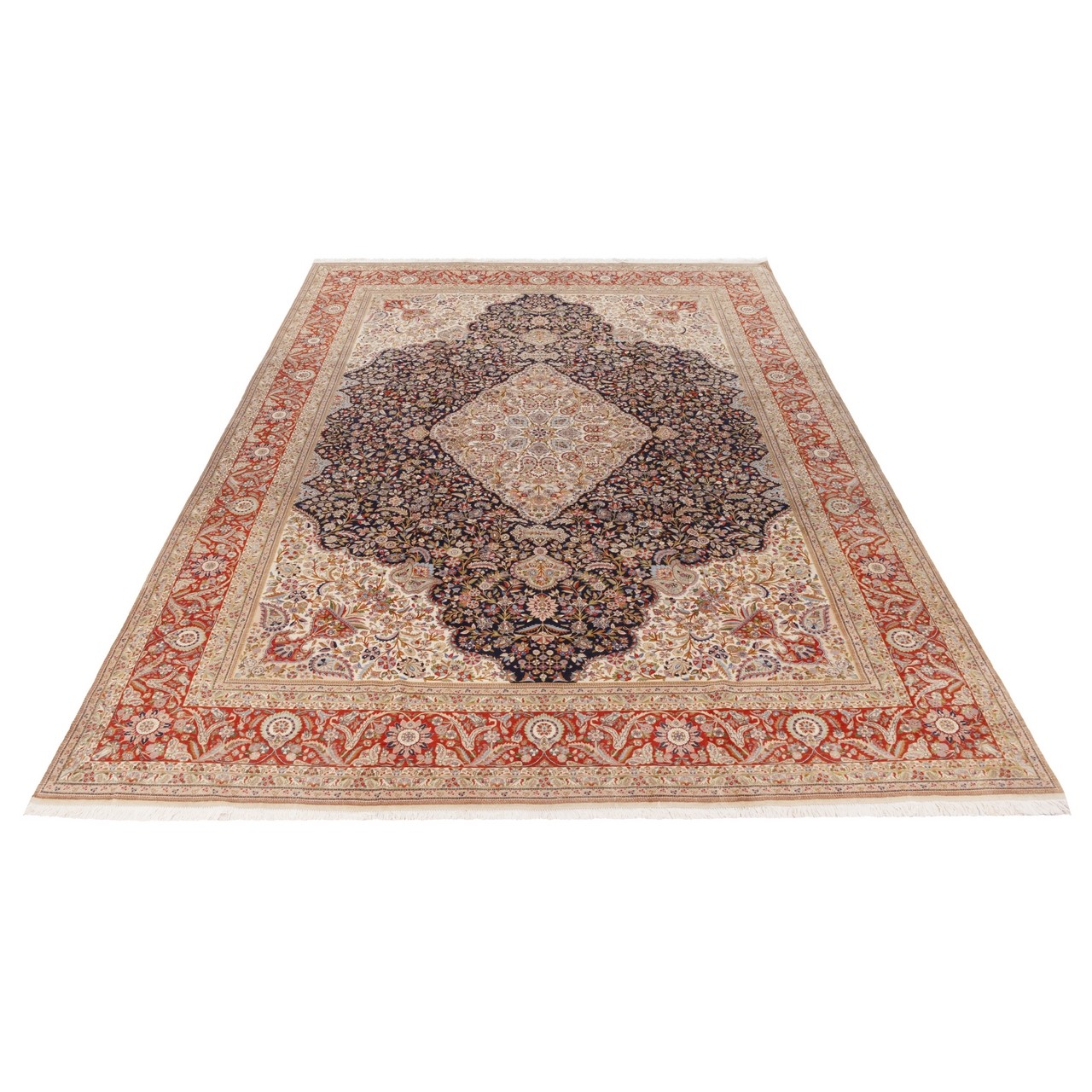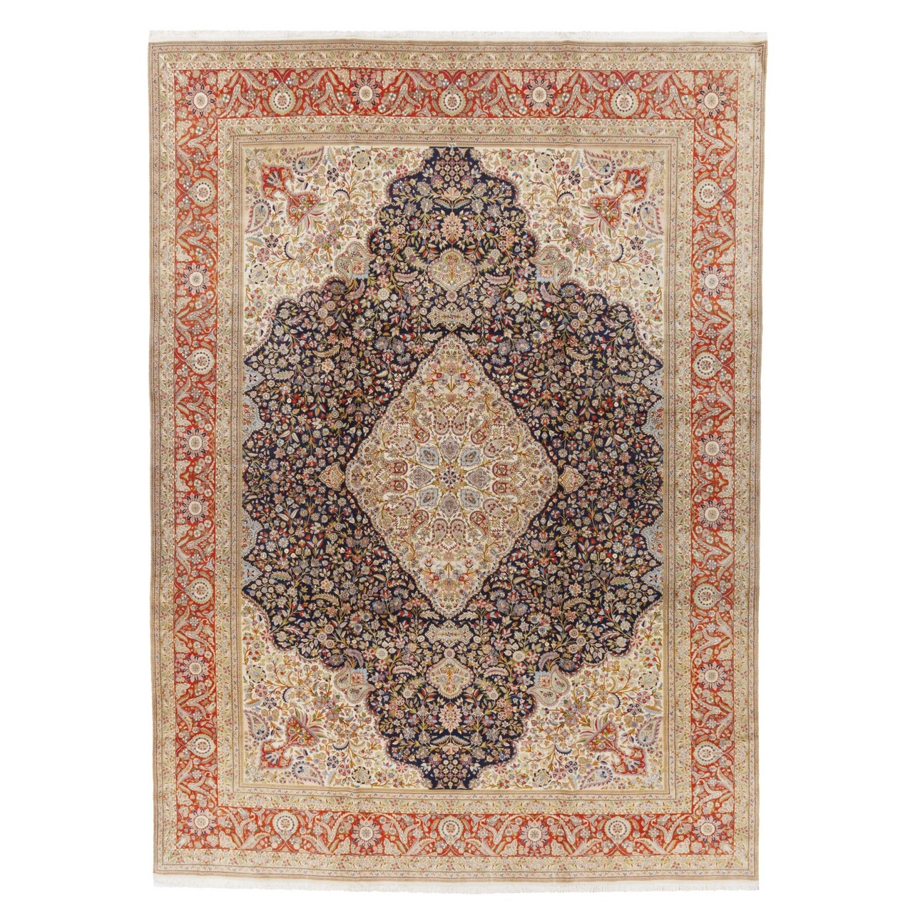 تأتي هذه السجادة اليدوية بتصميم مدالية مع أركان من علامة «طباطبائي»، بمقاس 320 × 440 cm (10'6" × 14'5") ومساحة 14.08 م² (151.56 ft²). تبلغ كثافة النسج نحو 5,100 عُقَد/دسم²، وقد نُسجت بوبر صوفي لطيف مع سدى قطني متين على أيدي نسّاجين تبريزيين. توفّر الأرضية الكحلية العميقة مسرحًا حالِمًا لمدالية مركزية متألّقة، فيما تتقدّم الأركان الأربعة بتناغم نحو الوسط. وتمتد الزخارف الزهرية المستوحاة من حدائق إيران على كامل السطح برهافة آسرة. أما الدرجة النحاسية في الحاشية فتأتي كإطار هادئ مطمئن فوق الخلفية الكحلية، لتصنع تضادًا لافتًا ومتوازنًا يبعث إحساسًا فريدًا بالانسجام.