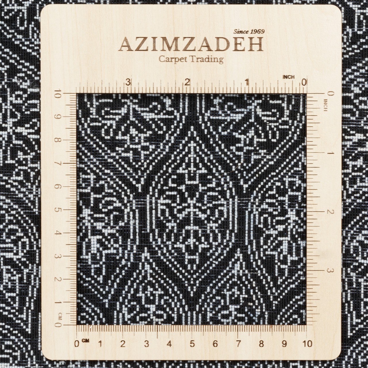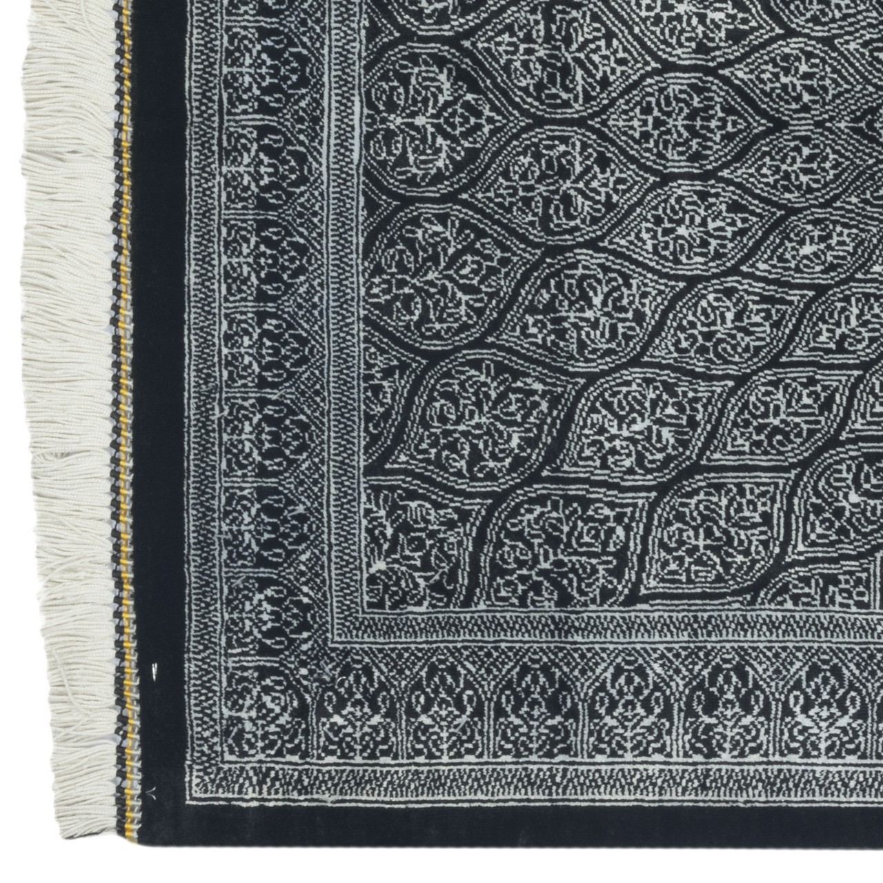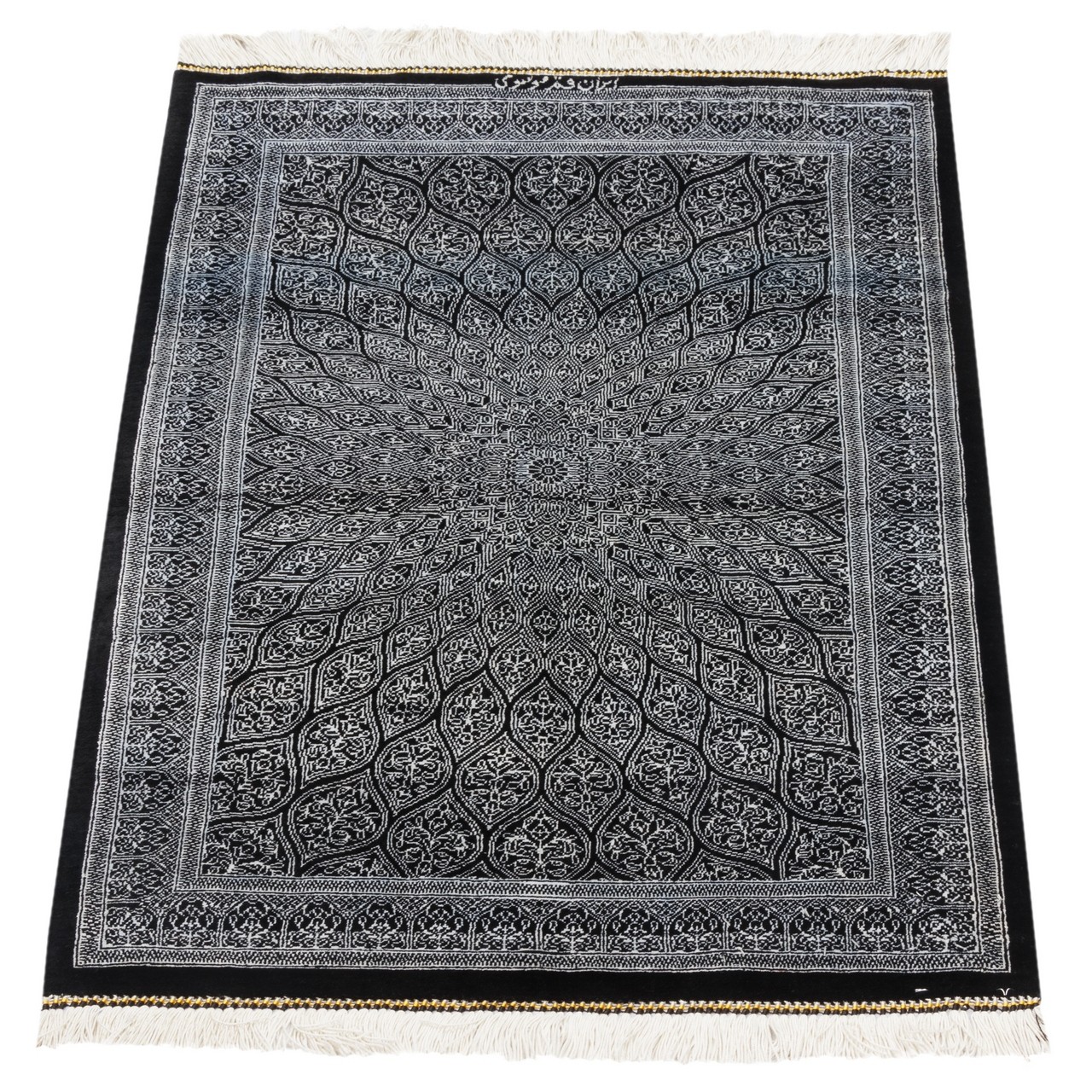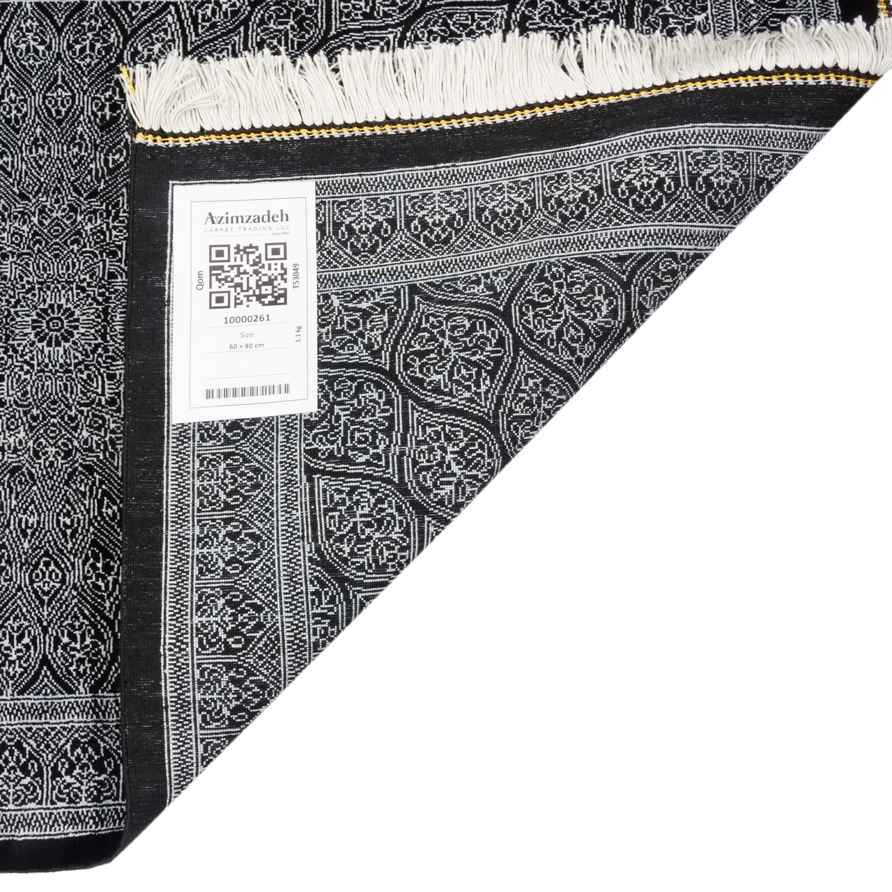 تبلغ أبعاد هذه السجادة الحريرية بالكامل 60 × 90 سم (2'0" × 2'11") وبمساحة 0.54 م² (5.82 قدم²). أُنتجت تحت علامة «معصومي» بتصميم مستوحى من القباب، وهو تجسيد دقيق لتوازن العمارة مع الزخرفة. وبكثافة نسج تقارب 7,300 عُقَد/دسم²، يركّز التكوين البصري في الوسط ثم تتسع الزخارف تدريجياً نحو الأطراف، موقظة شعوراً بالامتداد إلى اللانهاية—كأن سقفاً مزخرفاً من بناء تاريخي قد انفرد فوق الأرض. وعلى أرضية سوداء مع حاشية متماثلة اللون، يكتسب التصميم حضوراً مهيباً وعميقاً، ويبعث في الوقت نفسه إحساساً بالانسجام والوحدة. هذه القطعة ملائمة للأماكن التي تنشد السكون والعمق والوقار.