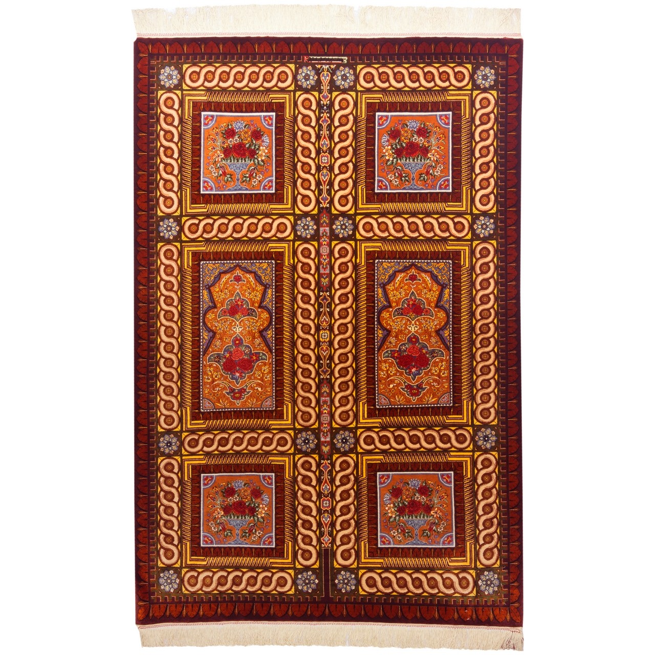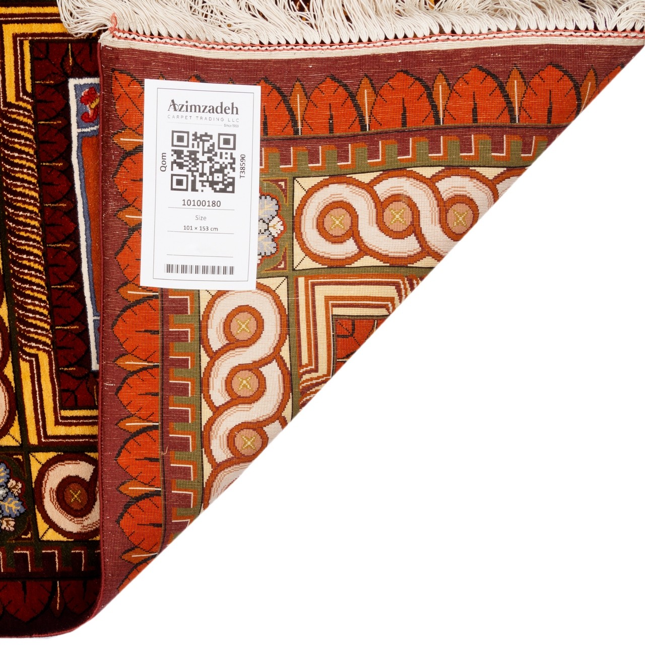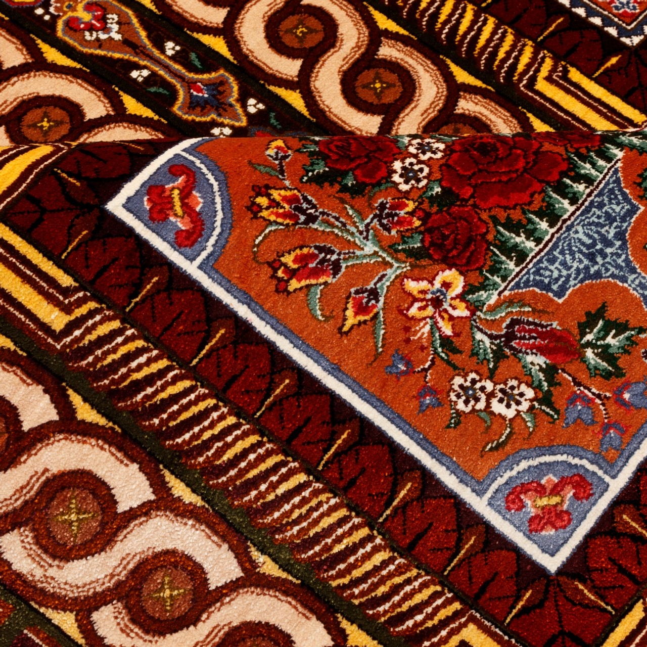 من بين المراكز المتألقة لفن السجاد الإيراني، تحتل قم مكانة استثنائية ولا مثيل لها في نسج السجاد الحريري، حيث يروي كل عُقدة قصة الدقة والرهافة والفهم العميق للجمال. هذه السجادة من حرير بالكامل، تحمل علامة «بختيار»، نُسجت بكثافة تقارب 10,000 عُقَد/دسم²، وهي مثال على تلك البراعة. أبعاد السجادة 101 × 153 سم (3'4" × 5'0") بمساحة 1.55 م² (16.68 ft²). تصميمها القابي، بتتابع الإطارات، يُعيد إلى الأذهان عمارة الحدائق الإيرانية؛ فكل إطار يشكّل عالماً مستقلاً من الزخارف الزهرية واللولبية، التي تصل بانسجام مدهش إلى وحدة مهيبة. هذا البناء الهندسي، إلى جانب تنوع ألوان السجادة وثرائها، يُظهر سيطرة المصمم على مبادئ تركيب الألوان والفضاء البصري. كما أن النسيج من حرير بالكامل أضفى على السجادة بريقاً ونعومة نادرة تتغير مع الضوء، ليمنحها حضوراً حيوياً وديناميكياً في أي مكان. وكل عُقدة فيها، مثل لمسة فرشاة في لوحة منمنمة، نُسجت بعناية وحب، لتتألق الآن في بيت يقدّر الفن والجمال الأصيل.