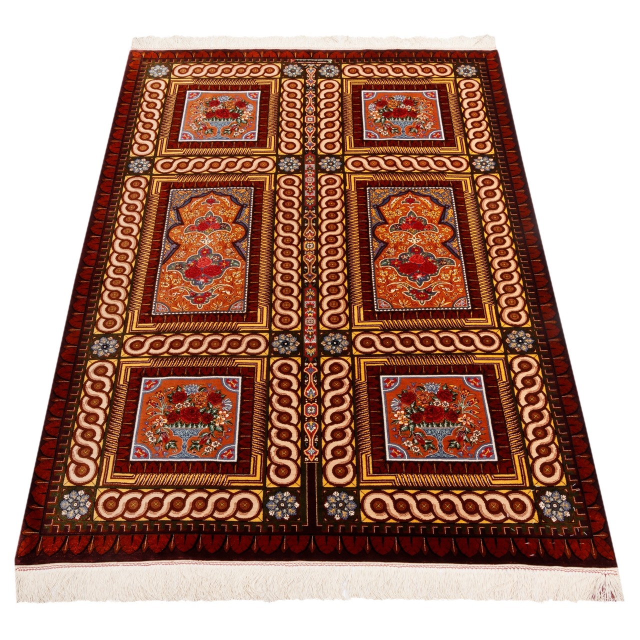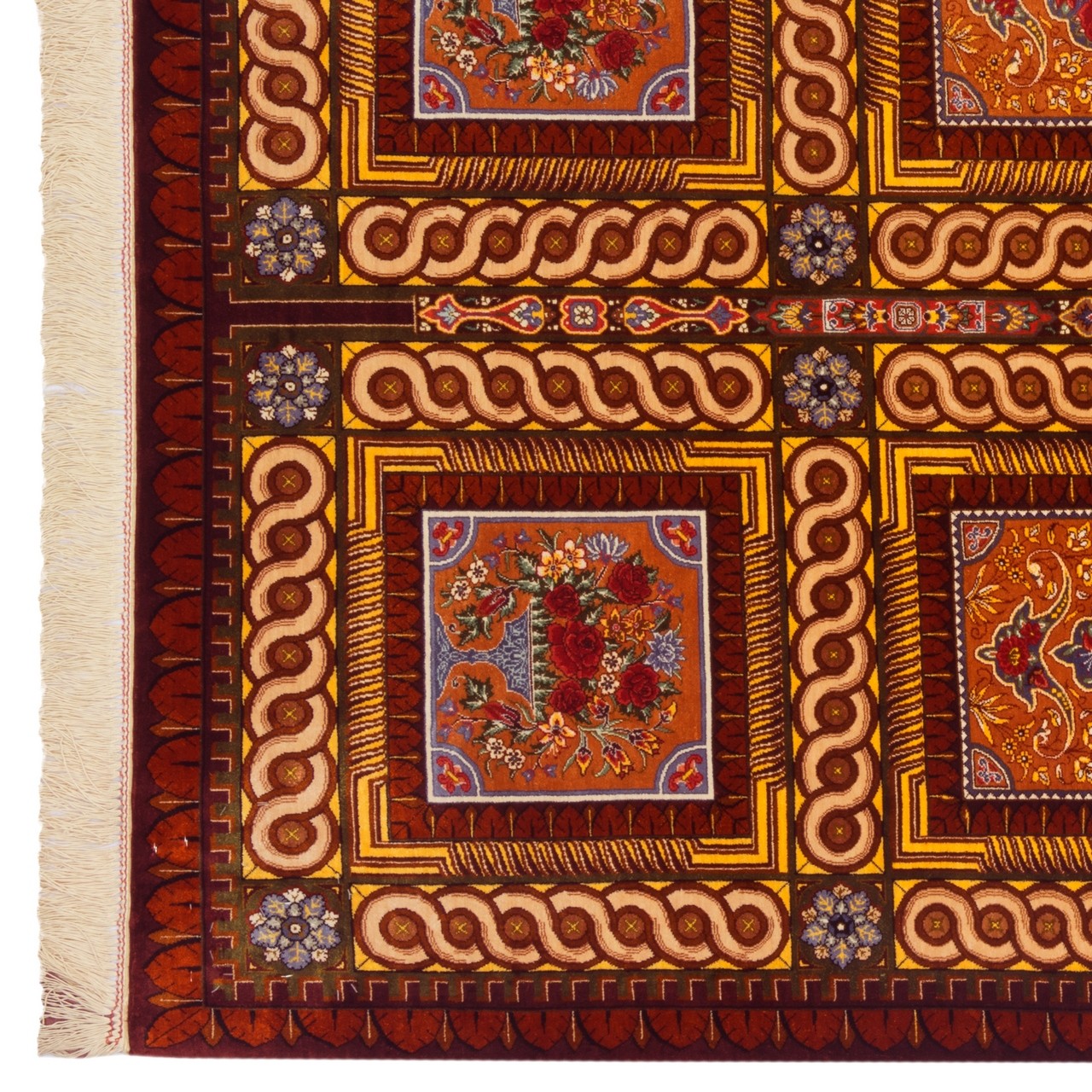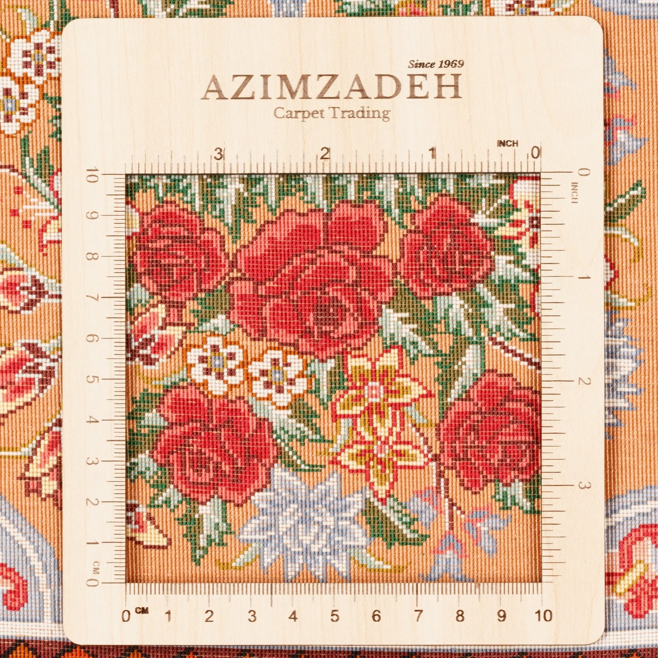 من بين المراكز المتألقة لفن السجاد الإيراني، تحتل قم مكانة استثنائية ولا مثيل لها في نسج السجاد الحريري، حيث يروي كل عُقدة قصة الدقة والرهافة والفهم العميق للجمال. هذه السجادة من حرير بالكامل، تحمل علامة «بختيار»، نُسجت بكثافة تقارب 10,000 عُقَد/دسم²، وهي مثال على تلك البراعة. أبعاد السجادة 101 × 153 سم (3'4" × 5'0") بمساحة 1.55 م² (16.68 ft²). تصميمها القابي، بتتابع الإطارات، يُعيد إلى الأذهان عمارة الحدائق الإيرانية؛ فكل إطار يشكّل عالماً مستقلاً من الزخارف الزهرية واللولبية، التي تصل بانسجام مدهش إلى وحدة مهيبة. هذا البناء الهندسي، إلى جانب تنوع ألوان السجادة وثرائها، يُظهر سيطرة المصمم على مبادئ تركيب الألوان والفضاء البصري. كما أن النسيج من حرير بالكامل أضفى على السجادة بريقاً ونعومة نادرة تتغير مع الضوء، ليمنحها حضوراً حيوياً وديناميكياً في أي مكان. وكل عُقدة فيها، مثل لمسة فرشاة في لوحة منمنمة، نُسجت بعناية وحب، لتتألق الآن في بيت يقدّر الفن والجمال الأصيل.