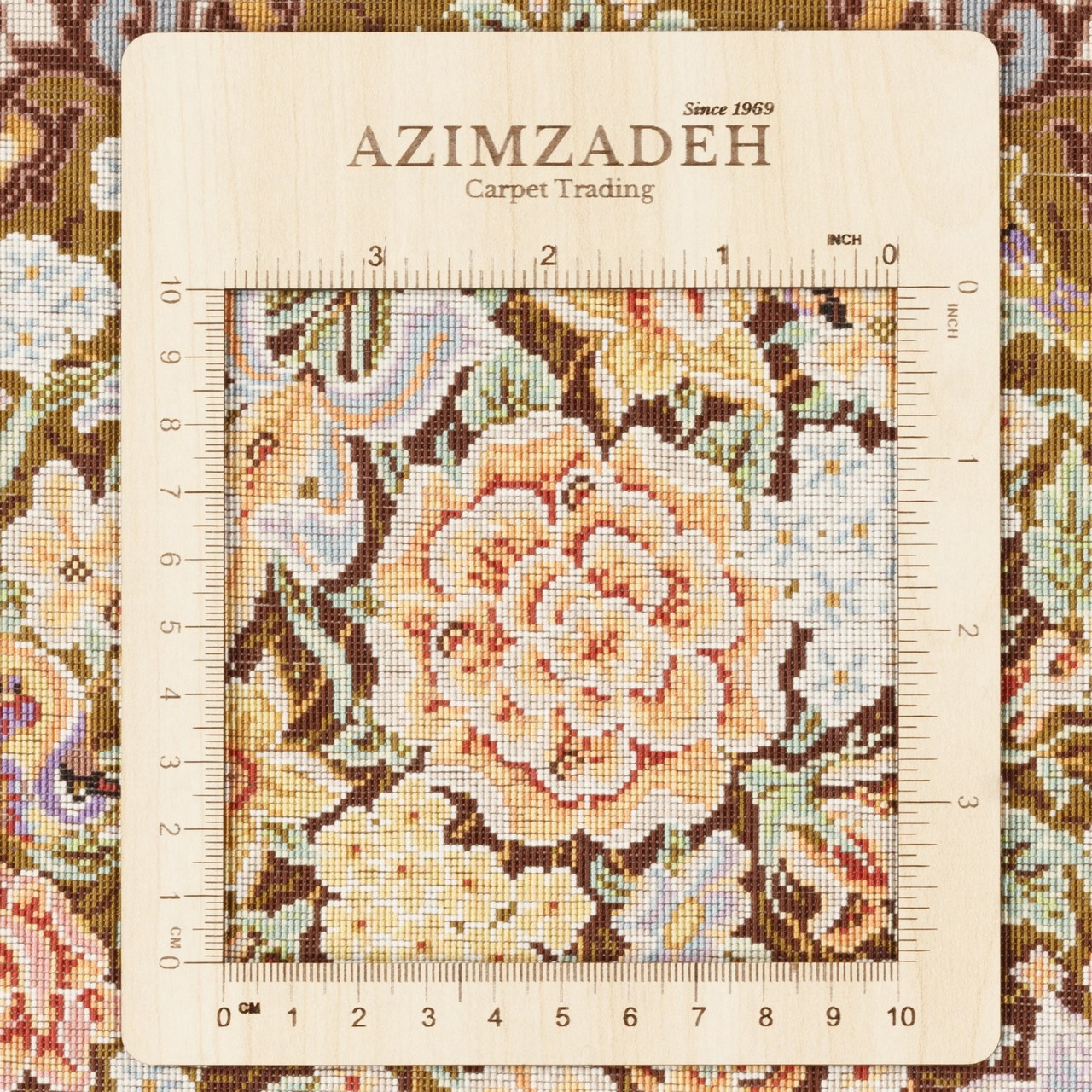 سجادة حرير بالكامل من قم بتصميم قابي، بمقاس 80 × 125 cm (2'7" × 4'1") وبمساحة 1 m² (10.76 ft²). نُسجت تحت علامة «اكبرزاده» وبكثافة تقديرية ≈ 11,400 عُقَد/دسم²، وتتميّز بتركيب قابي مستوحى من العمارة التقليدية الإيرانية والتكوينات الهندسية. يتحوّل كل إطار إلى حديقة متألقة من زهور حريرية، وكأنّ كل خَشْت عالم مستقل من اللون والنعومة والخيال، يتوحّد في تناغم بصري بديع ومتقن. أرضيتها وحدودها البنيّة اختيرت بأقصى درجات الرهافة لتُبرز اللمعان الطبيعي للحرير وحيوية الألوان في الزخارف. هذا التلوين الذكي يجعل السجادة عملاً أصيلاً وكلاسيكياً، وفي الوقت نفسه دافئاً وودوداً.