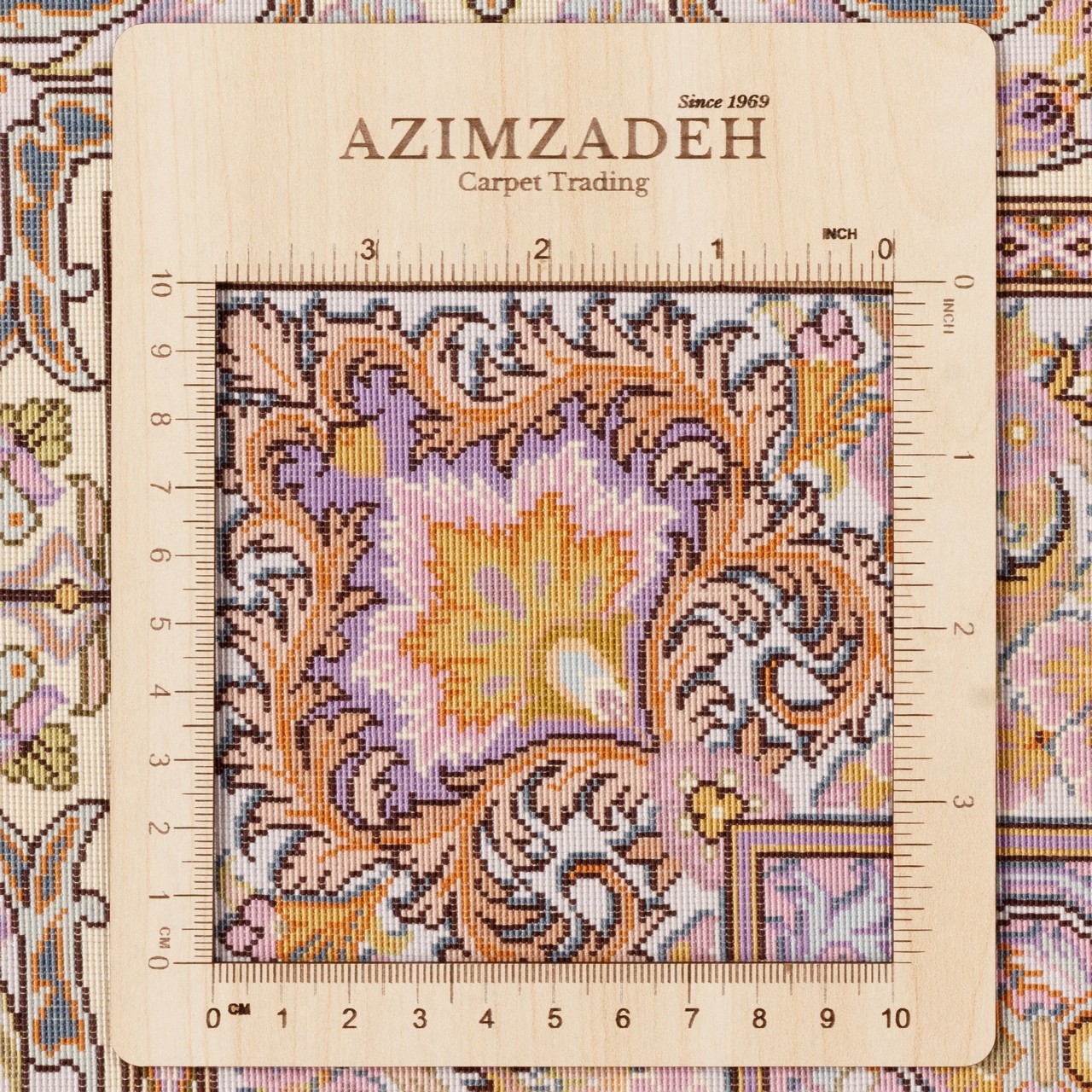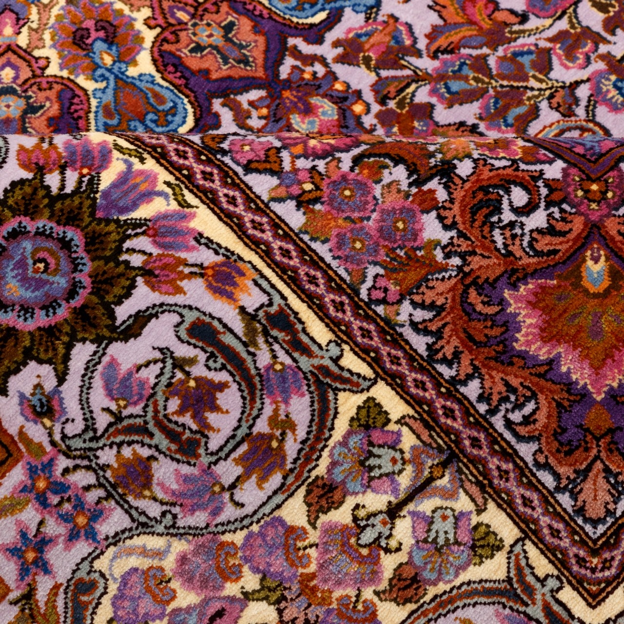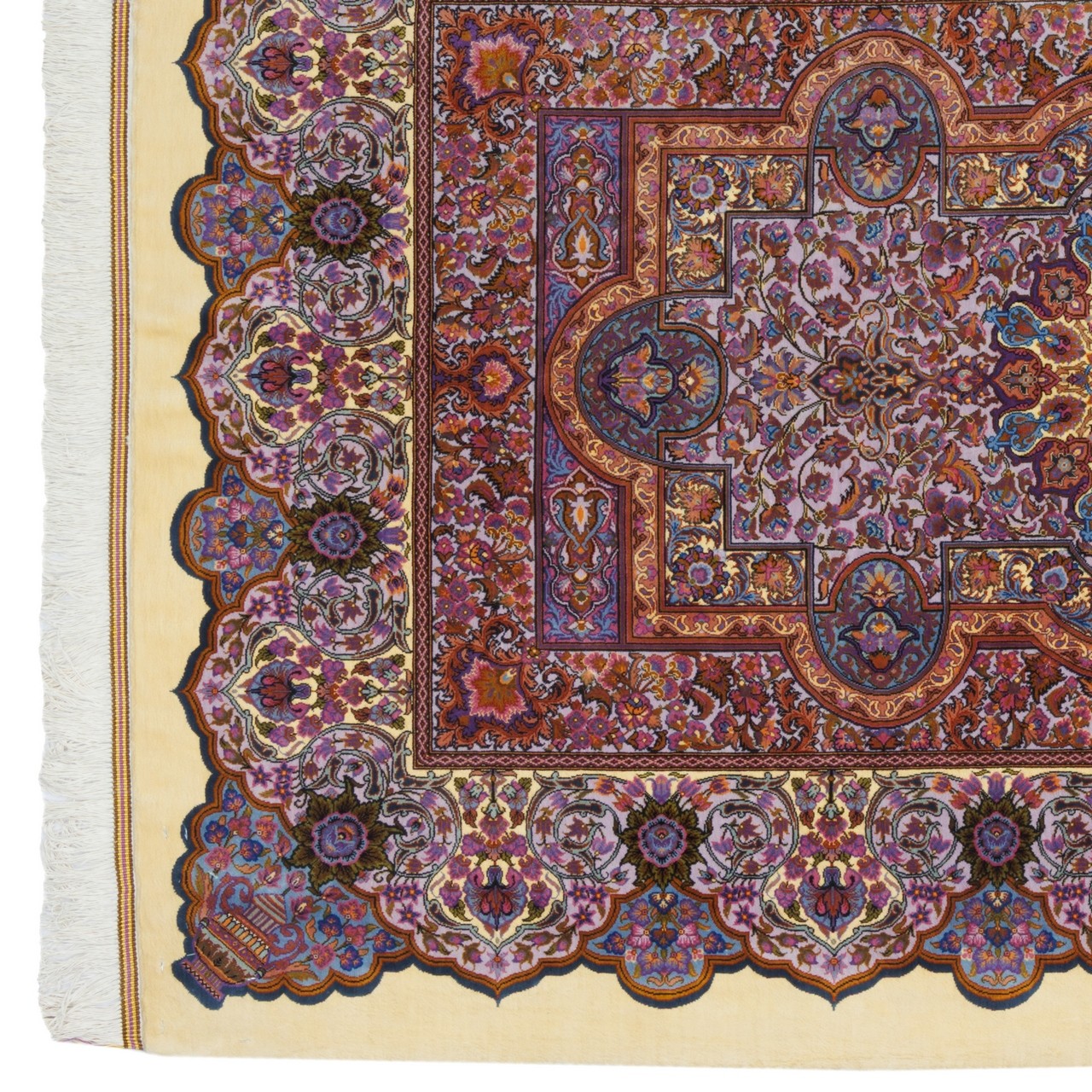 هذه السجادة اليدوية من حرير بالكامل من قم، بمقاس 100 × 151 سم (3'3" × 4'11") ومساحة 1.51 م² (16.25 ft²)، تتميّز برهافة استثنائية تبلغ نحو 11,500 عُقَد/دسم². وهي من إنتاج علامة «كفاش‌زاده»، وقد نُسجت بعناية ودقّة لافتتين. تحمل تصميماً من مدالية مع أركان على أرضية بلون ليلكي هادئ، حيث تجذب المدالية المتناظرة والمتوازنة النظر إلى المركز في تآلف بين السكون والفخامة. وتنتشر حولها زخارف زهرية كأزهارٍ تتفتّح في بستانٍ متخيَّل. أما الحاشية الملوّنة بدرجات ناعمة متناغمة فتمثّل الإطار الختامي الذي يُبرز الزخارف ويُكمل التكوين بتوازنٍ وانسجام.