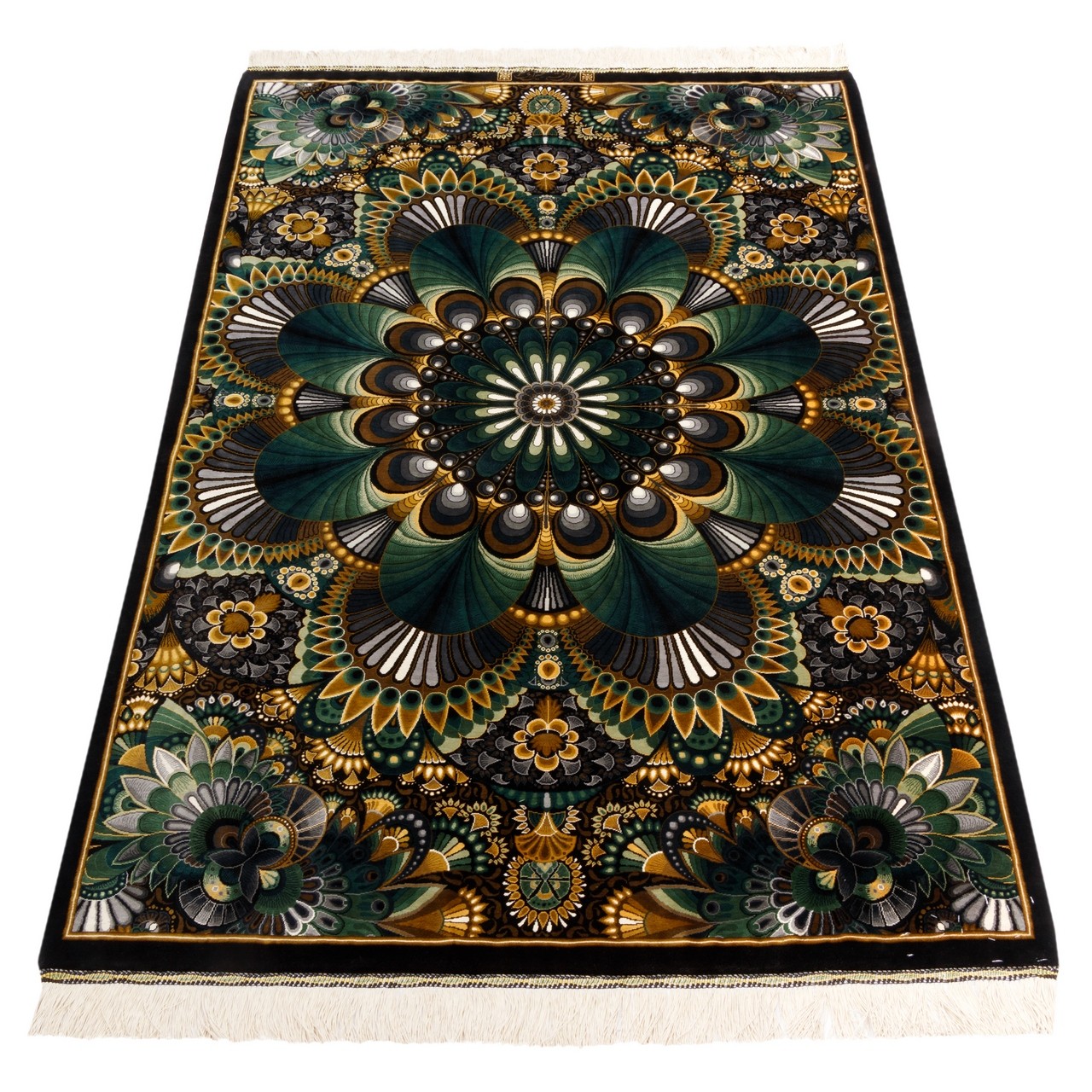 هذه السجادة الحريرية بالكامل من قم، والموقَّعة بعلامة «حسین ارمي»، تحمل تصميماً من مدالية مع أركان أعيد ابتكاره بروحٍ عصرية. بمقاس 100 × 160 سم (3'3" × 5'3") ومساحة 1.6 م² (17.22 ft²)، نُسجت بدقّة متناهية بكثافة تقارب 11,400 عُقَد/دسم²، وهو رقم يرمز في عالم نسج السجاد إلى أقصى درجات الرهافة والدقّة والفخامة. كل خيطٍ من السدى واللحمة مصنوع من حريرٍ خالص، ينعكس بريقه تحت الضوء ليمنح النسيج حياةً وتألقاً. تصميم المدالية المستمد من الأنماط الكلاسيكية الإيرانية أُعيد تقديمه هنا برؤية جديدة ومعاصرة. وتوليف الألوان المتعددة المتدفقة في أرضية السجادة وحاشيتها يخلق فضاءً حيوياً ومختلفاً، وكأن الزخارف تُجسّد التقاء التقاليد بالحداثة. إنها سجادة تُعبّر عن جرأة وابتكار في مجال الفن التقليدي، وتُبرز وجهاً مميزاً من فن السجاد الإيراني، لتكون ملائمة تماماً للمساحات ذات الديكور المعاصر.