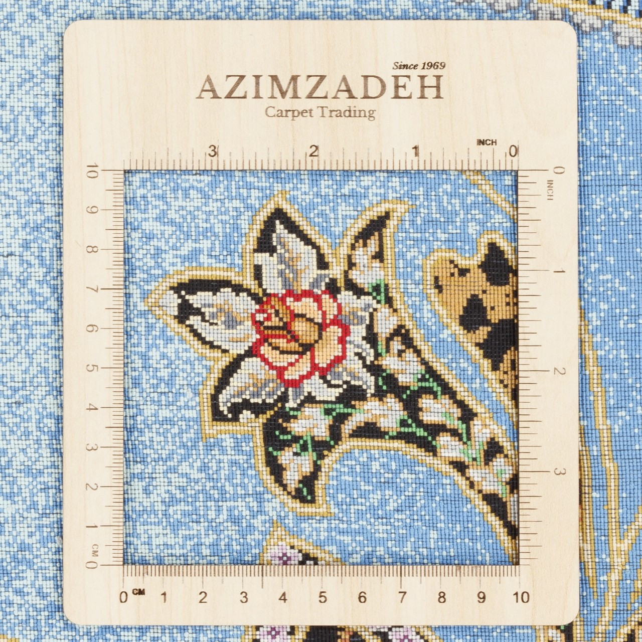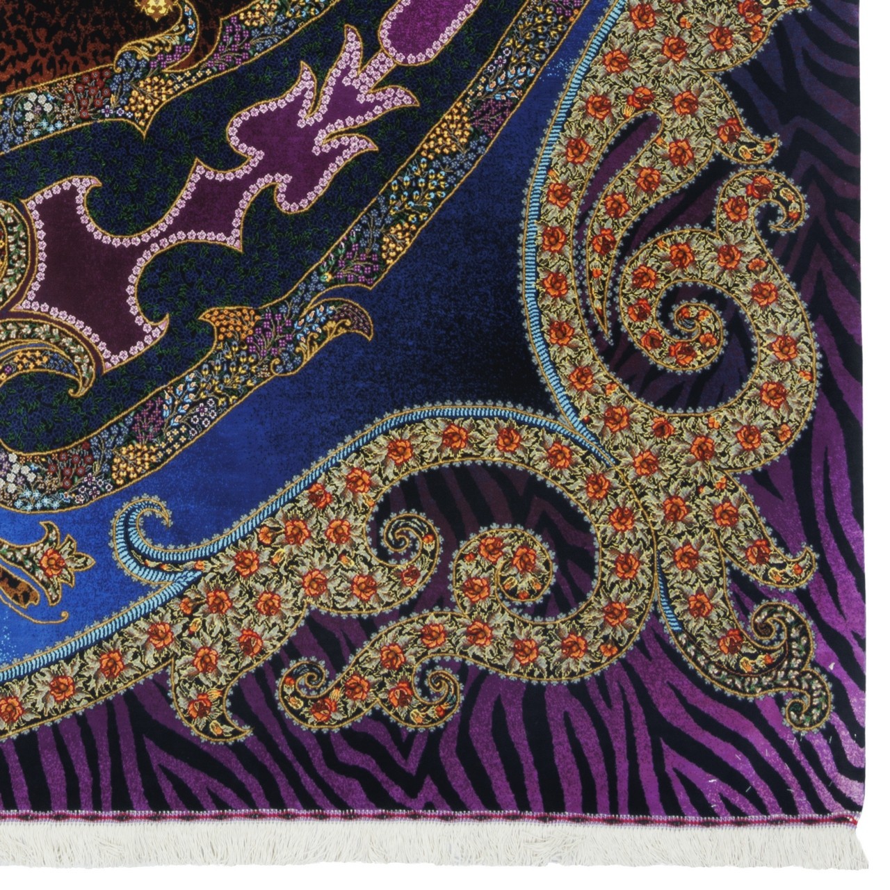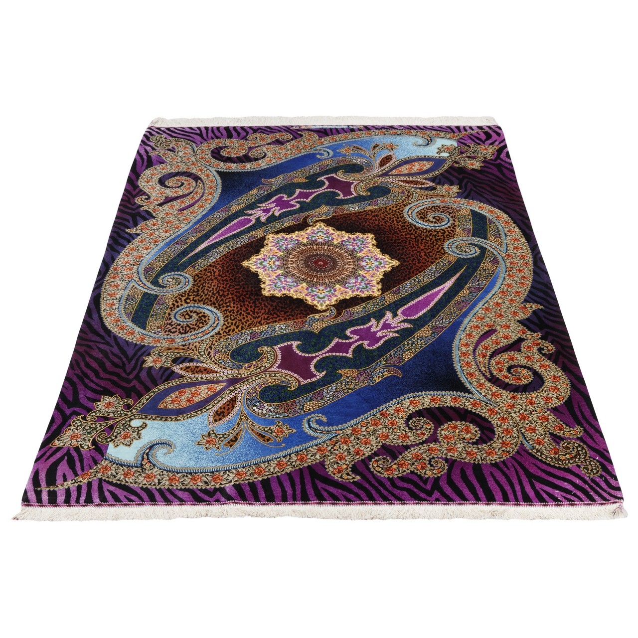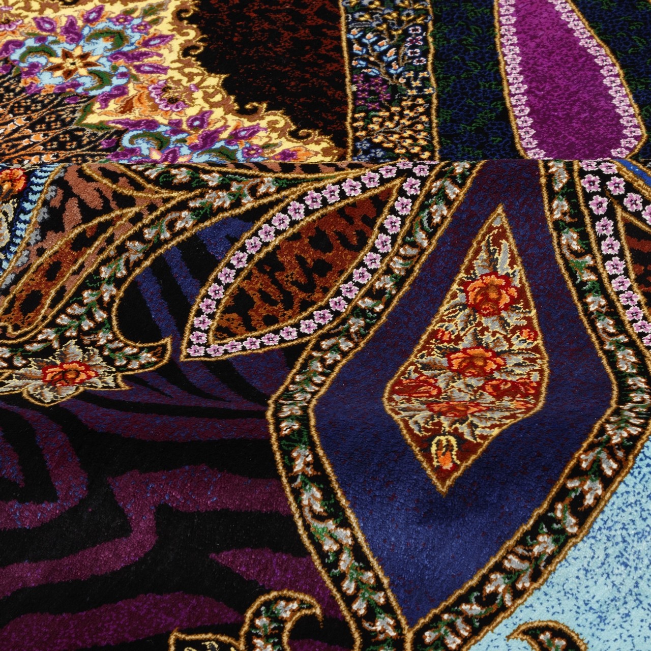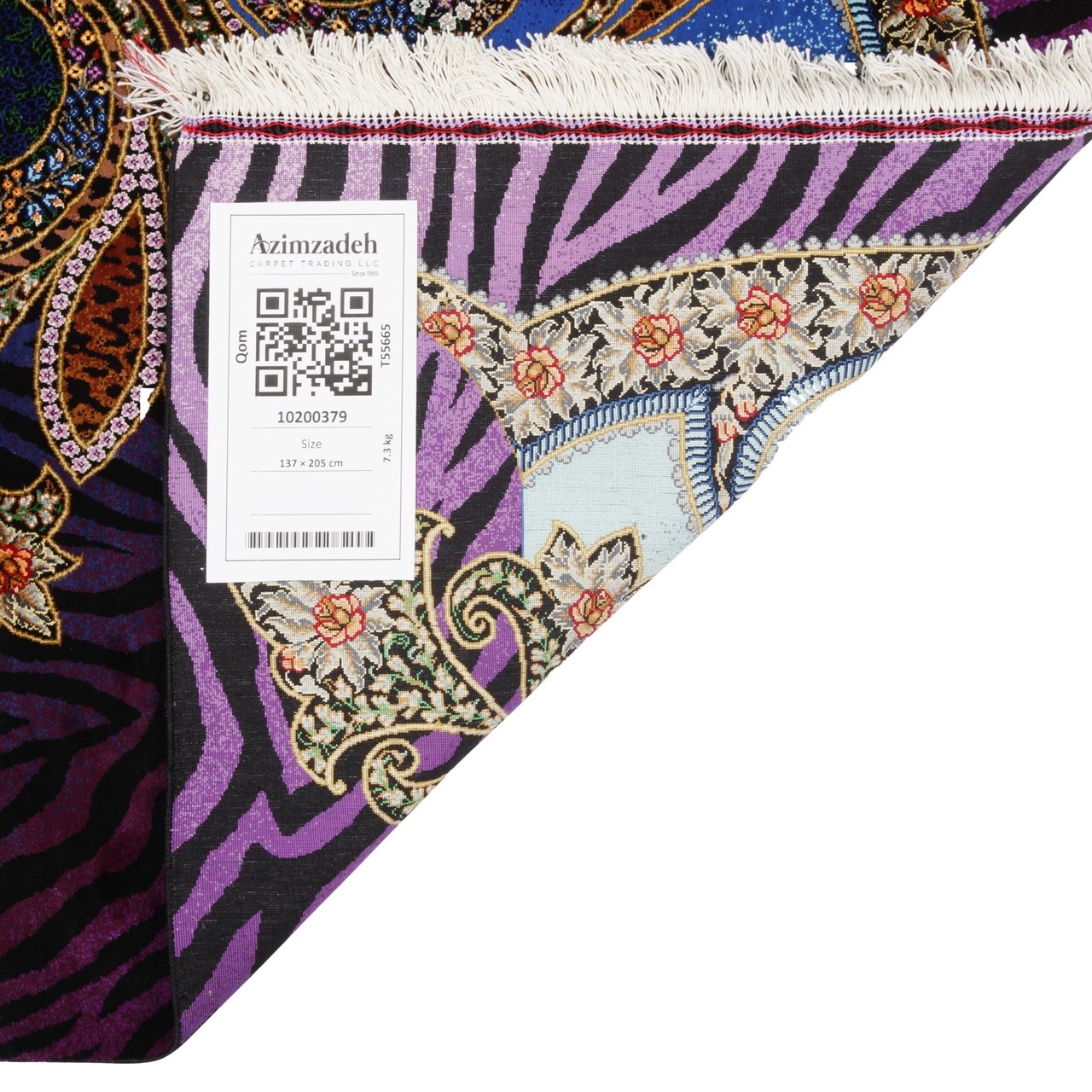 هذه السجادة اليدوية من قم بقياس 137 × 205 سم (4'6" × 6'9") وبمساحة 2.81 م² (30.25 قدم²). نُسجت بتصميم مدالية. صُنعت بعلامة «علي صدرا» وبكثافة تقارب 11,400 عُقَد/دسم²، فتُظهر تلاقياً مشرقاً بين التقاليد والحداثة في نسج السجاد الإيراني. السدى واللحمة من الحرير، في إشارة واضحة إلى رهافة وجودة هذا العمل. أُعيد تقديم تصميم المدالية هنا برؤية عصرية، ومنحت الألوان المتنوّعة في الحقل روحاً جديدة لنمط عريق. أما الحاشية البنفسجية، فبوقارٍ خاص ونَفَسٍ معاصر تُؤطّر هذا البستان الزخرفي الغني بجمال. تجسّد هذه السجادة مسار تطوّر الفن الإيراني في العصر الحاضر. إن لمعان الحرير مع تناغم الألوان والأشكال الحديثة يجعلها خياراً فريداً للمساحات المعاصرة أو للمجموعات الشخصية.
