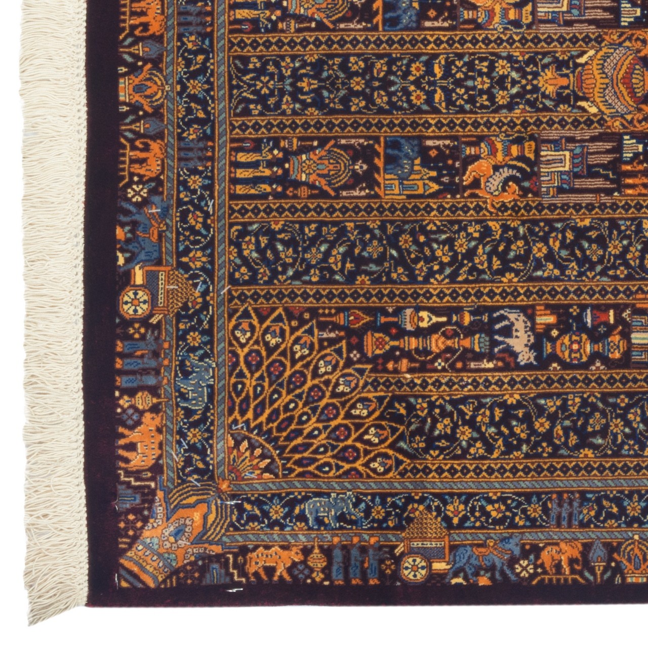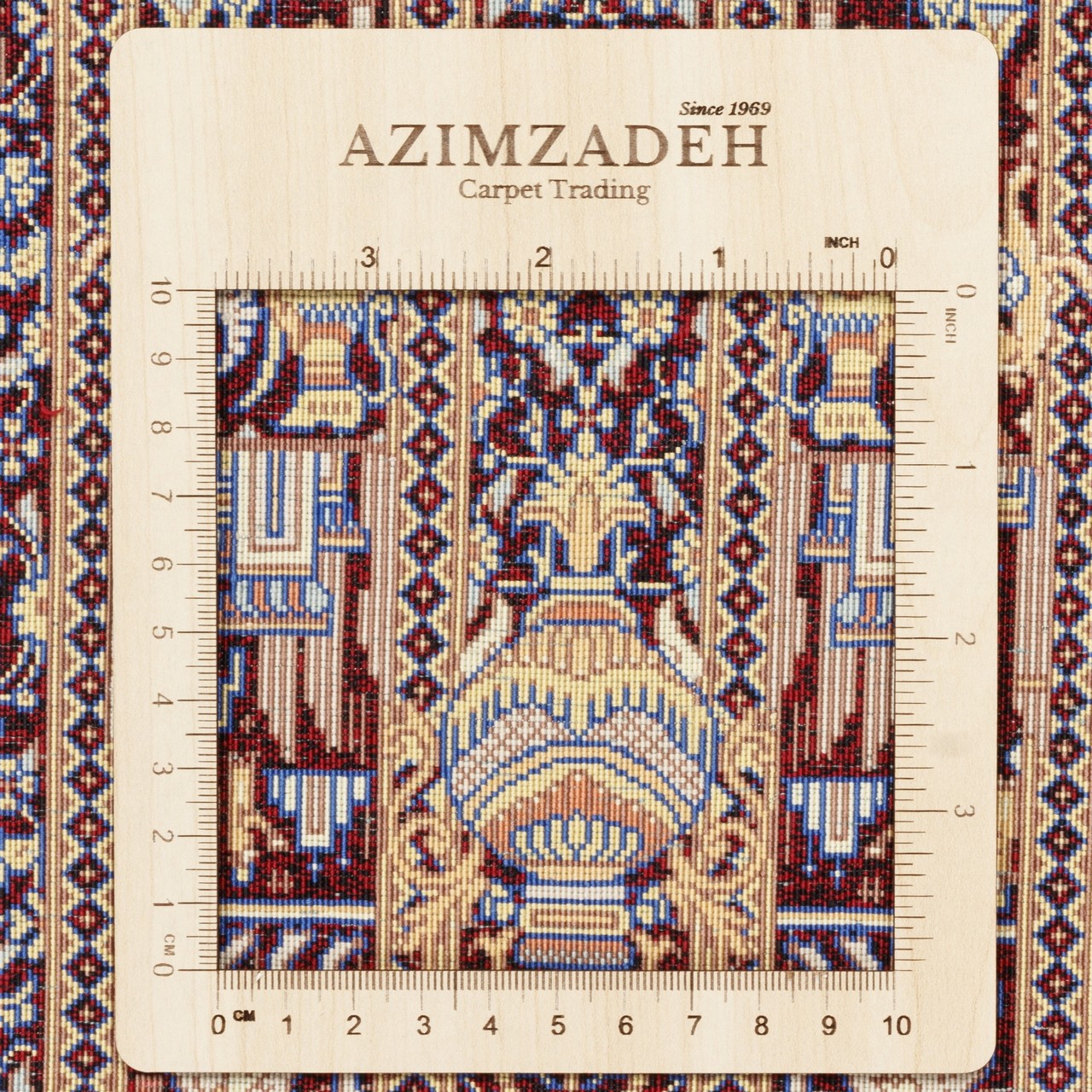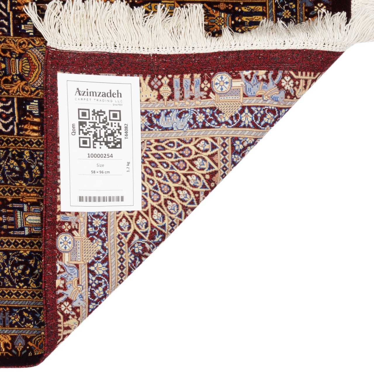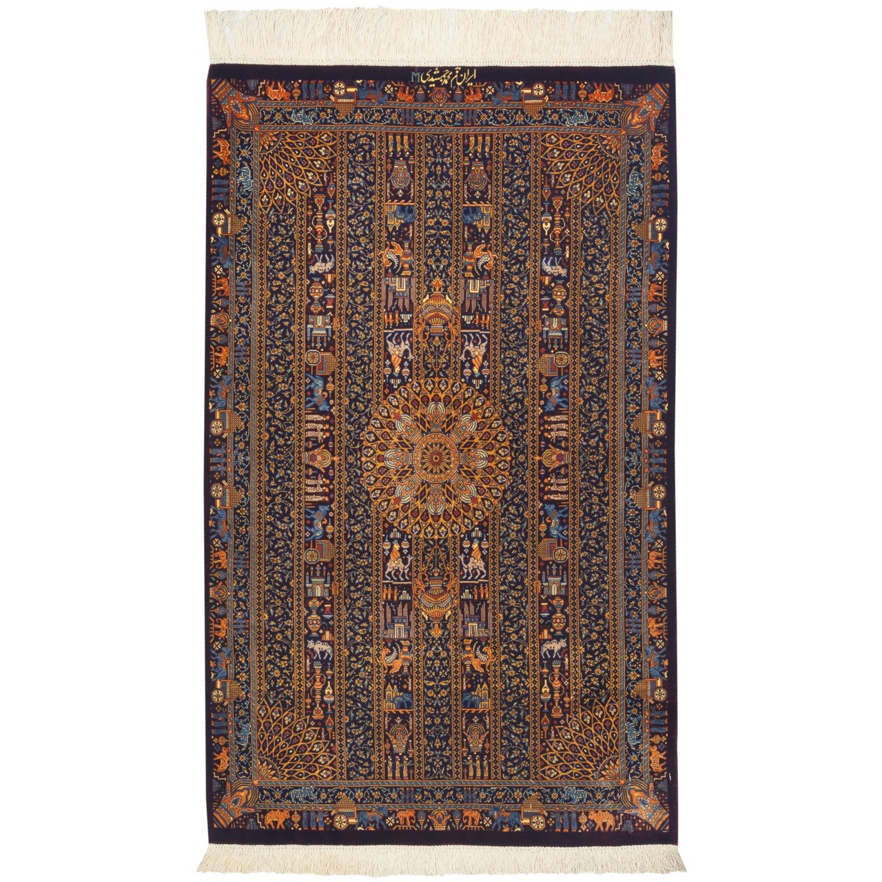 تُعدّ هذه السجادة اليدوية من الحرير بالكامل، بتصميم مدالية مع نقوش تصويرية، مثالاً على الكمالين البصري والتقني. تأتي بقياس 58 × 96 سم (1'11" × 3'2") وبمساحة 0.56 م² (6.03 قدم²). أُنتجت تحت علامة «ذبيحي» بكثافة نسج تقارب 13,000 عُقَد/دسم²؛ حيث يمنح تزاوج تصميم المدالية مع العناصر التصويرية بنيةً آسرة تقوم على السرد البصري. وتشكل المدالية المركزية مع اللُّحَيكات المتناغمة في الأركان حقلاً متوازناً متناظراً. يمنح اللون الزرشي في الأرضية والحاشية دفئاً أرستقراطياً وعمقاً فاخراً للسجادة. ويُضفي هذا الطيف الغني، مع اللمعان اللطيف للحرير، نوراً مميّزاً رصيناً في نسيجها—نوراً يستحضر التقليد ويحرّك المشاعر. هذه السجادة جزء من الثقافة البصرية الإيرانية، تروي عبر لغة الزخرفة واللون حكايةً عن الفن والحياة.