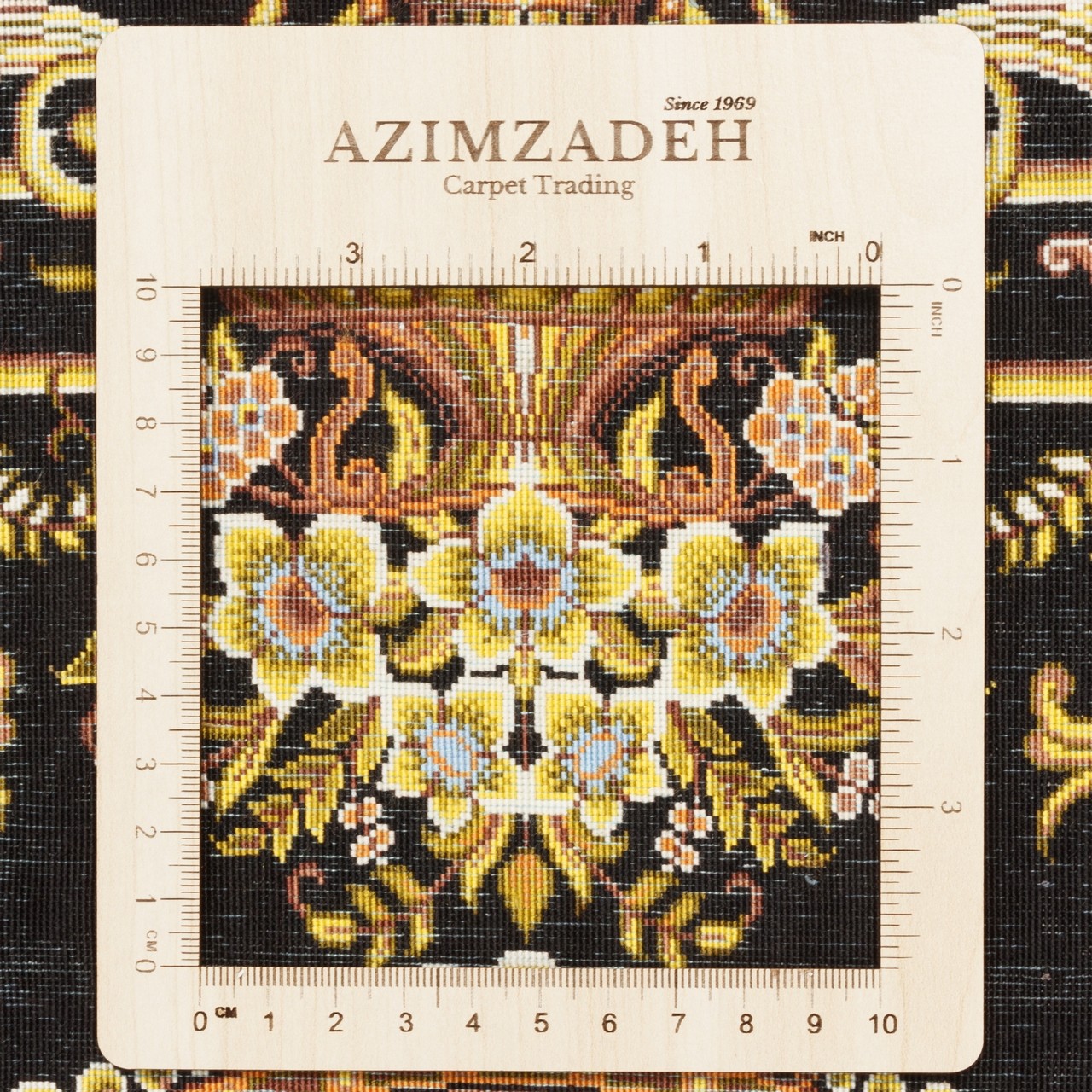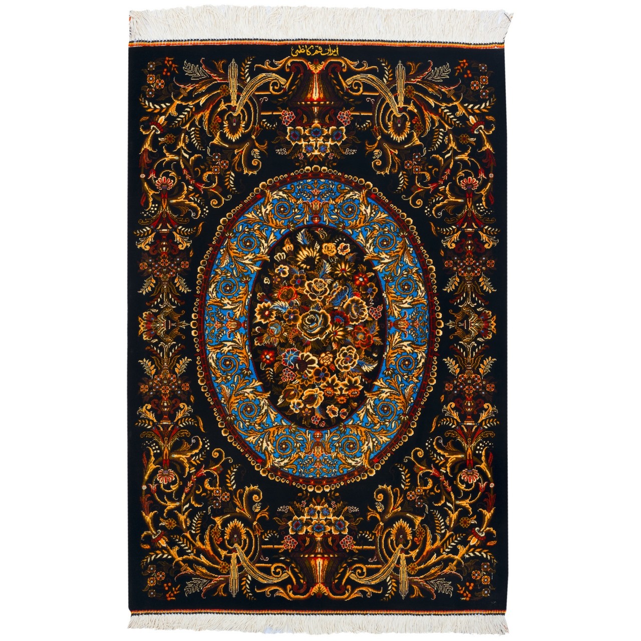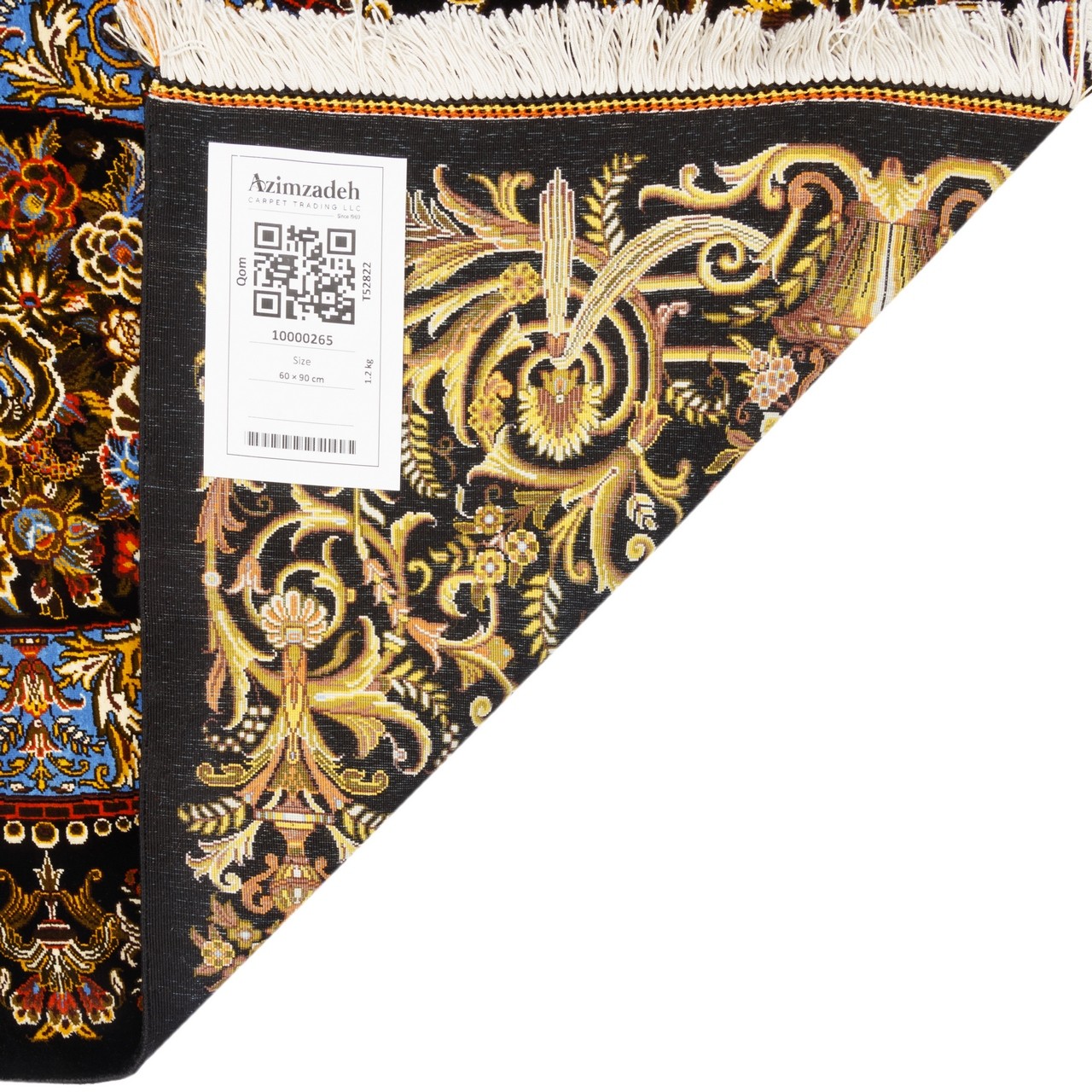 تبلغ أبعاد هذه السجادة اليدوية من قم 60 × 90 سم (2'0" × 2'11") وبمساحة 0.54 م² (5.81 قدم²). أُنتجت تحت علامة «كاظمي» وبنسج حريري بالكامل، وتتمتّع بكثافة نسج تقارب 11,400 عُقَد/دسم². يأتي التصميم المداليّ بصياغة ذات نفَس كلاسيكي؛ إذ تبدو الرشات الزهرية المنتظمة والأزهار ذات التفاصيل المصغّرة كأنها تدبّ فيها الحياة فوق أرضية سوداء، فترقص بهدوء تحت الضوء. وقد اُختير اللون الأسود لكلٍّ من المتن والحاشية ليمنح القطعة وقاراً آسراً ويركّز النظر على بهاء المدالية وتفاصيلها الزهرية. إن البنية الحريرية بالكامل تجعل السجادة رمزاً للنعومة والبريق، وخياراً ملائماً للمساحات الرسمية والكلاسيكية والمعاصرة.