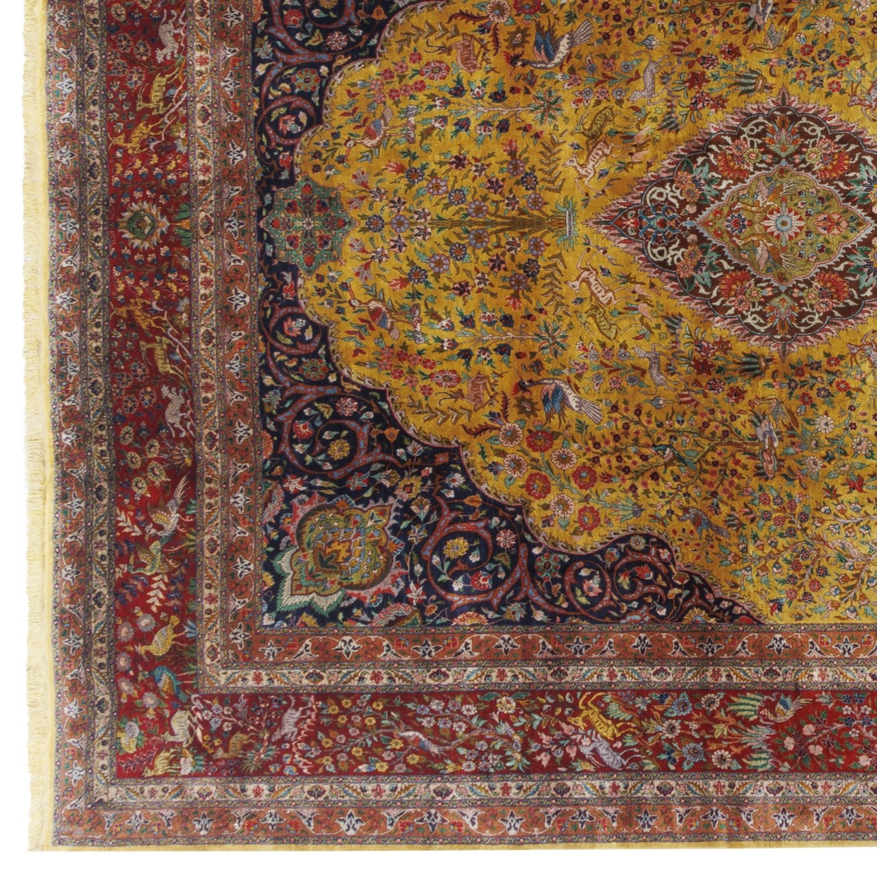 تأتي هذه السجادة اليدوية من تبريز بمقاس 295 × 390 cm (9'8" × 12'9") ومساحة 11.51 م² (123.89 ft²)، وهي ليست مجرد قطعة بصرية آسرة، بل تحمل أيضًا معاني رمزية وروحية، إذ يبعث وجودها في المكان شعورًا بالسكينة. تبلغ كثافة النسج نحو 5,100 عُقَد/دسم²، ما يُبرز بوضوح دقة تفاصيل الزخارف. تصميم المحراب، ذو الجذور في العمارة الإيرانية، جاء هنا مزدانًا بنقوش حيوانية في تركيبة فريدة ونادرة تجسد رؤية متعددة الأبعاد للخلق وانسجام الكون. يرتفع قوس المحراب بانسيابية مستوحاة من العمارة، فيما تبدو النقوش الحيوانية في داخله وكأنها تجليات للحياة والحركة في فضاء العبادة. تُضفي الأرضية الذهبية بريقًا ودفئًا بديعًا على العمل، لون مميز يمنح بالتناغم مع الإطار اللاكي هوية أصيلة للسجادة. أما النسيج بالصوف بالكامل فيمنح سطحها نعومة ودفئًا طبيعيًا، مع ضمان متانة تدوم طويلاً.