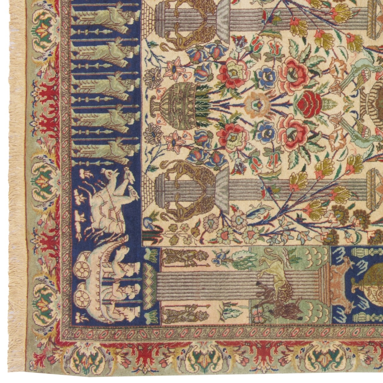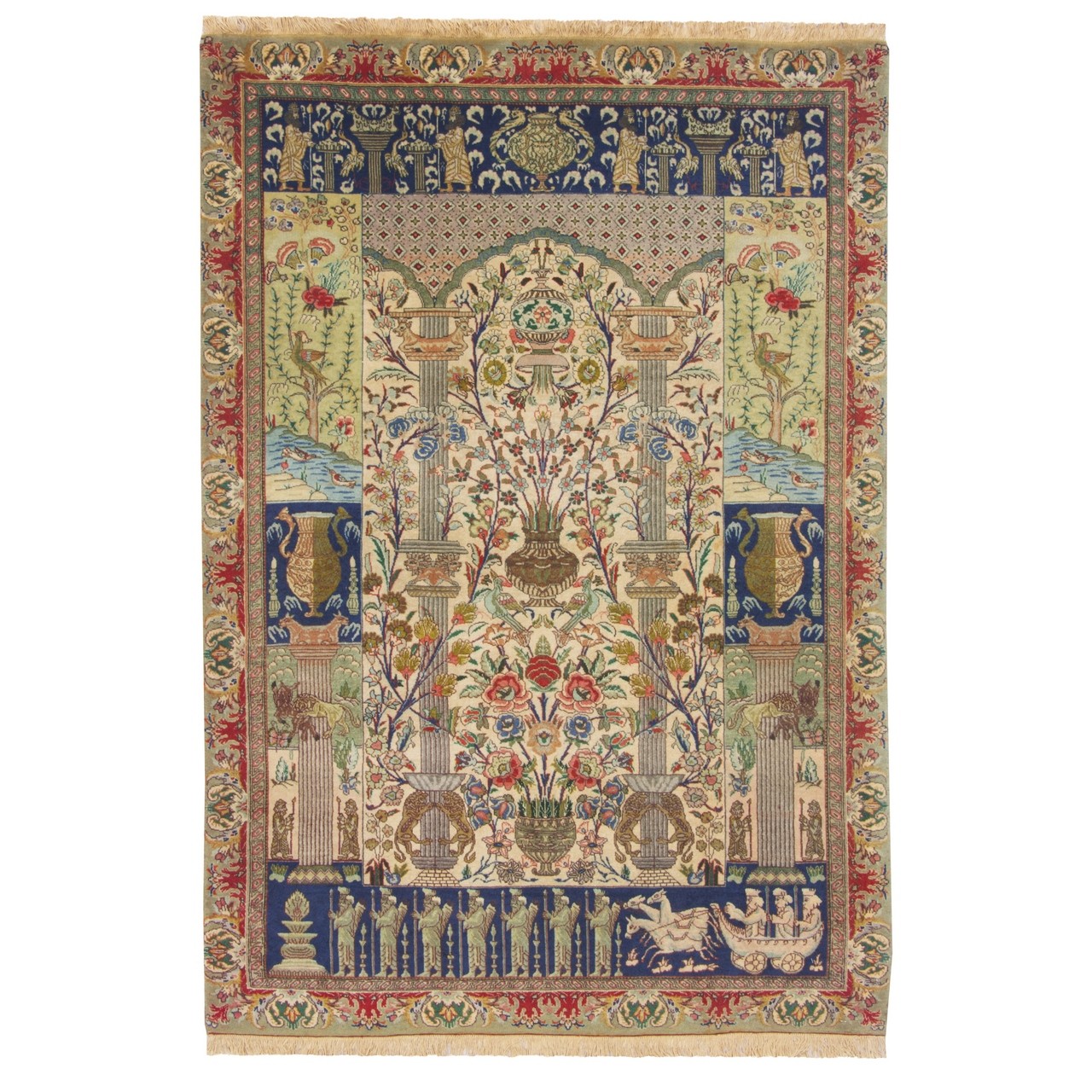 تسرد هذه السجادة اليدوية بتصميم محرابي ذائقة تبريز ورهافتها وجذورها الفنية. وبعدد 55 ضمن دقة النسج، فهي تندرج في فئة السجاد الدقيق النسج—حيث تشهد كل عقدة على دقّة لا تقبل المساومة وصبرٍ يستحق الثناء. تأتي الأبعاد 100 × 145 cm (3'3" × 4'9")، وبمساحة 1.45 m² (15.61 ft²)، وهي قطعة غنية بالتفاصيل البصرية والمفاهيمية. السداة قطنية والوبر من صوفٍ ناعم، اختيارٌ يضمن المتانة إلى جانب ملمس لطيف مُحبّب. ومحلّ النسج هو تبريز—مدينةٌ عُرفت في ذاكرة الفن الإيراني مهداً لنسج السجاد الحضري الأصيل ومركزاً للرهافة والابتكار في التصميم. تبلغ كثافة النسج نحو 6,200 عُقَد/دسم². يُقدَّم التكوين المحرابي هنا بلا مبالغة، وبروح البساطة الرفيعة. وتُبرز توليفة اللونين—أرضية كريمية مع إطارٍ أخضر سدري—صلةً مهدِّئة بين التراب والخُضرة. أمّا نقش «زير خاكي» الموزّع برهافة وإتقان على متن السجادة فليس دلالةً على النسيان، بل أشبه بكنزٍ مدفون خرج الآن ببهاءٍ جديد يدعو الناظر إلى التأمّل. وتستوحي الأعمدة المصوَّرة في هذه السجادة المحرابية ملامحها من النقوش البارزة في تخت جمشيد. هذه السجادة ليست مجرّد عنصرٍ تزييني، بل كأنها ملاذٌ من السكينة والوقار—مكانٌ للتأمّل في جمالياتٍ خالدة صاغتها أيدي الحرفيين. وللفضاءات الباحثة عن معنى، تروي هذه القطعة بروحها البسيطة جوهر الروح الإيرانية.
