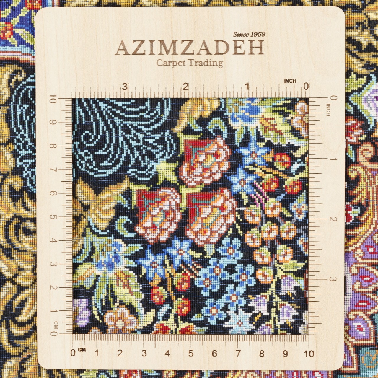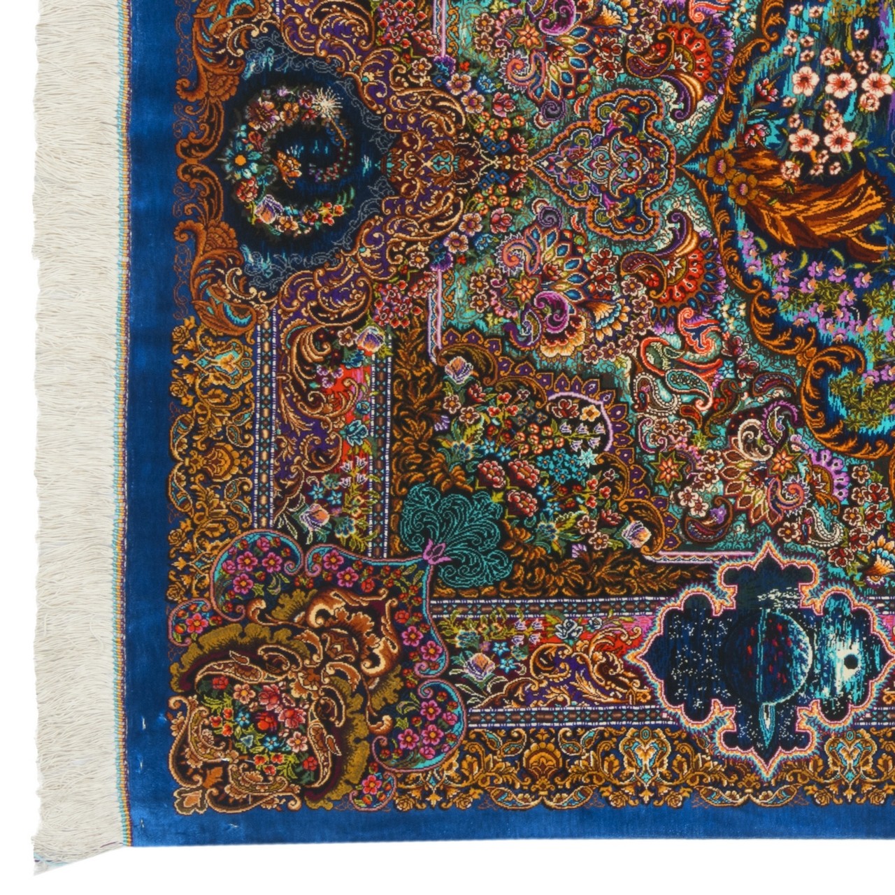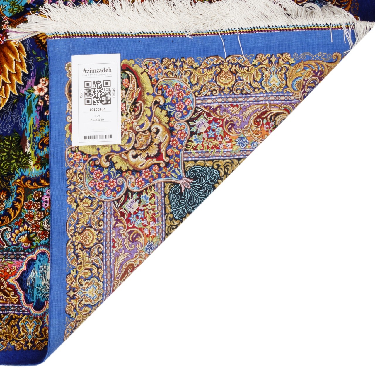 سجّادة حرير بالكامل من قم بأبعاد 96 × 150 سم (3'2" × 4'11") ومساحة 1.44 م² (15.50 ft²)، وبكثافة نسج فائقة تقارب 13,000 عُقَد/دسم². من علامة «حسین‌محمدی»، تقدّم هذه القطعة تصميماً شجرياً يُعد من أكثر التصاميم الإيرانية أيقونية، وقد أُعيدت صياغته هنا برؤية خيالية شاعريّة. أشجار متفتّحة، أزهار ملوّنة، طيور محلّقة بحرّية، ونقوش بُته (بيزلي) إيرانية كلاسيكية، كلّها تزيّن زوايا هذا البستان المتخيّل. وما يميّز العمل حقاً هو الحضور الرمزي لكوكب زحل المنسوج بين العناصر. التركيب اللوني الوان في المتن والحاشية منسّق بذكاء ليمنح العمل انتعاشاً وعمقاً وحركة في آنٍ واحد. يمنح الحرير الخالص لمعاناً خاصاً يبعث الحياة في كل نقش ويجعل ضوءاً متغيّراً يرقص على سطح السجّادة.