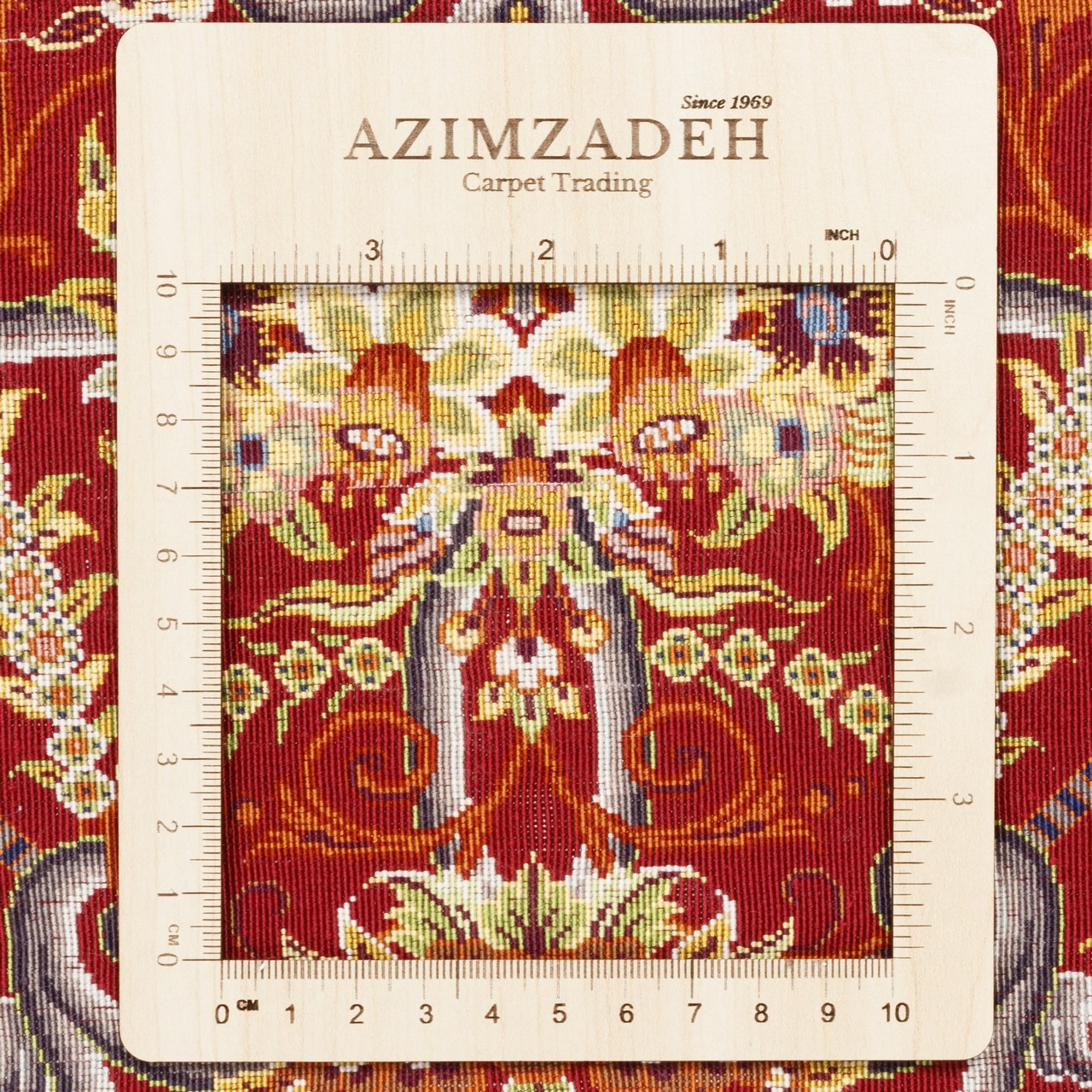 تبلغ أبعاد هذه السجادة اليدوية من قم 60 × 90 سم (2'0" × 2'11") وبمساحة 0.54 م² (5.81 قدم²). إنها منسوجة من الحرير بالكامل بتصميم مزهري، محافظةً على تقاليد نسج السجاد الإيراني ومقدّمةً في الوقت ذاته مقاربةً حديثة راقية في التكوين واللون. أُنتجت تحت علامة «سفير» وبكثافة نسج تقارب 10,000 عُقَد/دسم²، فتظهر بسطح حريري لطيف يتوهّج بهدوء مع تلاعب الضوء. تستقر المزهرية المركزية، الممتلئة بالأزهار والأغصان الملتفّة، على أرضية زرشكية، فيما يضفي الإطار الرمادي إحساساً مقصوداً بالسكينة وتوازناً بصرياً متناغماً. ويجعل استخدام الحرير في جميع مكوّنات السجادة هذه القطعة مثالاً مميزاً على النعومة والبريق والمتانة.