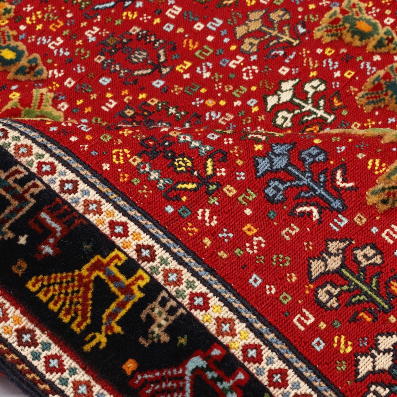 هذه سجادة كليم من سيرجان بمقاس 77 × 118 سم (2'6" × 3'10") وبمساحة 0.91 م² (9.80 ft²)، منسوجة بتصميم ممتد/كامل. تبلغ كثافة النسج نحو 3,200 عُقَد/دسم² وبهيكل من صوف بالكامل، مع نسجٍ منتظم ومكثّف يروي صلةً عريقة بين التقاليد واللون والهندسة. وعلى خلاف تخطيط الخشتي القائم على التقسيم إلى إطارات، يمنح التصميم الممتد نمطاً متصلاً وسلساً لإطلالة موحّدة ومنسجمة. تمتد الزخارف الهندسية من البداية إلى النهاية، فتمنح العين إحساساً بالحركة وتكراراً جميلاً وامتداداً فنياً بلا نهايات. تضفي الأرضية اللاكية دفئاً وأصالة، فيما يحتضن الإطار الأسود هذا الكنز البصري بقوة ووقار كأنه إطار مرصّع.