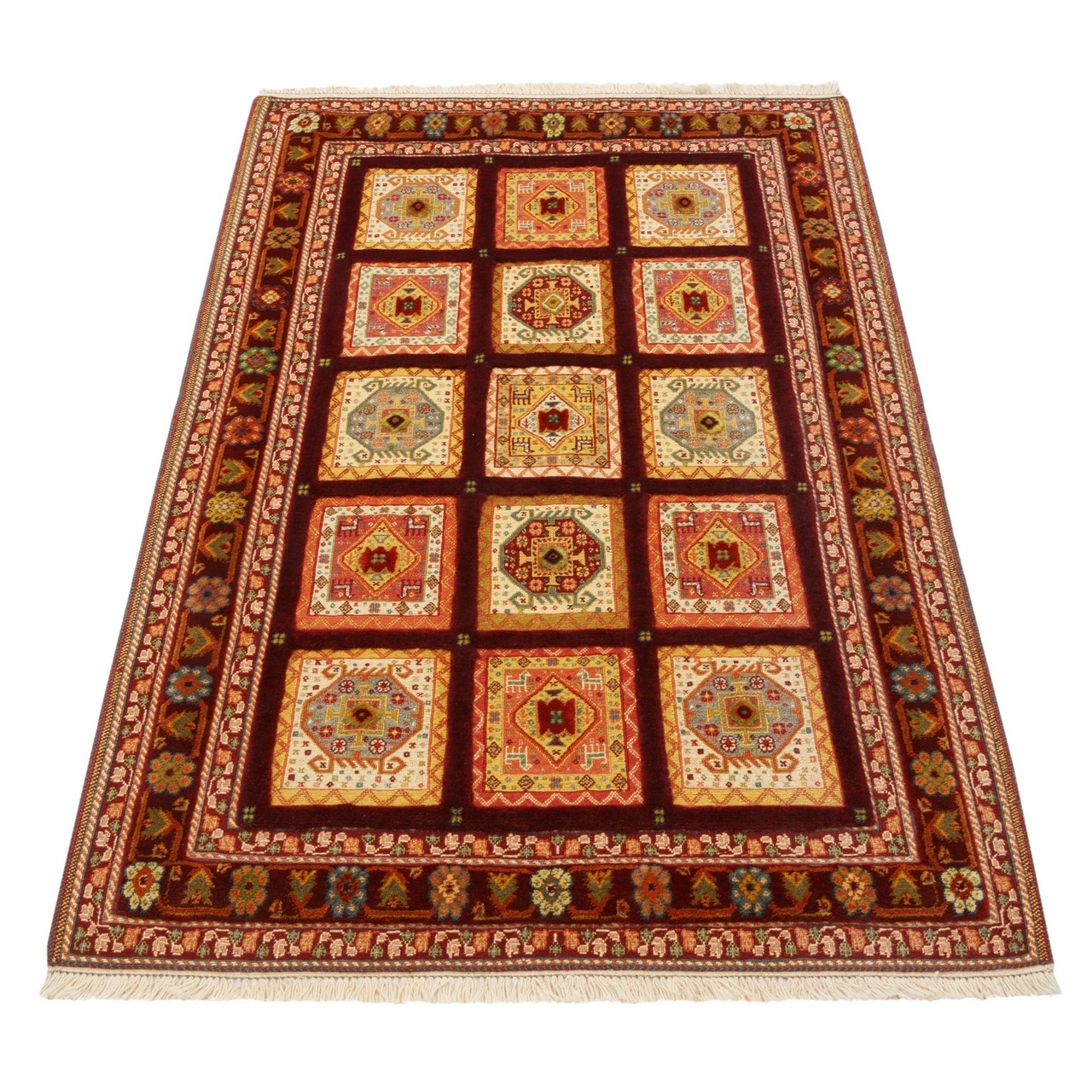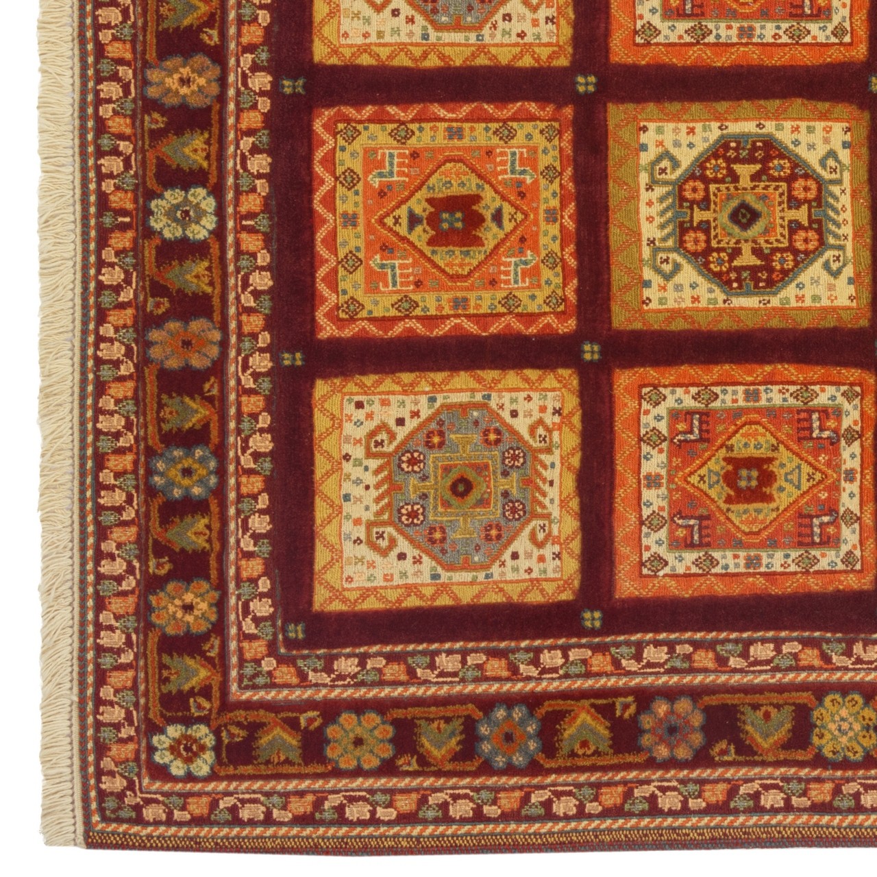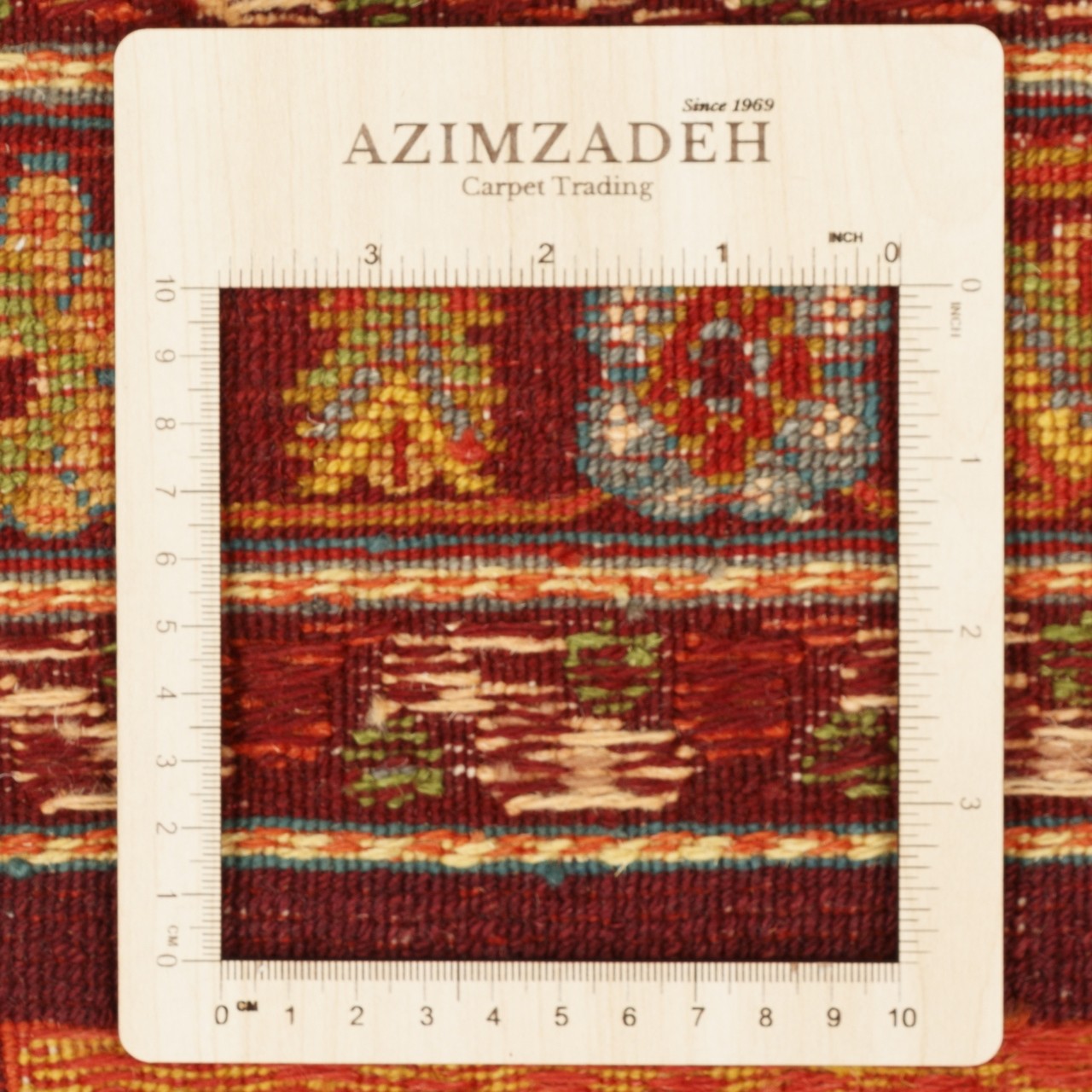 تبلغ أبعاد هذا الكِليم السيرجاني اليدوي 106 × 160 سم (3'6" × 5'3") بمساحة 1.7 م² (18.30 قدم²). نُسج من صوف طبيعي بالكامل ببنية متماسكة وكثافة نسج تقارب 2,500 عُقَد/دسم². يشكّل تصميم الخشتي (المُقسَّم)—أحد الزخارف المعروفة في فن السجاد الإيراني—البنية الرئيسة للقطعة؛ فكل خِشتة مؤطَّرة بنَسَقٍ منتظم ومتوازن، وتحمل زخارف مستلهمة من الطبيعة والثقافة والخيال الخلّاق للنسّاج. ويمنح هذا التكرار الموزون ذي النزعة المعمارية إحساساً بالنظام والانسجام والسكون للمكان. ويُستخدم اللون اللاكي في المتن والحاشية معاً ليمنح السجادة فخامة أصيلة دافئة؛ وهو لون تقليدي فارسي ينسجم بسهولة مع الأجواء الكلاسيكية، وفي الوقت نفسه يصنع—بفضل تباينه اللافت—نقطةَ تركيز فنية في الترتيبات الحديثة.