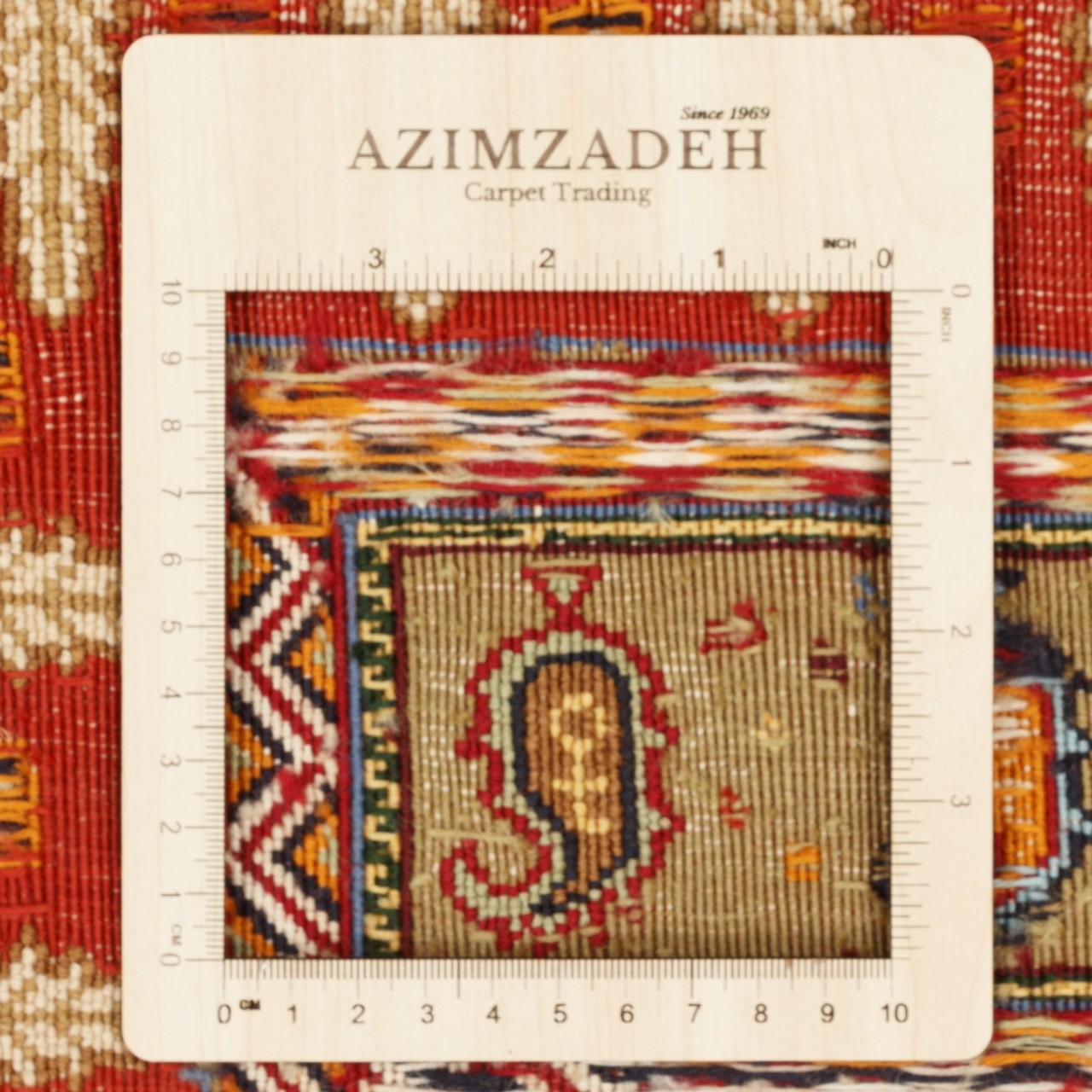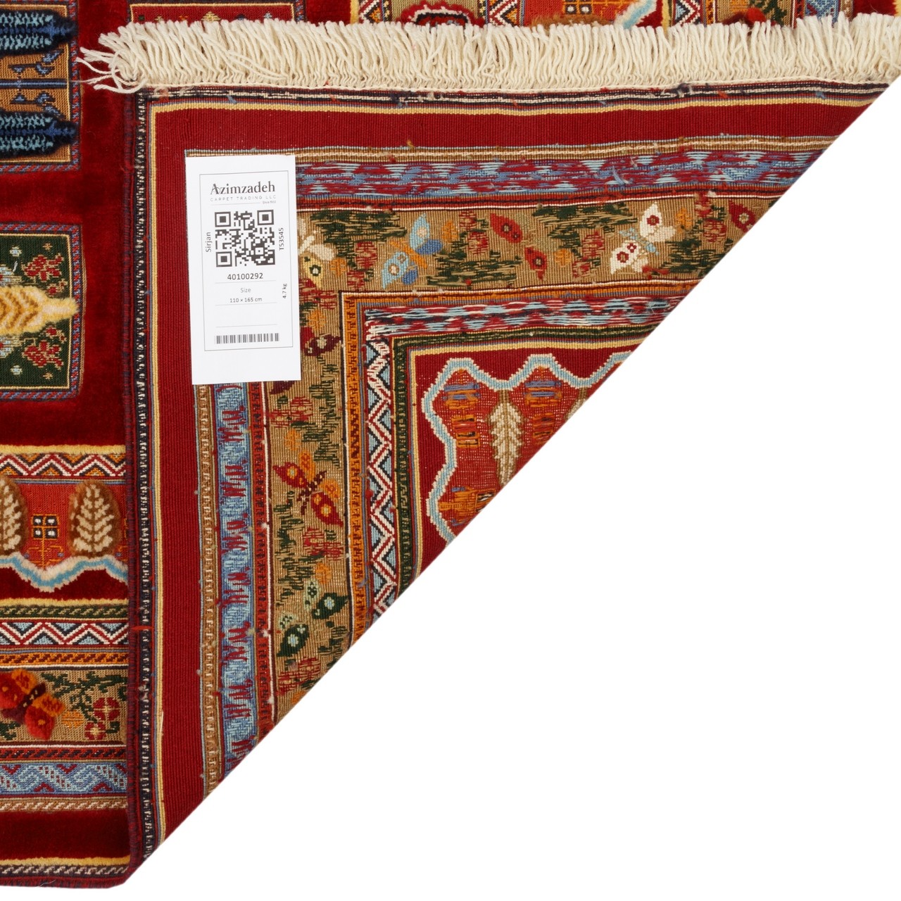 كليم يدوي من سيرجان بمقاس 110 × 165 سم (3'7" × 5'5") ومساحة 1.82 م² (19.59 قدم²). منسوج من صوف بالكامل، بملمس دافئ وناعم ومتين. كثافة النسج: نحو 3,200 عُقَد/دسم². يعرض نقش خشتي، وهو من أبرز تصاميم كليم سيرجان، عبر شبكة منتظمة من مربعات متساوية الحجم يزيّن كلٌ منها زخرفة مستقاة من المخيلة التقليدية للناسجة. يمنح اللون اللاكي في أرضية القطعة حرارةً وأصالةً لافتتين، فيما يوفّر الإطار الكريمي تباينًا هادئًا ومتوازنًا يحافظ على الطابع التراثي ويتناغم في الوقت نفسه مع الديكورات العصرية.