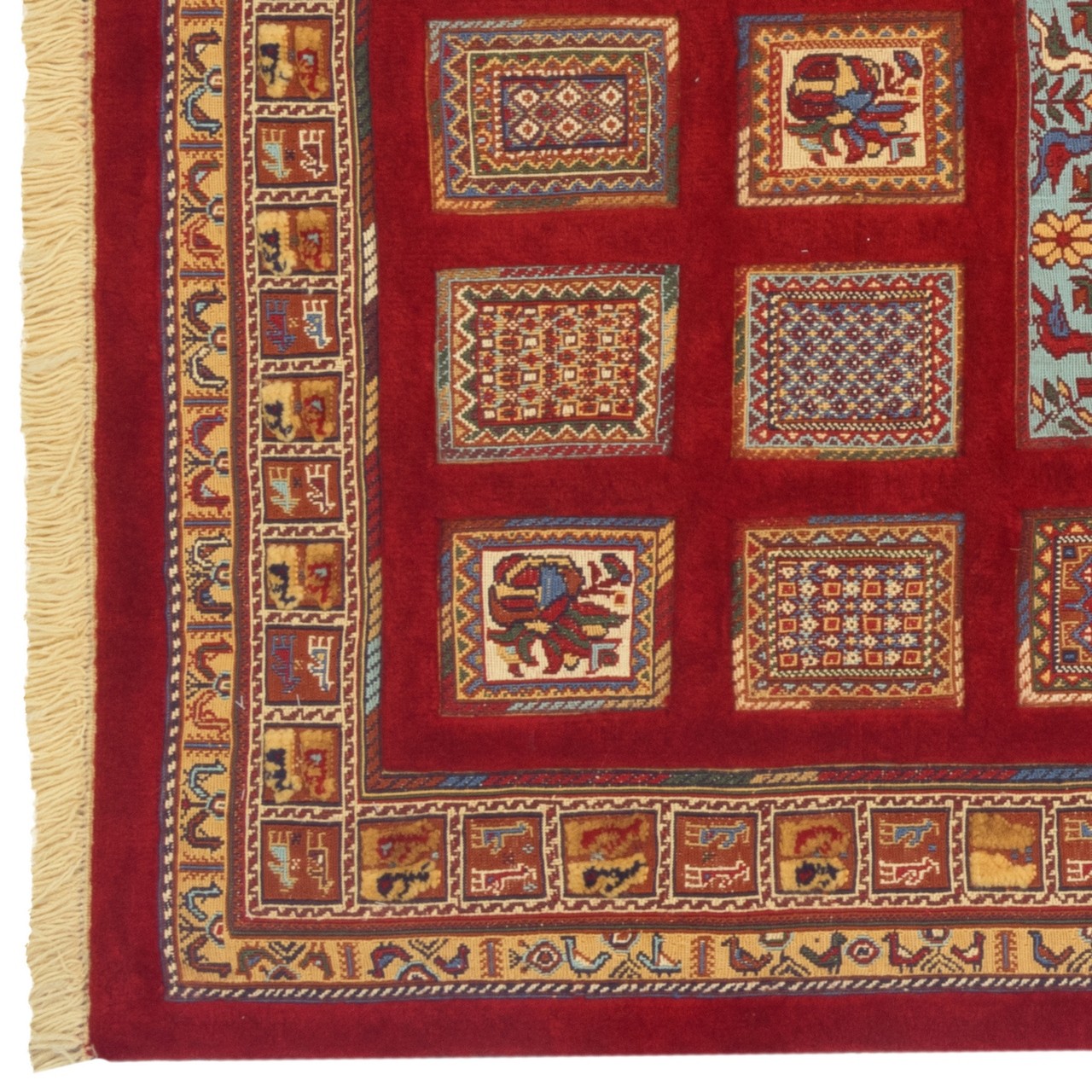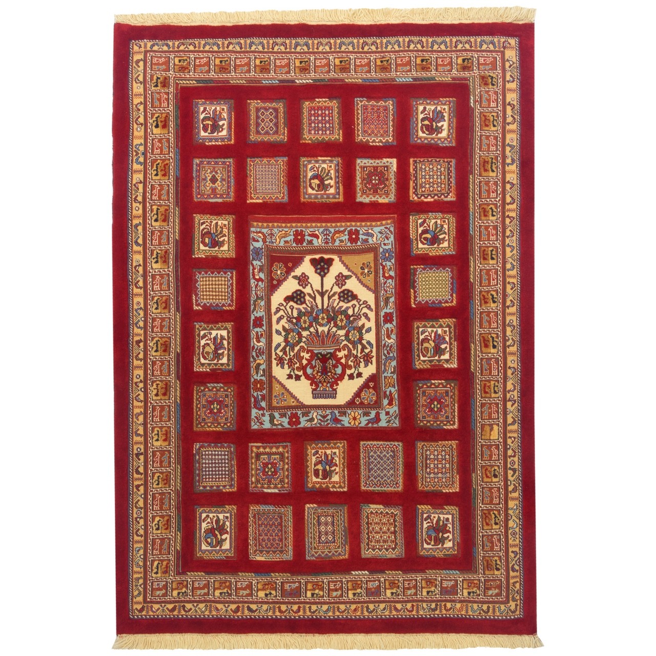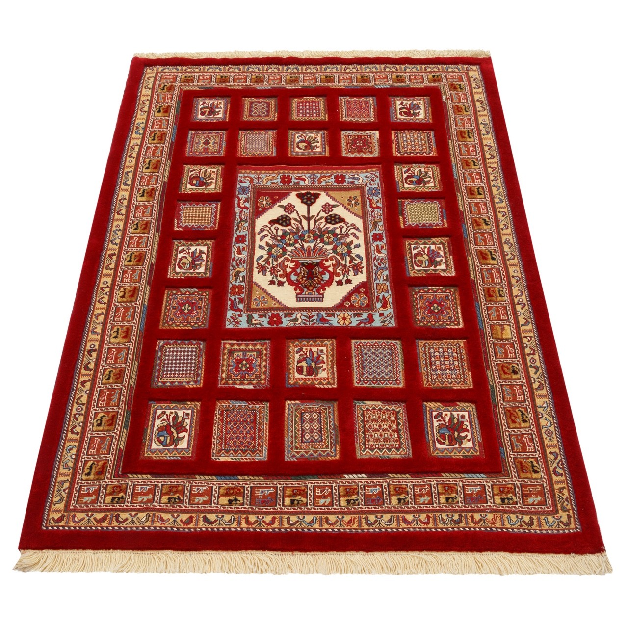 تأتي هذه الكِليم السيرجانية اليدوية بتصميم خشتي (مُقسَّم) بقياس 112 × 160 سم (3'8" × 5'3") وبمساحة 1.8 م² (19.38 قدم²). منسوجة من صوف بالكامل ببنية متجانسة ومتينة، وتتمتّع بكثافة نسج تقارب 3,200 عُقَد/دسم². يبدو تصميم الخشتي ببنيته المنتظمة والمؤطَّرة كحديقةٍ متخيَّلة، تُفتح فيها كلّ خِشتة كنافذة على عالم النسّاج الداخلي. وقد صيغت الأشكال الهندسية داخل المربّعات بعناية وذوق لتقدّم تناغماً متناظراً وإيقاعاً منظّماً؛ ويتوسّط الحقل مزهرية زهور. يمنح اللون اللاكي في المتن بريقاً دافئاً عميقاً يضفي على القطعة أصالة، فيما تصنع الحاشية بلونٍ نحاسي أجواءً دافئة وأليفة. ويوفّر هذا التباين اللوني اللطيف خياراً مميزاً للديكورات التي تتضمن عناصر خشبية ودرجات ترابية والأجواء التقليدية.