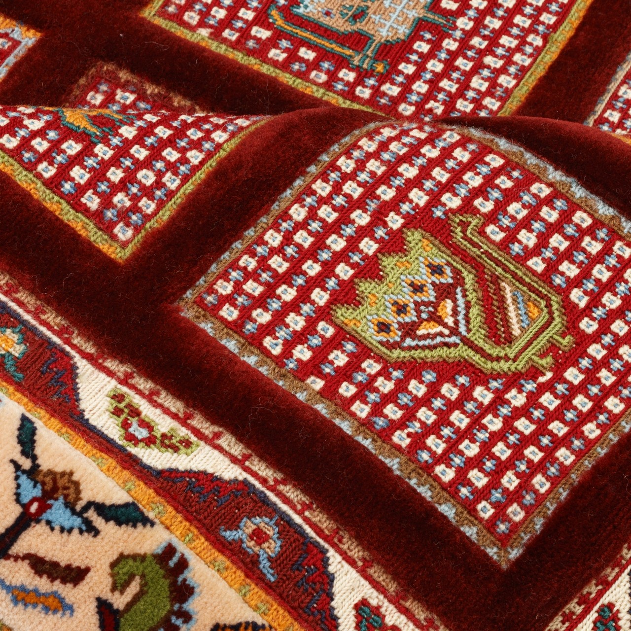 هذا الكليم اليدوي من سيرجان بمقاس ١١٦ × ١٦٠ سم (٣'١٠" × ٥'٣") وبمساحة ١٫٨٦ م² (٢٠٫٠٢ قدم²). نُسج في سيرجان من صوف بالكامل، وتبلغ كثافة النسج نحو ٣٬٢٠٠ عُقَد/دسم². يعتمد تصميمه الخشتي على بنية منتظمة ومتكررة مستوحاة من العمارة الإيرانية التقليدية. يمنح اللون الزرشكي في المتن إحساسًا بالأصالة والوقار، فيما يوفّر الإطار بالنغمة النخودية توازنًا لطيفًا بين الحركة والسكون. يُعد هذا الكليم اختيارًا واعيًا وفنيًا يلائم المساحات من البيوت التقليدية إلى الديكورات العصرية.
