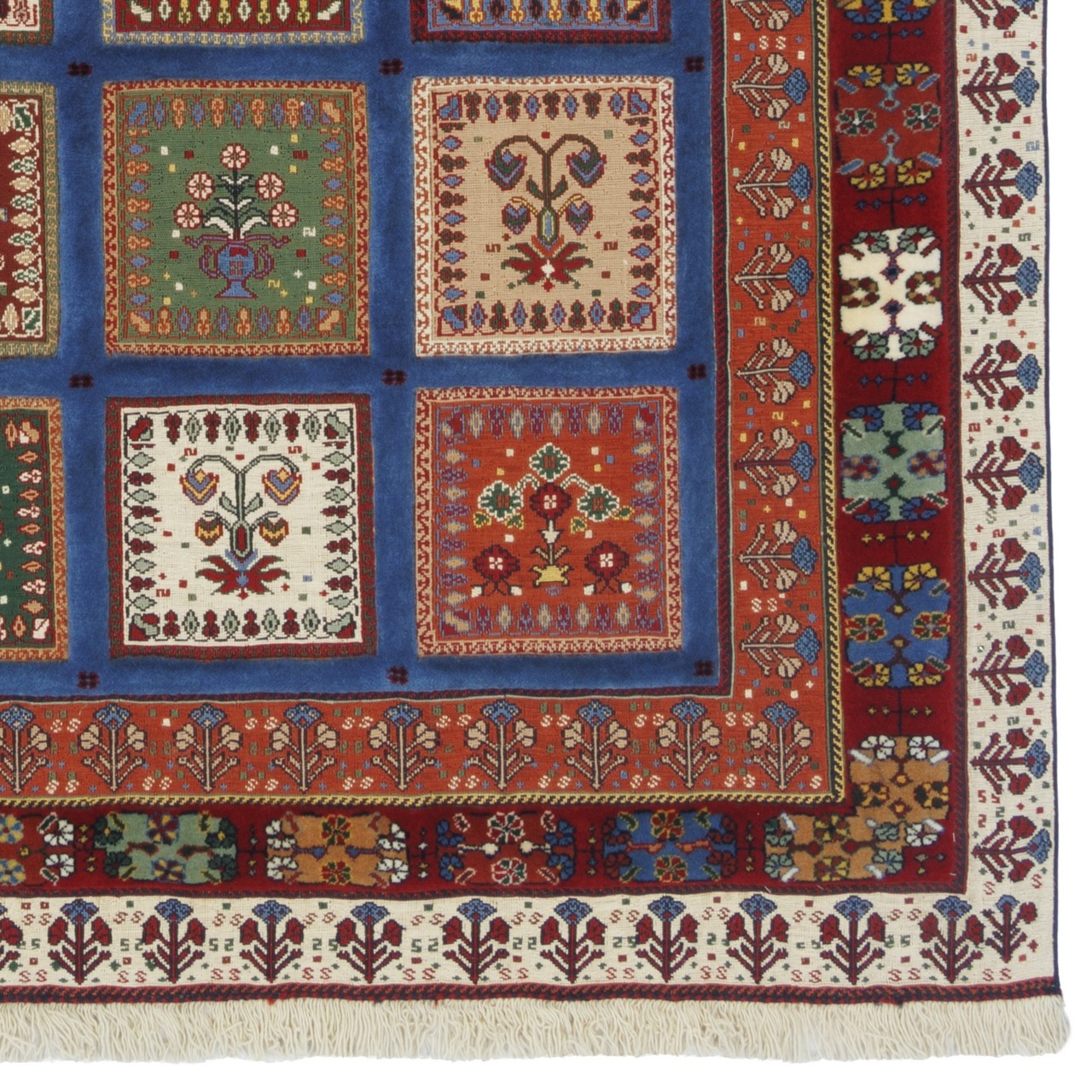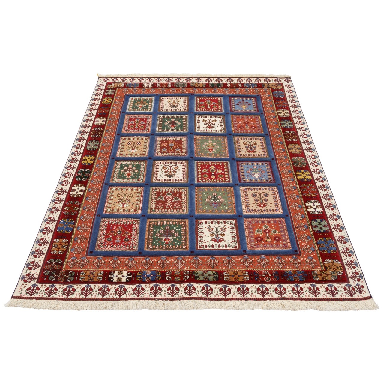 هذا گليم-فرش يدوي من سيرجان بمقاس 150 × 200 سم (4'11" × 6'7") ومساحة 3 م² (32.29 قدم²)، بتصميم خشتي. تُقدَّر كثافة النسج بنحو 3,200 عُقَد/دسم²، وهو مصنوع بصوف بالكامل. يعكس تصميم الخشتي، بقاباته المتناظرة ونظامه الهندسي، إحساسًا بالتماسك والتوازن وتكرارًا فنيًّا محسوبًا. في هذا العمل، تتألّف كل خَشْتة من نقوش هندسية تُجسّد الجمال ببساطتها. يمنح الحقل الأزرق عمقًا وهدوءًا للمشهد، فيما يوفّر الإطار اللاكي توازنًا لونيًا لطيفًا وذا أثر بصري واضح. منسوج من صوف طبيعي عالي الجودة، فيقدّم دفئًا ونعومةً ومتانةً في قطعة واحدة. إنه ليس مجرد بساط عملي، بل عمل فنّي وثقافي أيضًا.