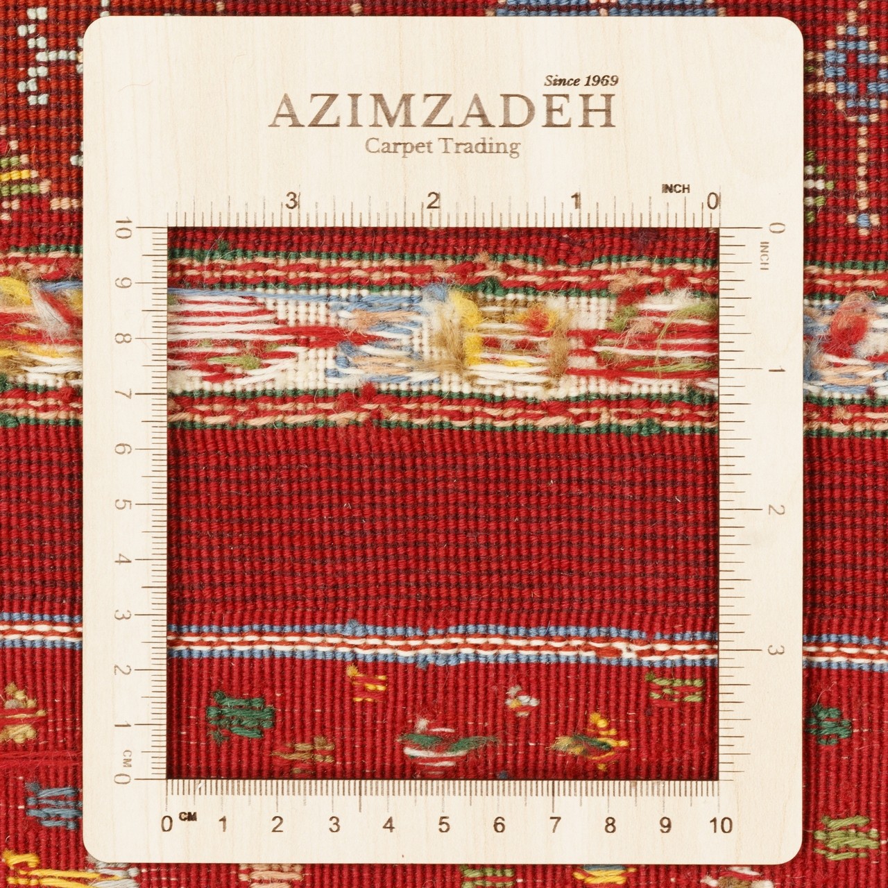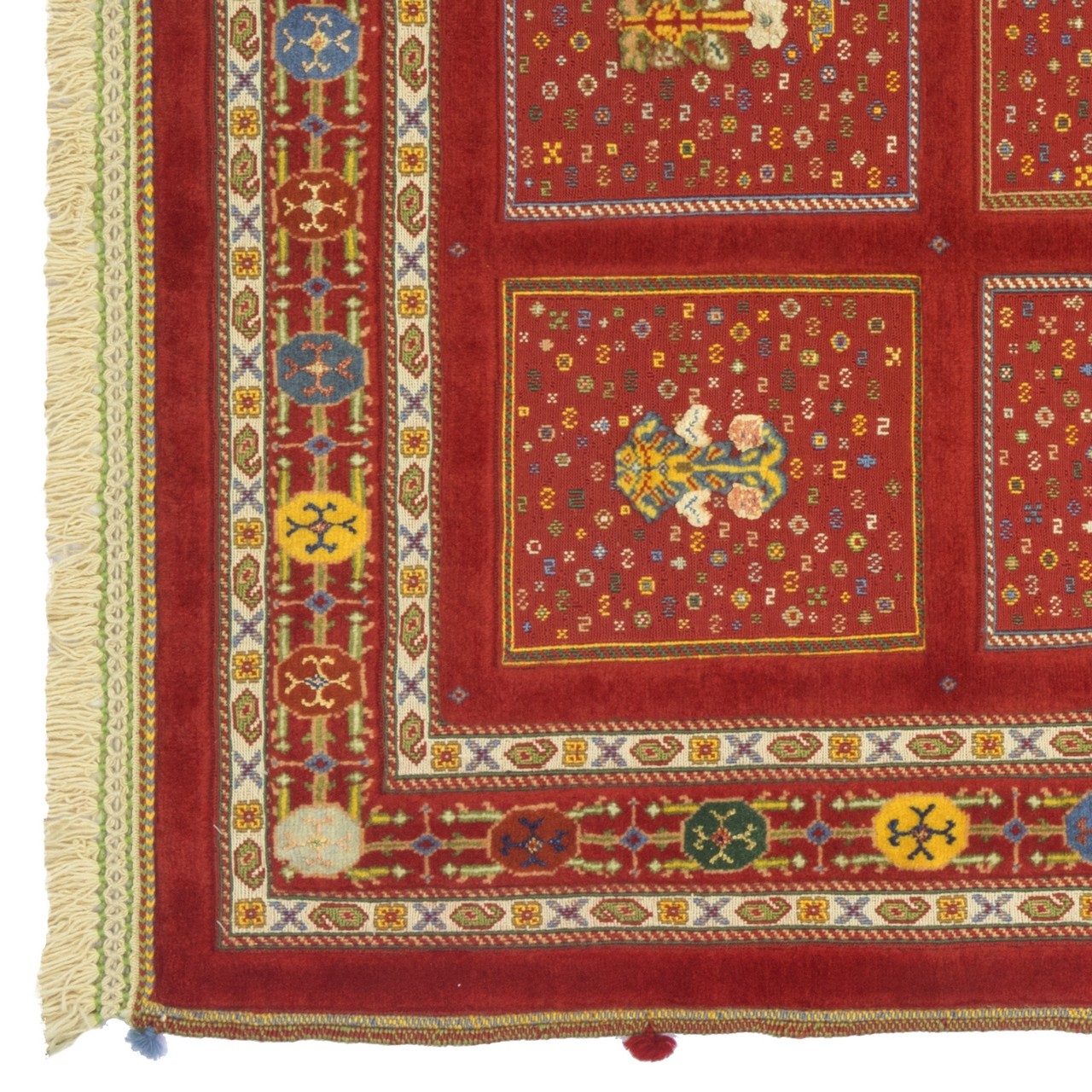 تبلغ أبعاد هذه الكِليم-السجادة اليدوية بتصميم خشتي (مُقسَّم) 80 × 145 سم (2'7" × 4'9") وبمساحة 1.16 م² (12.49 قدم²). نُسجت من صوف بالكامل بخيوط طبيعية وبنسج دقيق ومتجانس، وتتمتّع بكثافة نسج تقارب 3,200 عُقَد/دسم². يقدّم تصميم الخشتي بنية هندسية رمزية تتولّد فيها أشكال متناظرة ومتكرّرة تُشعر بالنظام والتوازن. وفي هذا الكِليم تبدو كلّ خِشتة—على نهج العمارة الإيرانية التي تنشد الوحدة في التعدّد وتجد المعنى في الشكل—تجسيداً لفهمٍ عميق للبنية والاتّزان والجمال. اللون اللاكي المستخدم في المتن والحاشية معاً يهب الزخارف فخامة دافئة متّقدة، ويبعث حرارةً وأُلفة في المكان، مستحضراً فنّاً إيرانياً عريقاً تتّخذ فيه الألوان معنى وهوية.