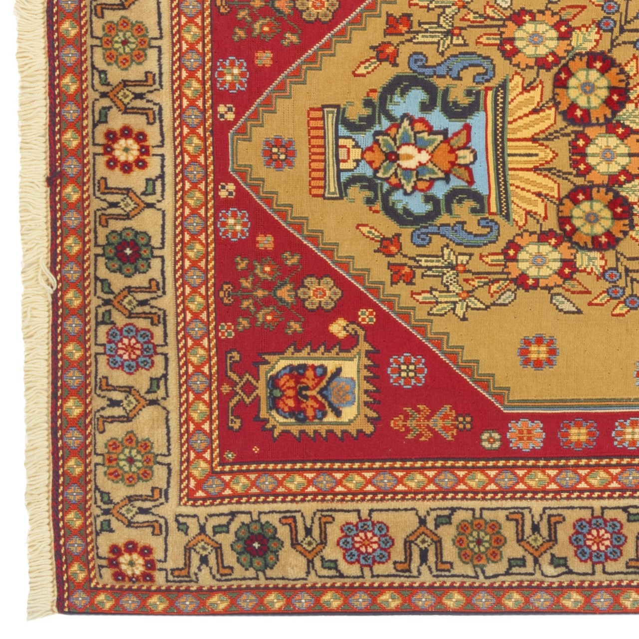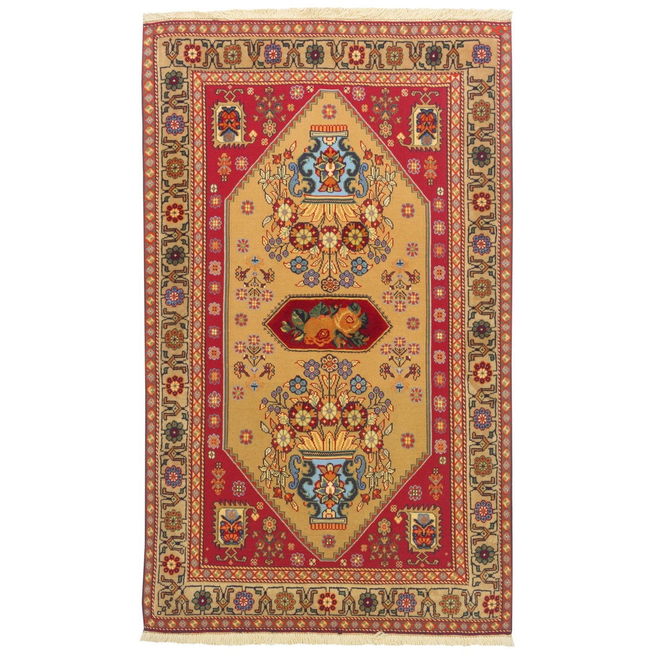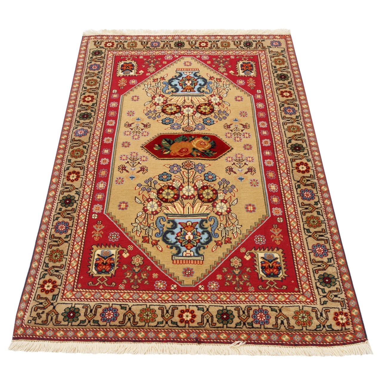 تأتي هذه الكِليم اليدوية بتصميم مزهري بقياس 86 × 142 سم (2'10" × 4'8") وبمساحة 1.23 م² (13.24 قدم²). منسوجة من صوف بالكامل بسبك دقيق ومتجانس، وتتمتّع بكثافة نسج تقارب 2,500 عُقَد/دسم². يُعدّ التصميم المزهري من الأنماط المحبّبة في فنون السجاد والكِليم الإيراني؛ إذ تمثل المزهرية هنا رمزاً للحياة والنموّ والجمال، وتتربّع على أرضية بلون نخودي. وتستحضر الأزهار—المستمدة من الزخرفة النباتية التقليدية—روح الطبيعة وبستاناً فارسياً داخل المنزل. إن استخدام اللون النخودي في المتن والحاشية معاً يمنح حضوراً هادئاً ومحايداً ولطيفاً، ويتيح للنقوش والأشكال أن تتألّق بهدوء. ويضمن الصوف بالكامل جودة باقية ودفئاً طبيعياً؛ فإلى جانب المتانة يضفي الصوف ملمساً ناعماً محبّباً. وتحمل هذه الكِليم رسالةً من الجمال والحياة والجذور الثقافية لفن الكِليم الإيراني.