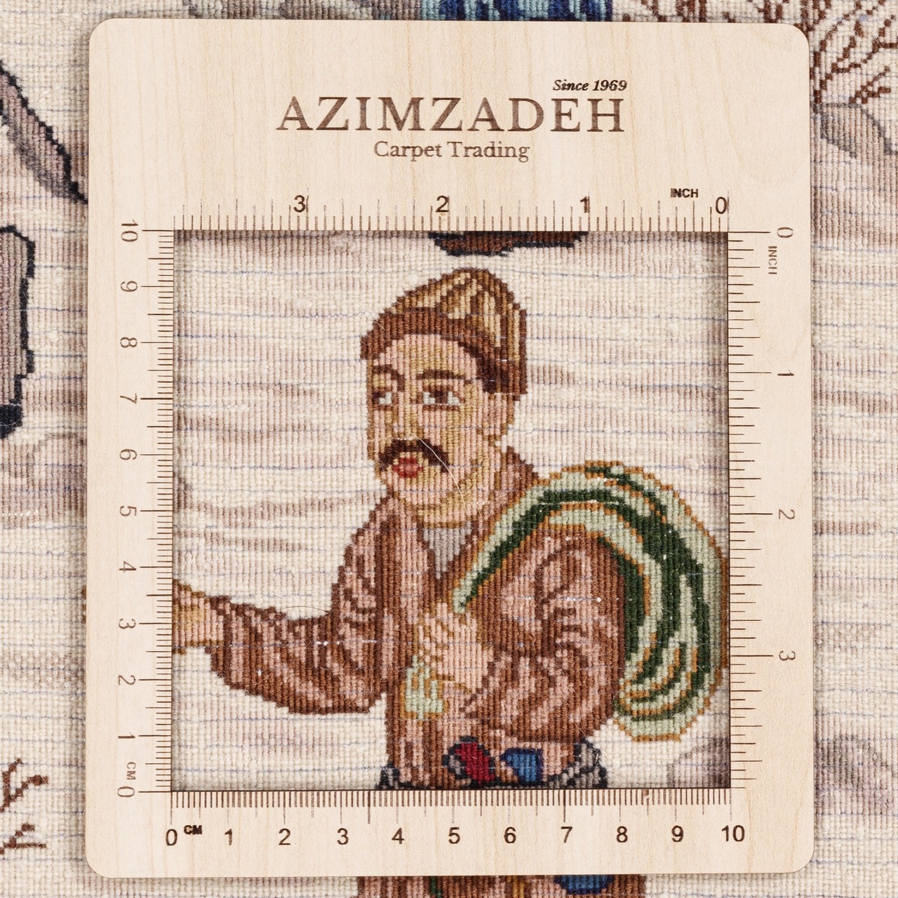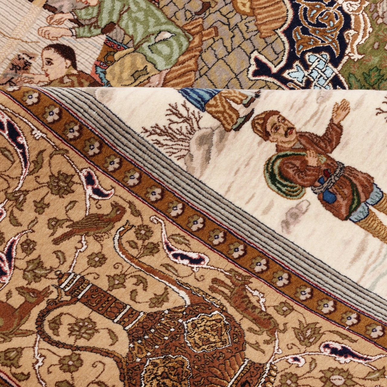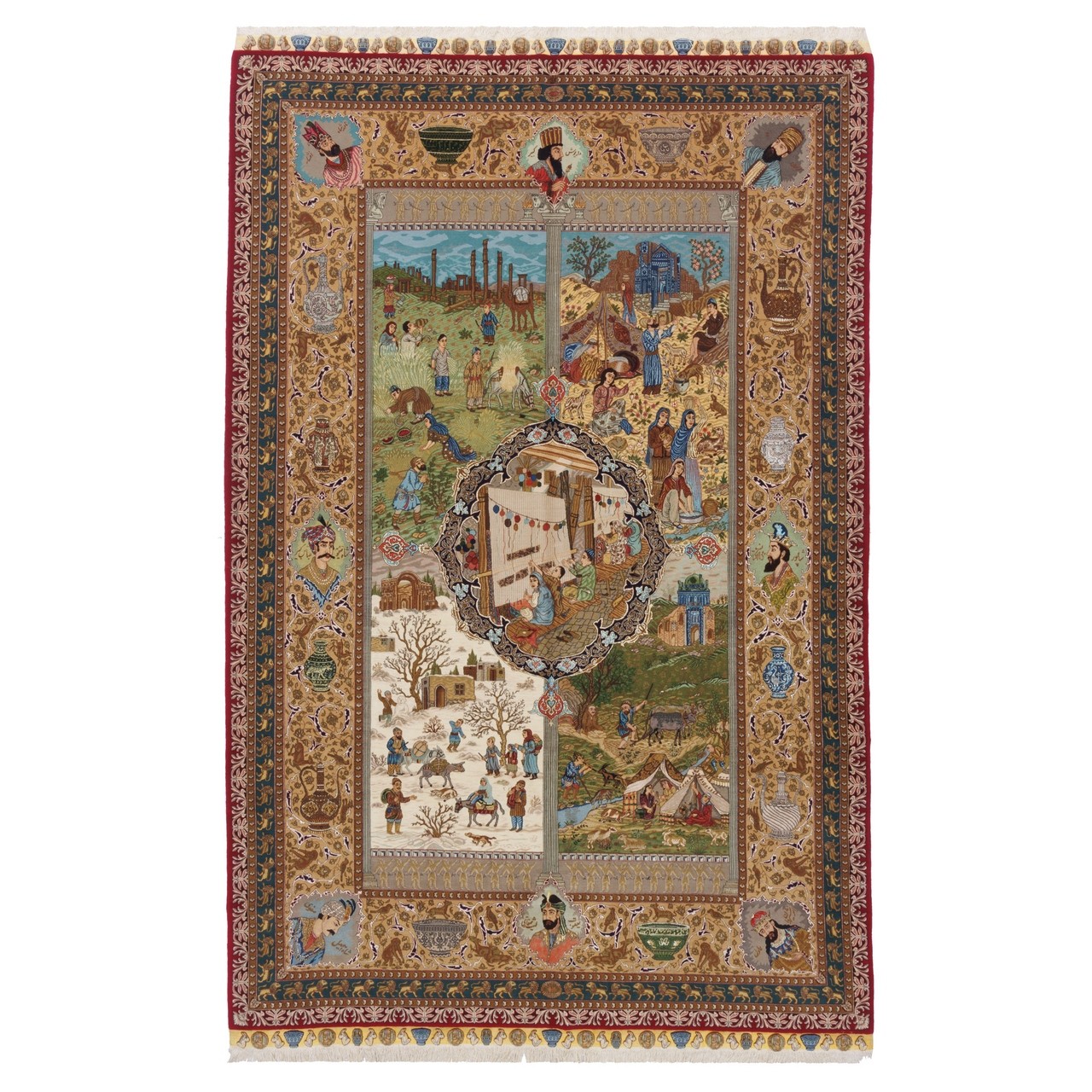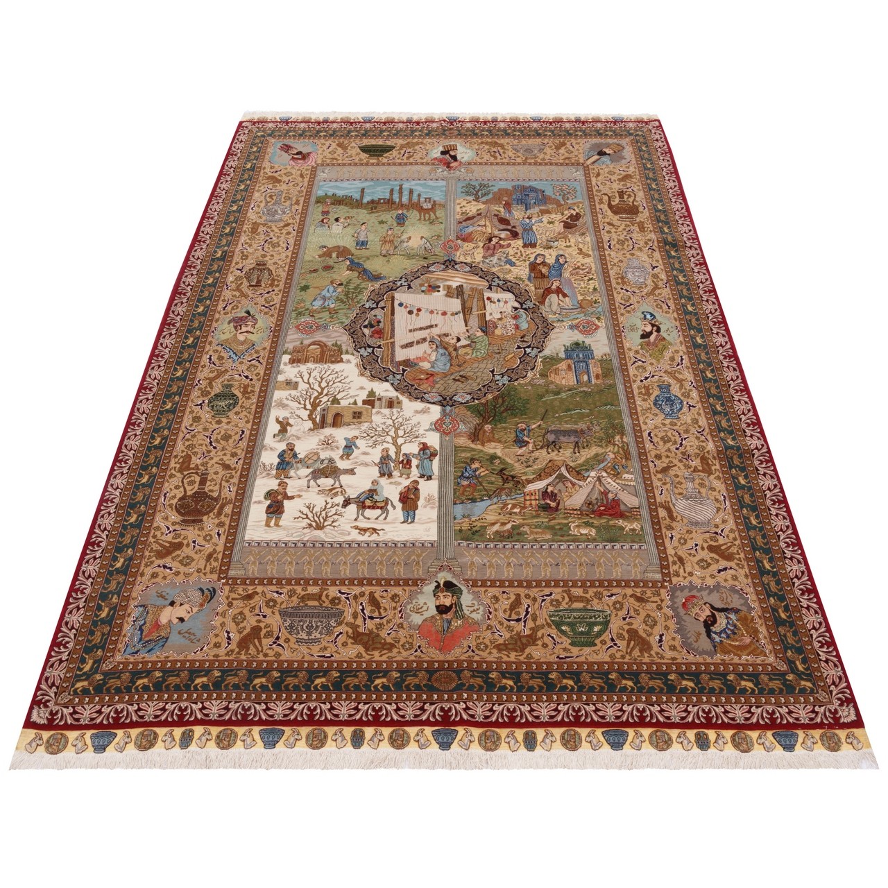 هذه السجادة اليدوية القديمة ذات التصميم الممتد والنقش التصويري، من علامة فرش «تقي‌پور»، تحتضن رؤية شعرية وفنية لموضوع «الفصول الأربعة». تأتي بمقاس 207 × 312 سم (6'9" × 10'3") وبمساحة 6.46 م² (69.53 ft²)، وكثافة تقارب 7,300 عُقَد/دسم²؛ لتغدو قطعة بارزة لردهات العرض أو الفضاءات الفنية التي تُمنح فيها لكل عنصر دلالة خاصة. استخدام لمسات حرير مع سدى حريري أكسب السجادة ملمساً ناعماً ولمعاناً رقيقاً؛ فتبدو الألوان نابضة بالحياة تحت الضوء بوهج حريري أنيق. يتجسد موضوع الفصول الأربعة—من تفتّح الربيع إلى تساقط أوراق الخريف وبياض الشتاء—بانسجام تام مع أرضية متعددة الألوان وإطار بلون بيج، في توليفة هادئة وعذبة وغنية باللطافة، تدعو المتلقي للتأمل في إيقاع الزمن. هذه السجادة ليست مجرد عنصر تزييني؛ بل تقويم فني صامت لدورة الطبيعة، وحافظة للحظات وفصول، لكلٍّ منها قصتها الخاصة.